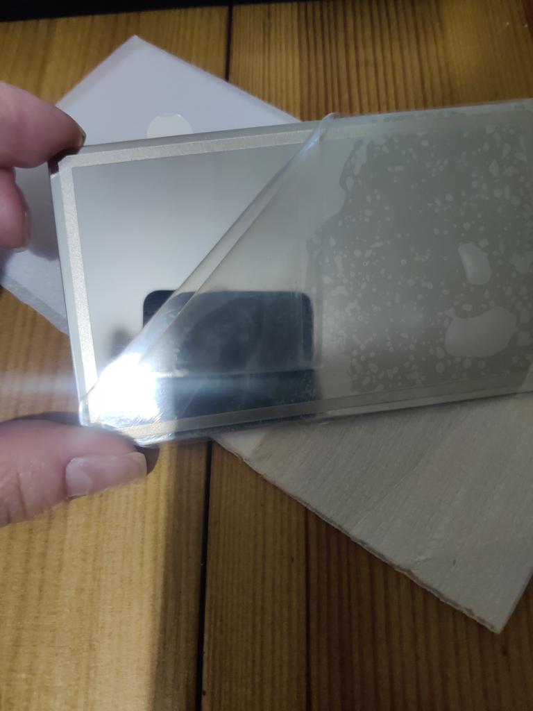 Lo specchio è arrivato. Molto ben fatto. La mamma cammina lungo il perimetro. Sul retro è presente del materiale adesivo. Pellicola protettiva sulla parte anteriore