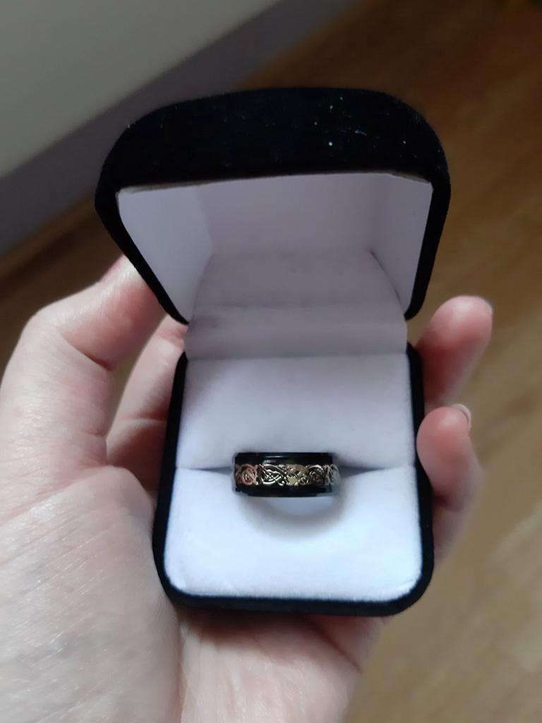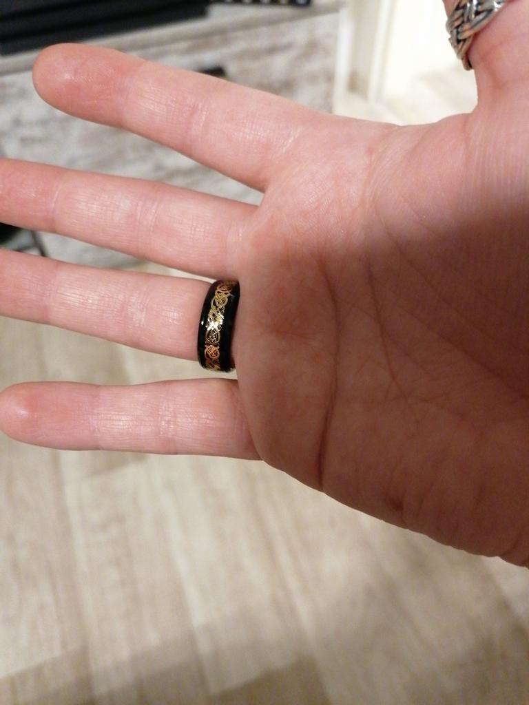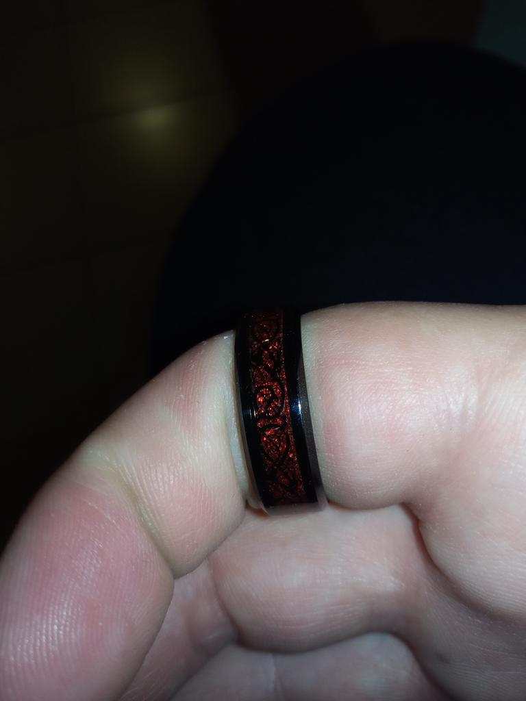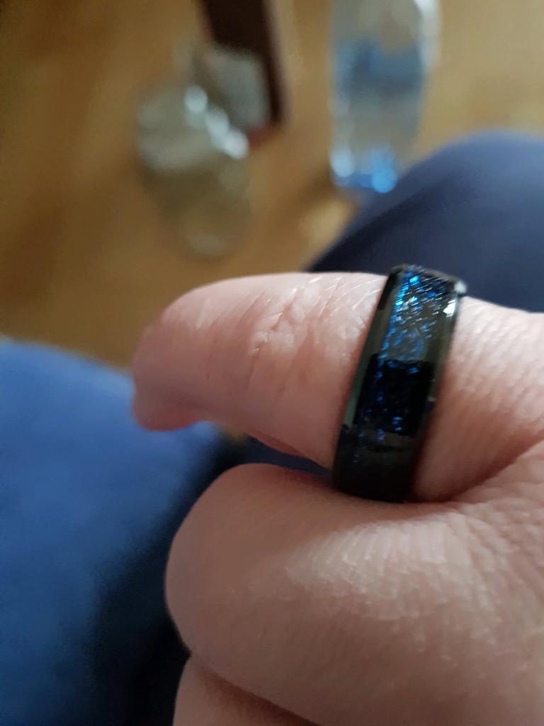 Un anello stupendo ma maschile con bei dettagli :) L'ho preso in una taglia 10 per l'anulare di mio marito e si adatta perfettamente. Molto liscio e confortevole 👍 I dettagli argentati delle curve avvolgono l'intero lato esterno dell'anello e il resto dell'anello è nero :) Ho ricevuto questo prodotto in 17 giorni dal negozio YW SCIONE Watch.