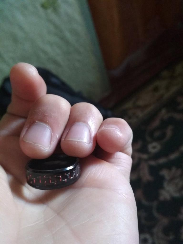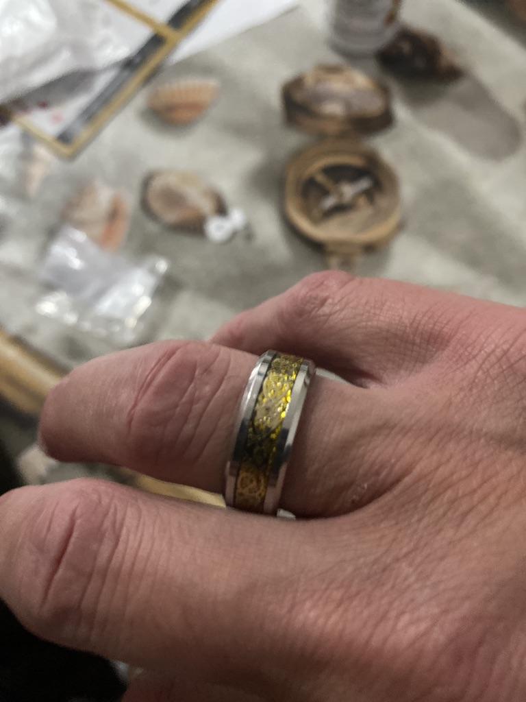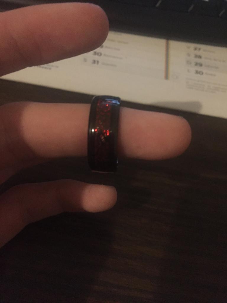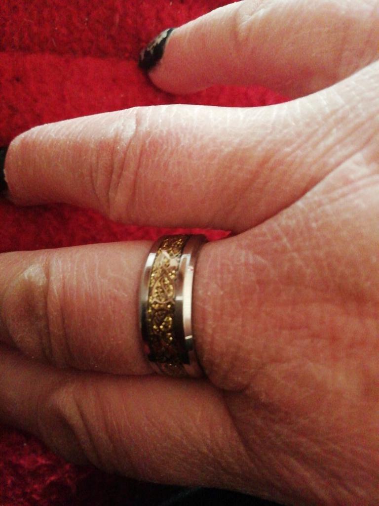 Un anello stupendo ma maschile con bei dettagli :) L'ho preso in una taglia 10 per l'anulare di mio marito e si adatta perfettamente. Molto liscio e confortevole 👍 I dettagli argentati delle curve avvolgono l'intero lato esterno dell'anello e il resto dell'anello è nero :) Ho ricevuto questo prodotto in 17 giorni dal negozio YW SCIONE Watch.