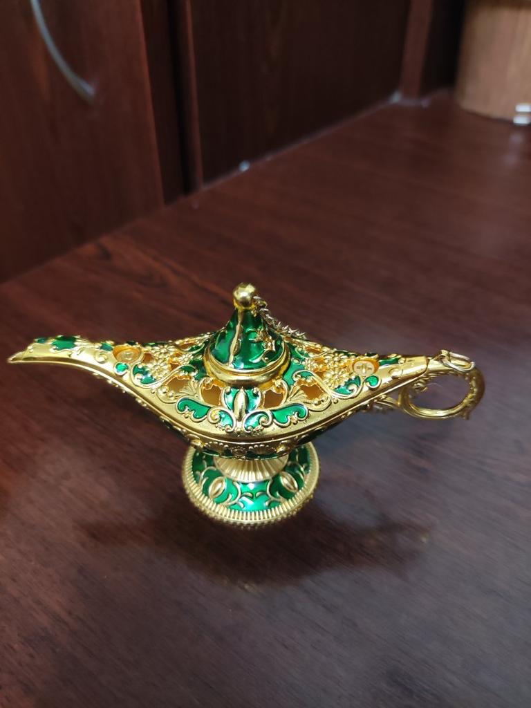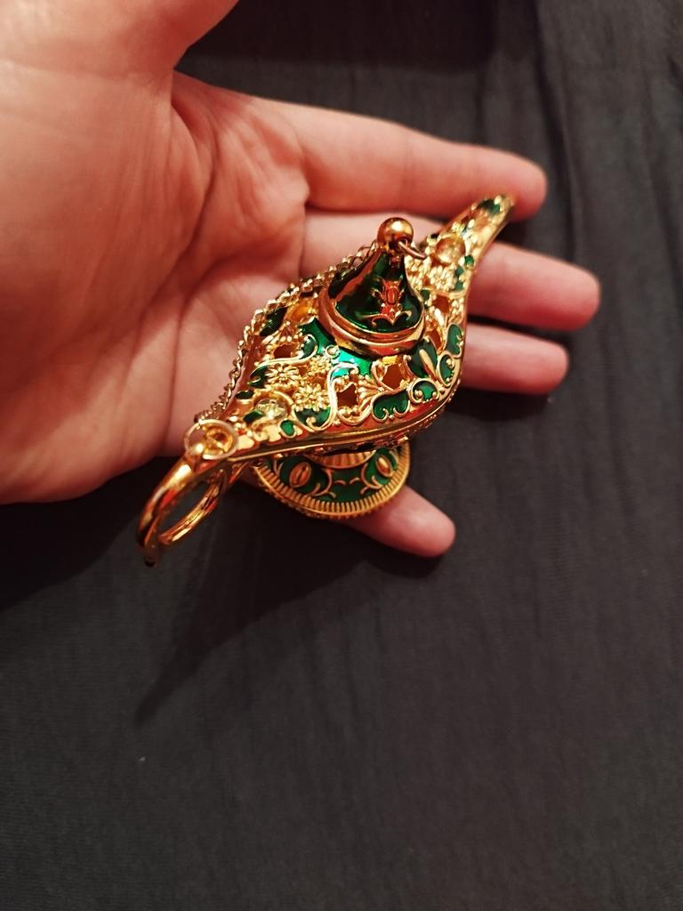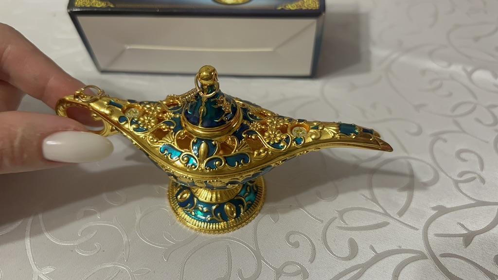 Ho ordinato la merce il 26 settembre e l'ho ricevuta il 19 ottobre. La lampada Aladin 🧞♂️è stata imballata in una piccola scatola, un po' piegata, ma ancora integra. È davvero piccolo, quasi troppo piccolo. Tuttavia, sta bene e questa è la cosa principale ☺ La macchia turchese è un riflesso del mio top😅🎽