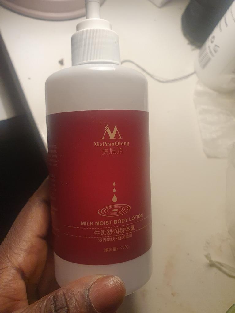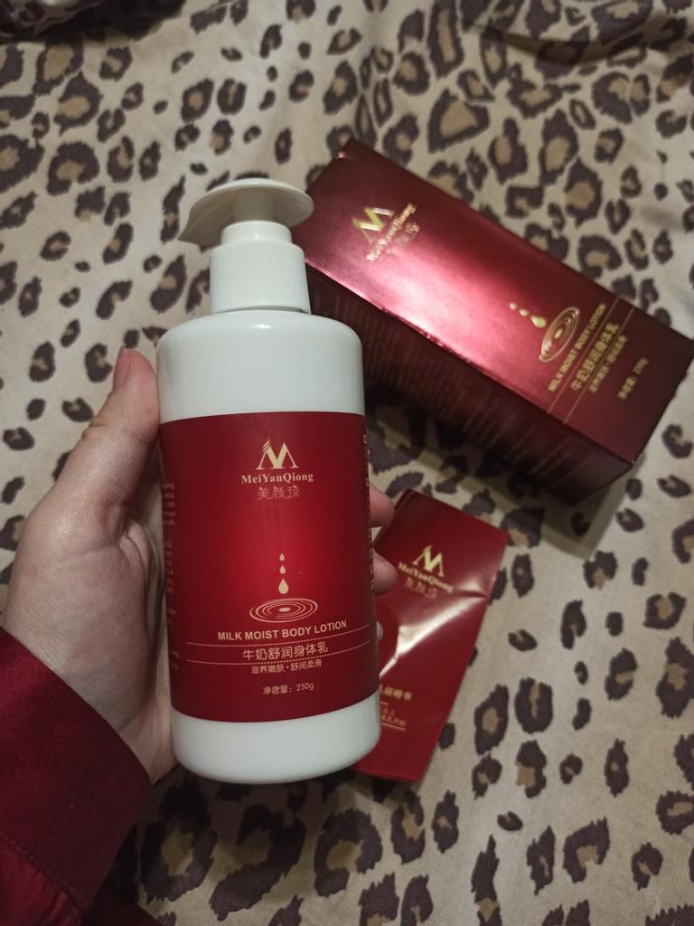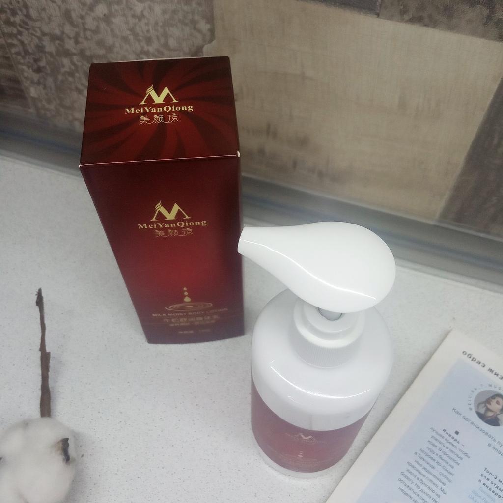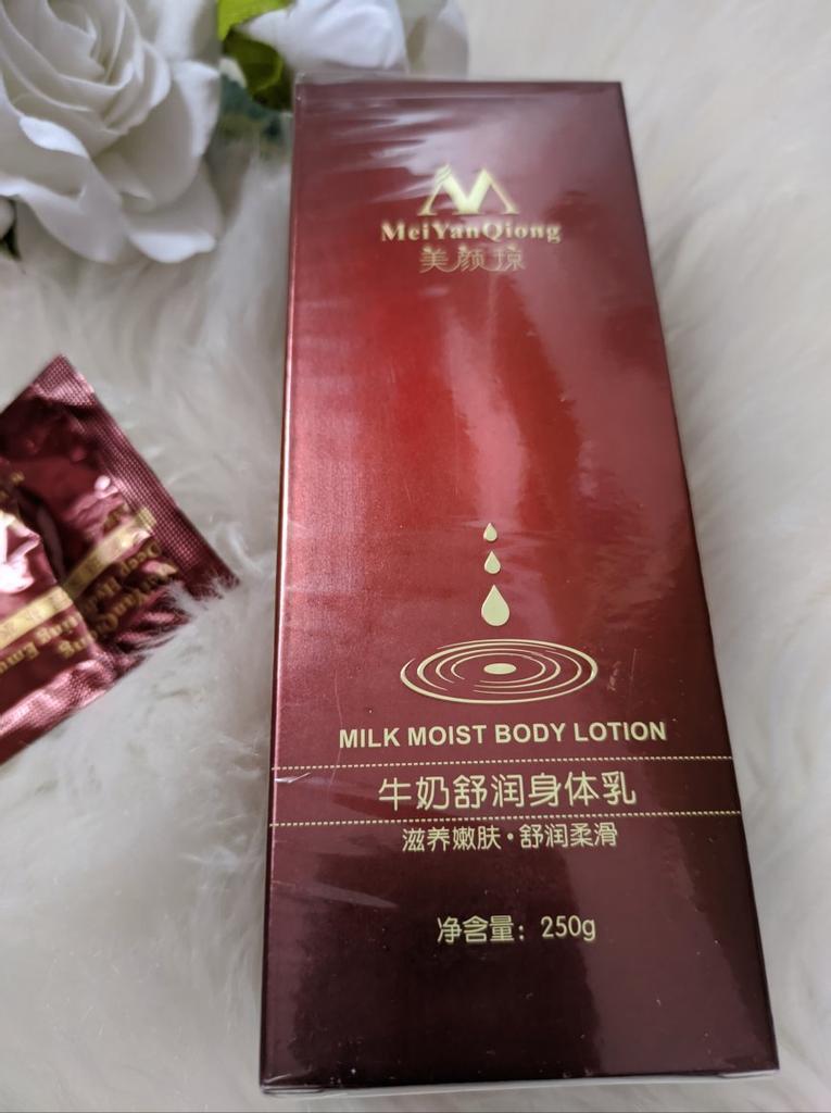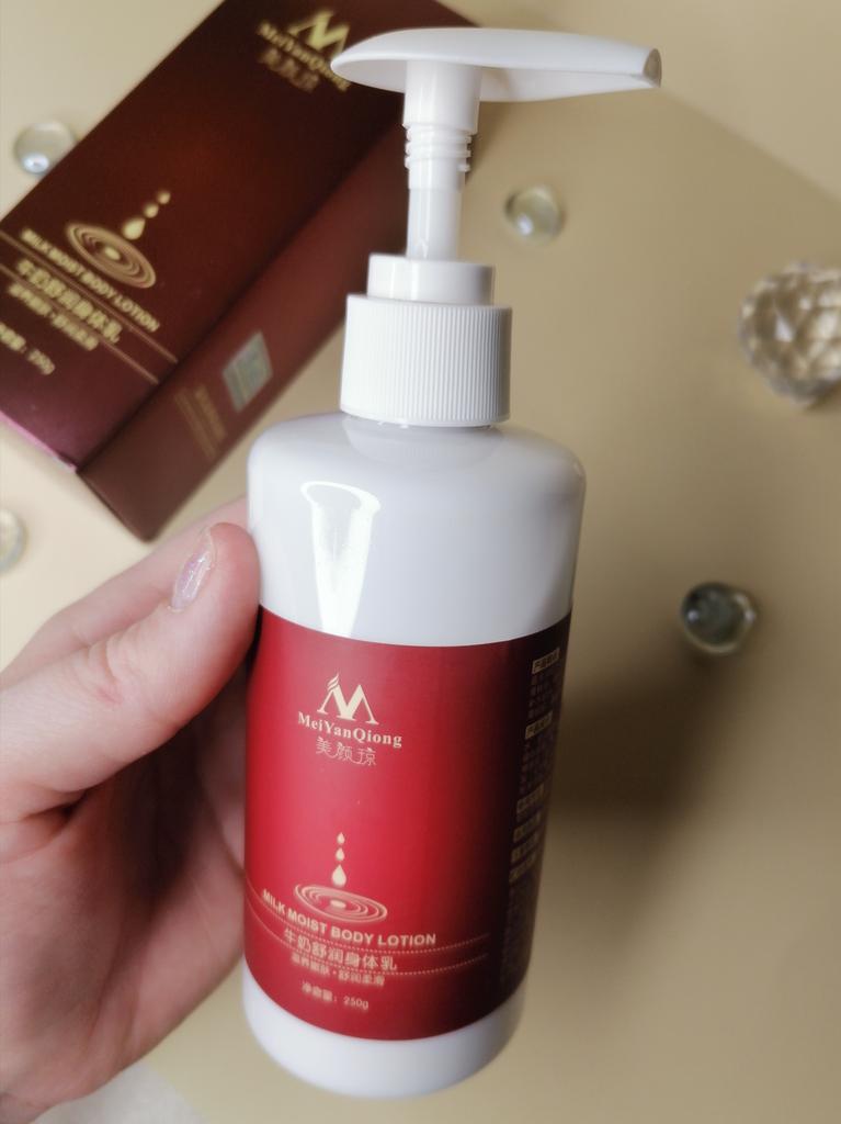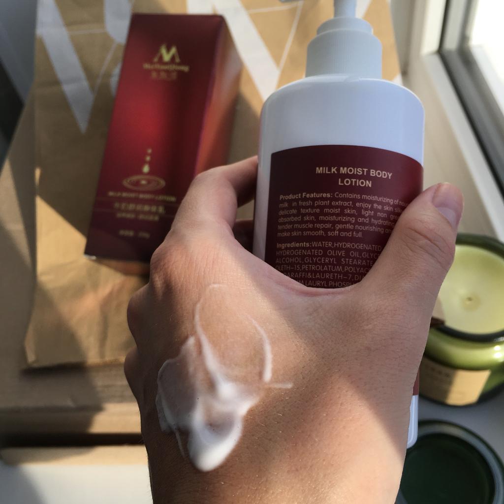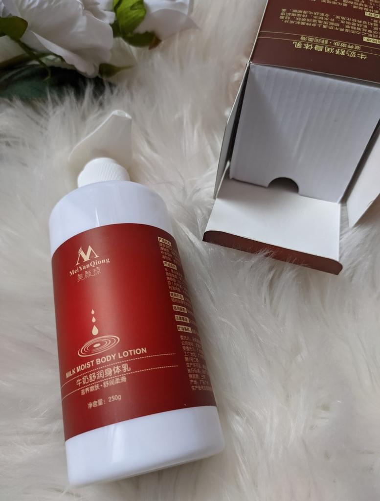 Lozione per il corpo Marca: MeiYan Qiong ⭐⭐⭐⭐⭐ Mi piacciono i prodotti di questo marchio. E questo è diventato uno dei miei prodotti preferiti tra questi. La consistenza della lozione per il corpo è così liscia come una consistenza setosa. La mia pelle lo beve letteralmente! Ha un odore molto buono come un profumo di latte. La lozione per il corpo è adatta a tutti i tipi di pelle e a tutto il corpo compreso il collo. Penso che se puoi usarlo anche per il viso se hai la pelle secca. Mi piace che il contenitore abbia il dispenser. È molto facile e igienico. L'importo netto è molto grande 250 gr.