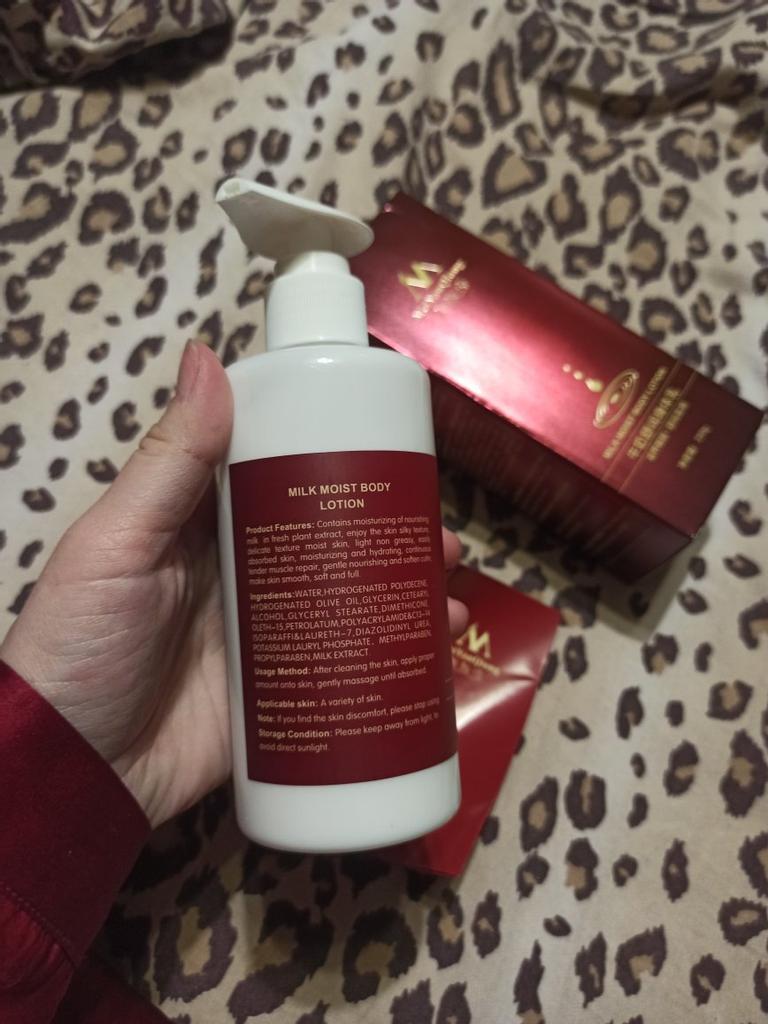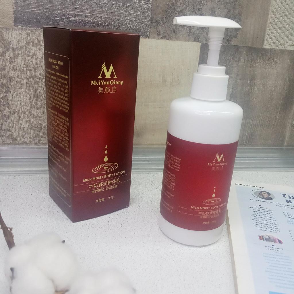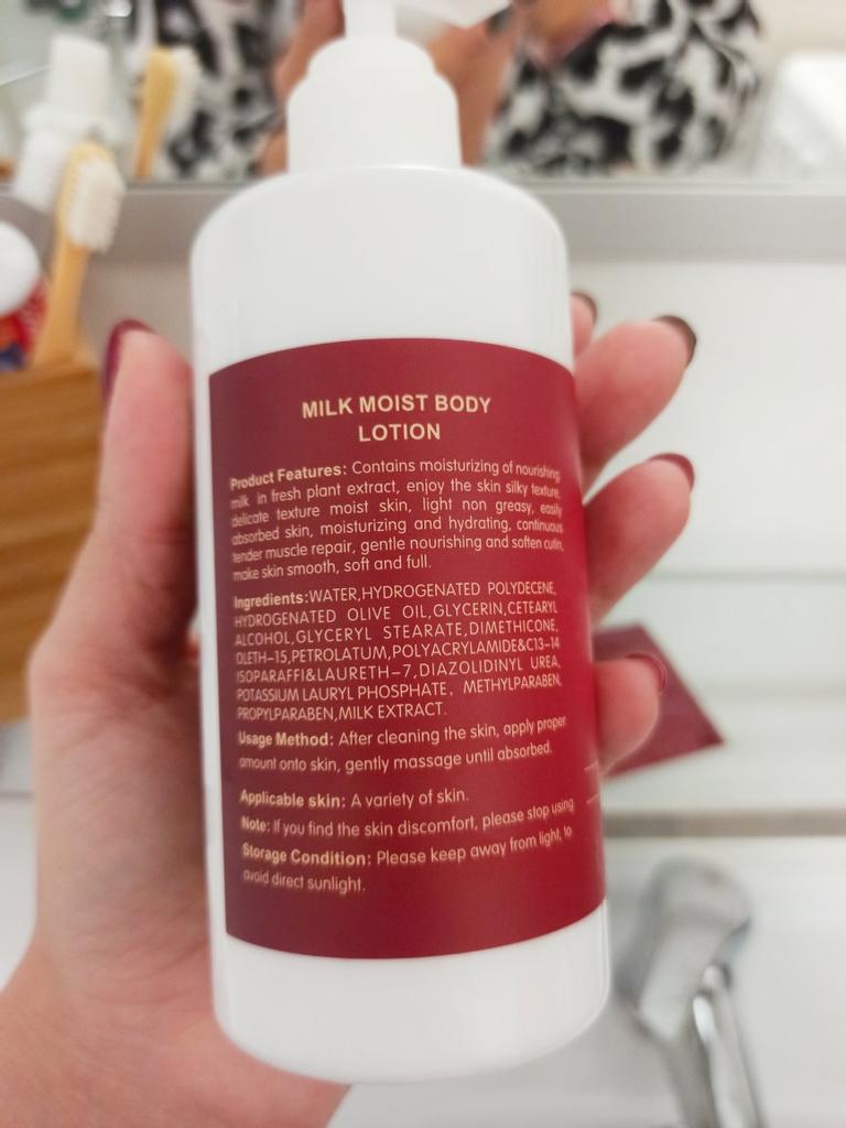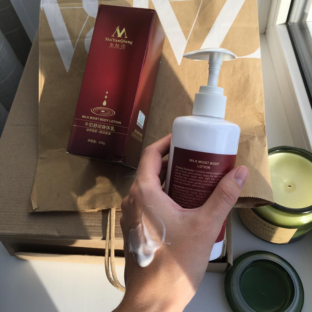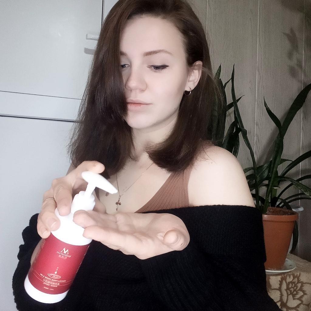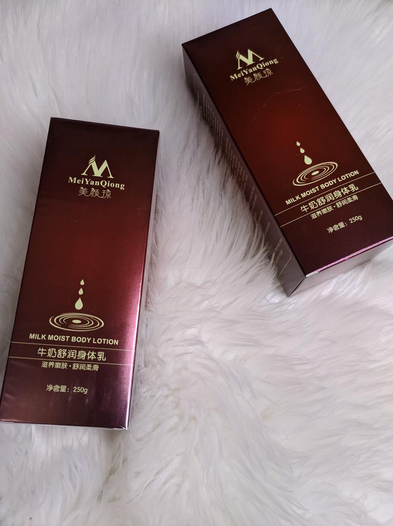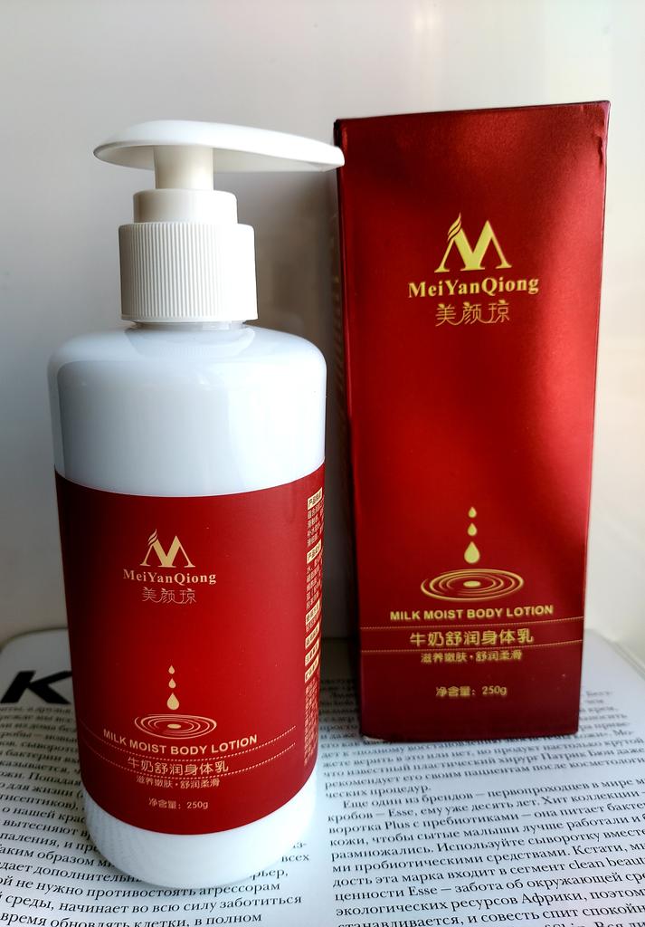 Lozione per il corpo Marca: MeiYan Qiong ⭐⭐⭐⭐⭐ Mi piacciono i prodotti di questo marchio. E questo è diventato uno dei miei prodotti preferiti tra questi. La consistenza della lozione per il corpo è così liscia come una consistenza setosa. La mia pelle lo beve letteralmente! Ha un odore molto buono come un profumo di latte. La lozione per il corpo è adatta a tutti i tipi di pelle e a tutto il corpo compreso il collo. Penso che se puoi usarlo anche per il viso se hai la pelle secca. Mi piace che il contenitore abbia il dispenser. È molto facile e igienico. L'importo netto è molto grande 250 gr.