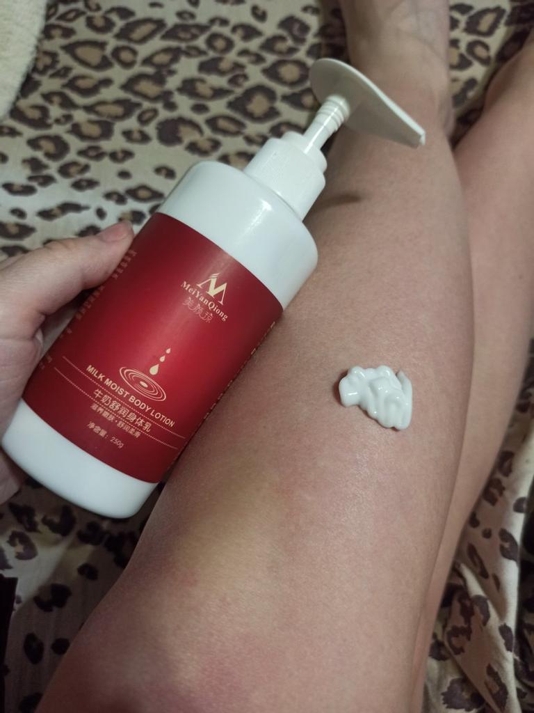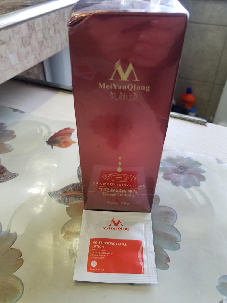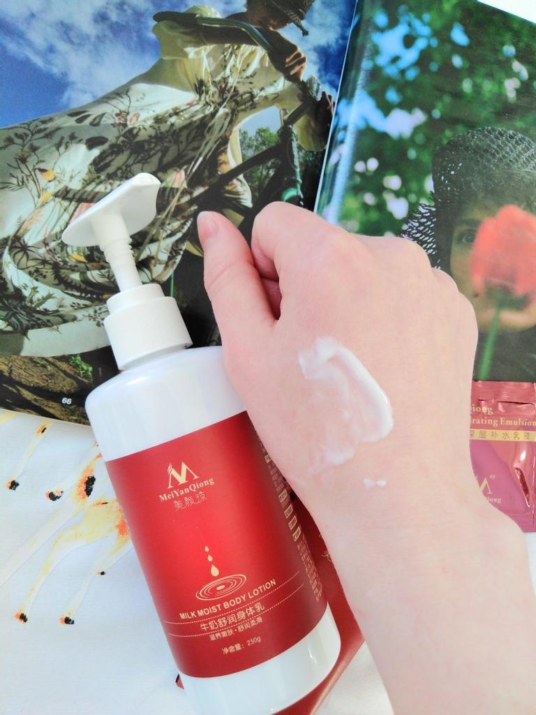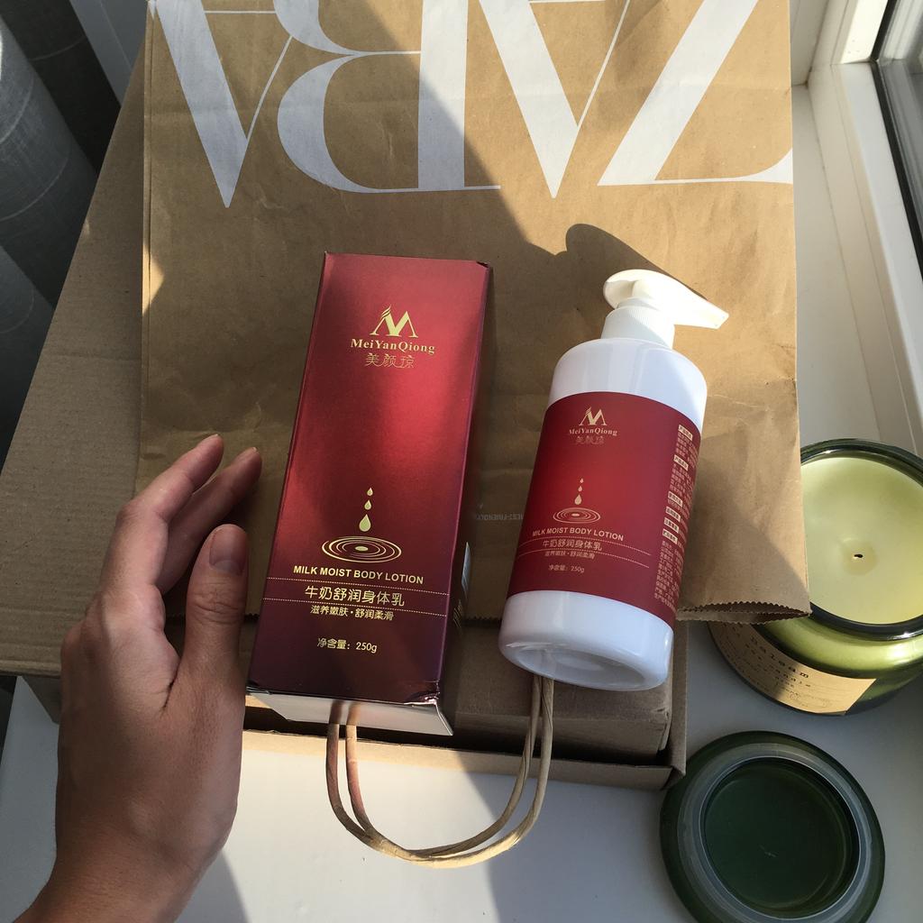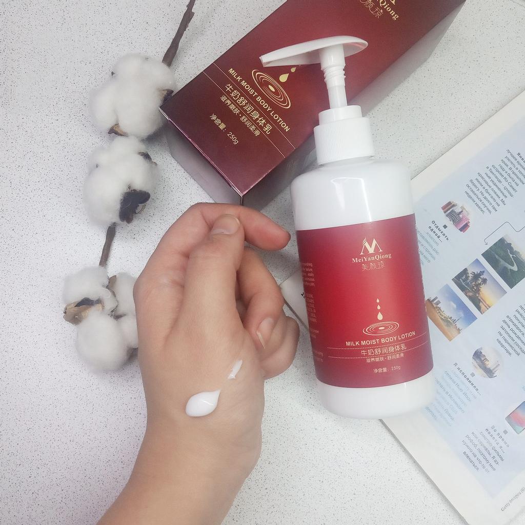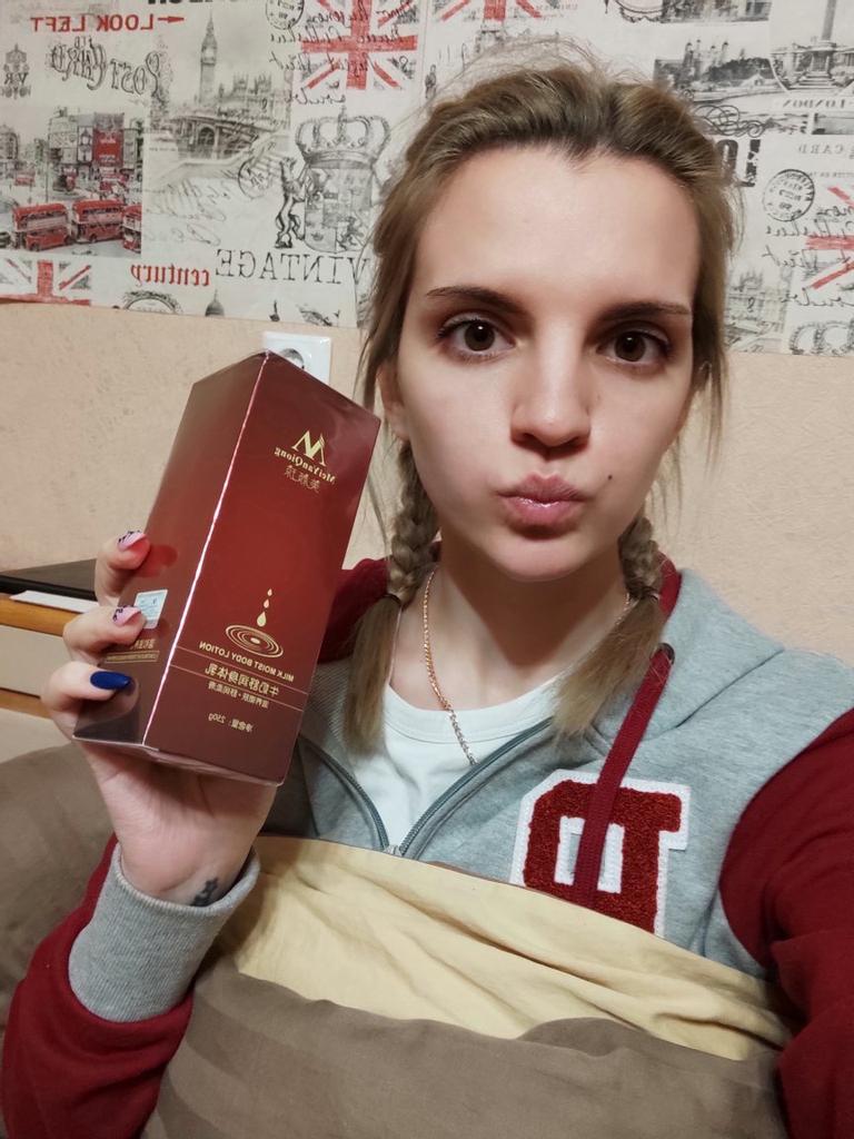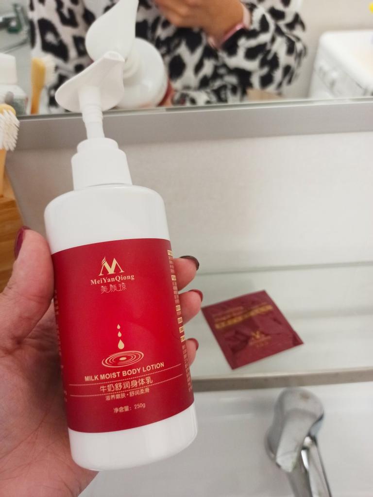 Lozione per il corpo Marca: MeiYan Qiong ⭐⭐⭐⭐⭐ Mi piacciono i prodotti di questo marchio. E questo è diventato uno dei miei prodotti preferiti tra questi. La consistenza della lozione per il corpo è così liscia come una consistenza setosa. La mia pelle lo beve letteralmente! Ha un odore molto buono come un profumo di latte. La lozione per il corpo è adatta a tutti i tipi di pelle e a tutto il corpo compreso il collo. Penso che se puoi usarlo anche per il viso se hai la pelle secca. Mi piace che il contenitore abbia il dispenser. È molto facile e igienico. L'importo netto è molto grande 250 gr.