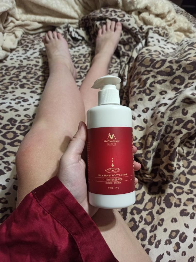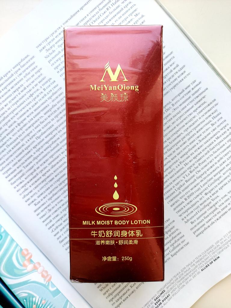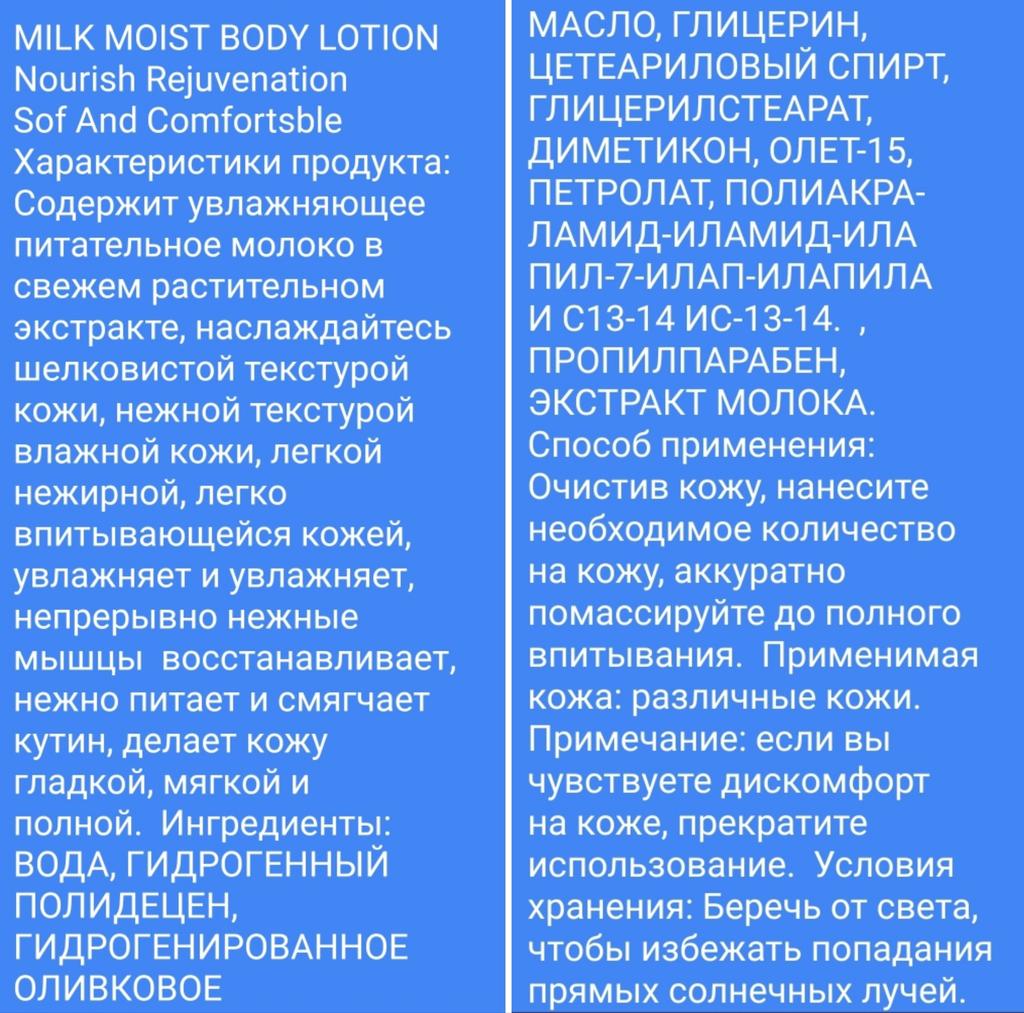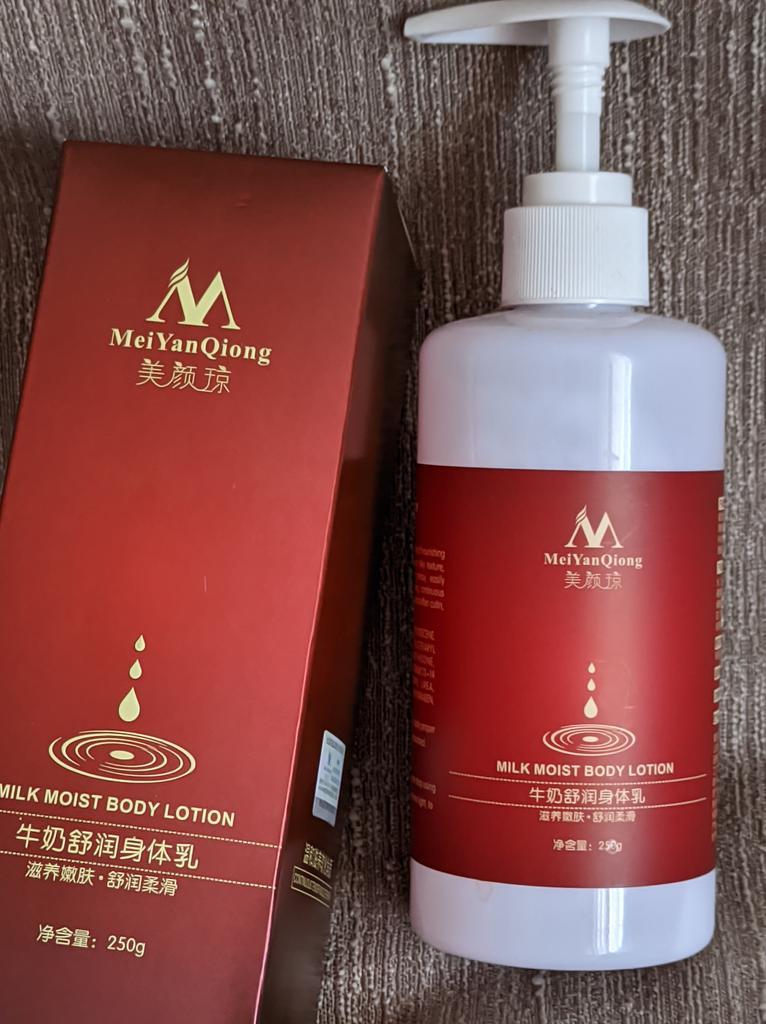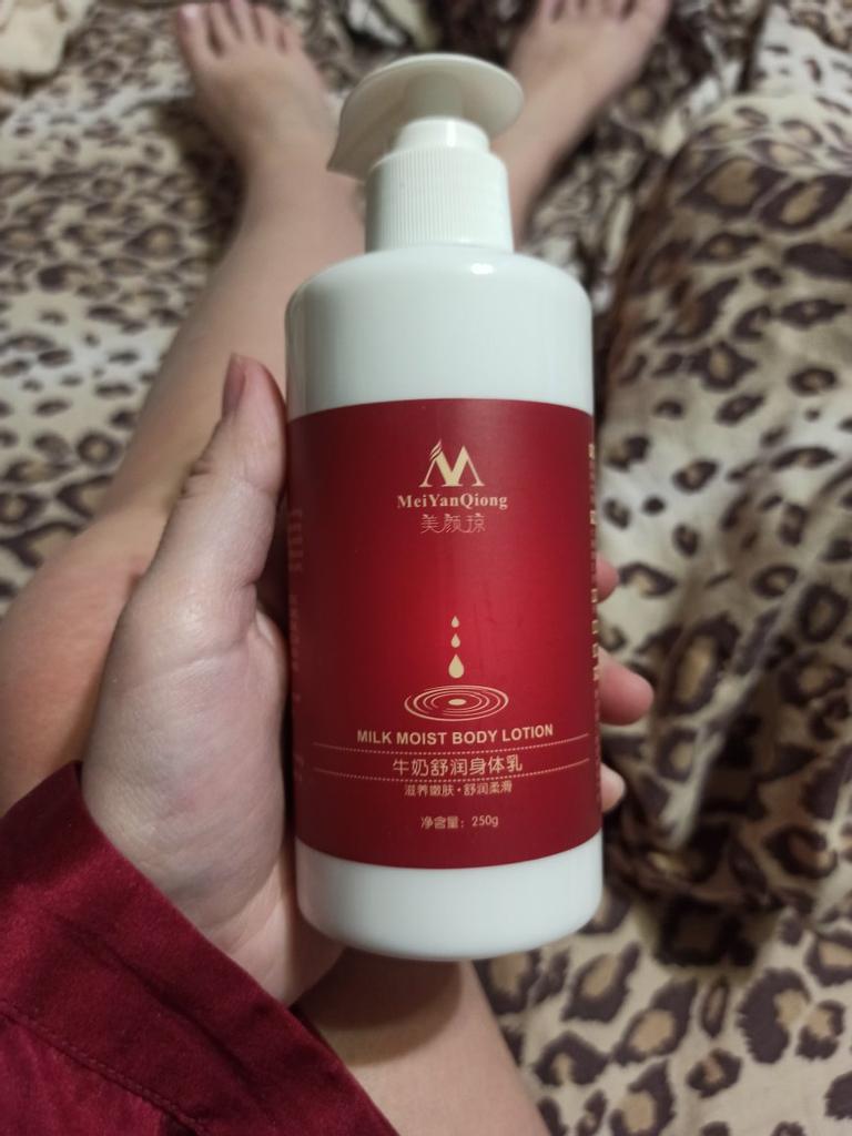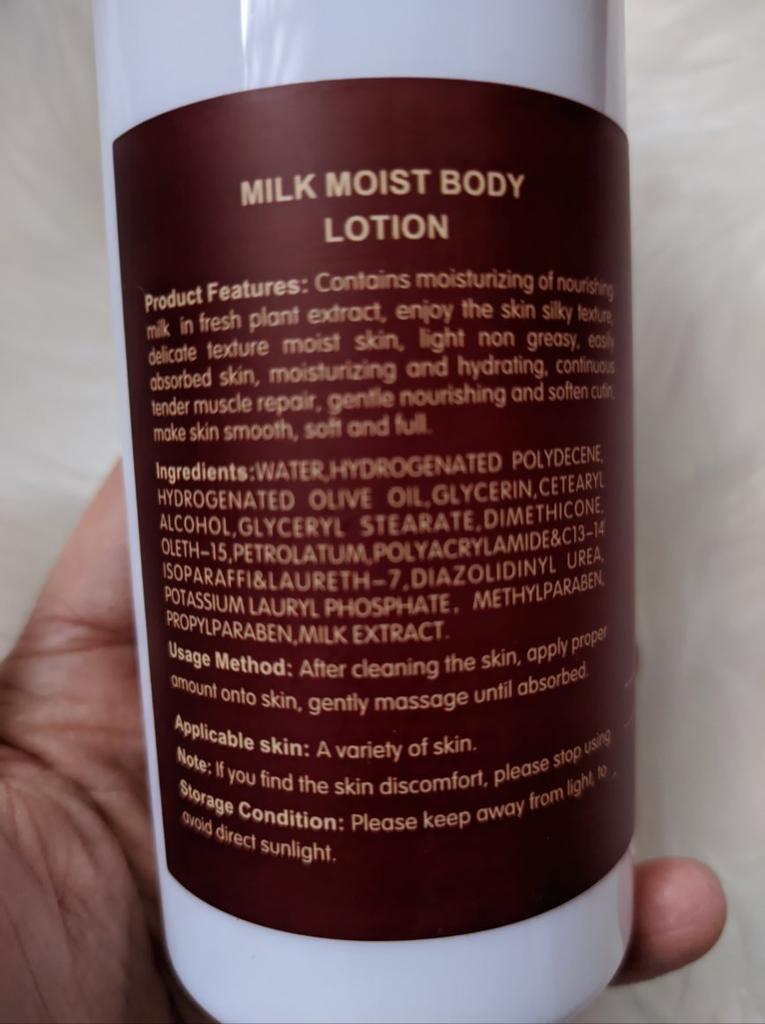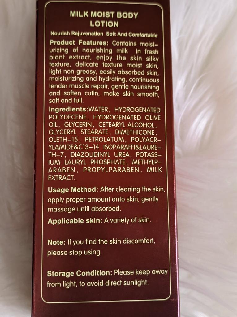 Lozione per il corpo Marca: MeiYan Qiong ⭐⭐⭐⭐⭐ Mi piacciono i prodotti di questo marchio. E questo è diventato uno dei miei prodotti preferiti tra questi. La consistenza della lozione per il corpo è così liscia come una consistenza setosa. La mia pelle lo beve letteralmente! Ha un odore molto buono come un profumo di latte. La lozione per il corpo è adatta a tutti i tipi di pelle e a tutto il corpo compreso il collo. Penso che se puoi usarlo anche per il viso se hai la pelle secca. Mi piace che il contenitore abbia il dispenser. È molto facile e igienico. L'importo netto è molto grande 250 gr.