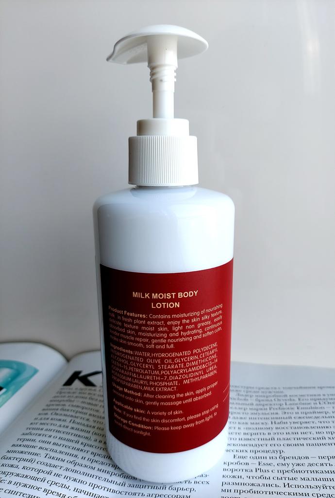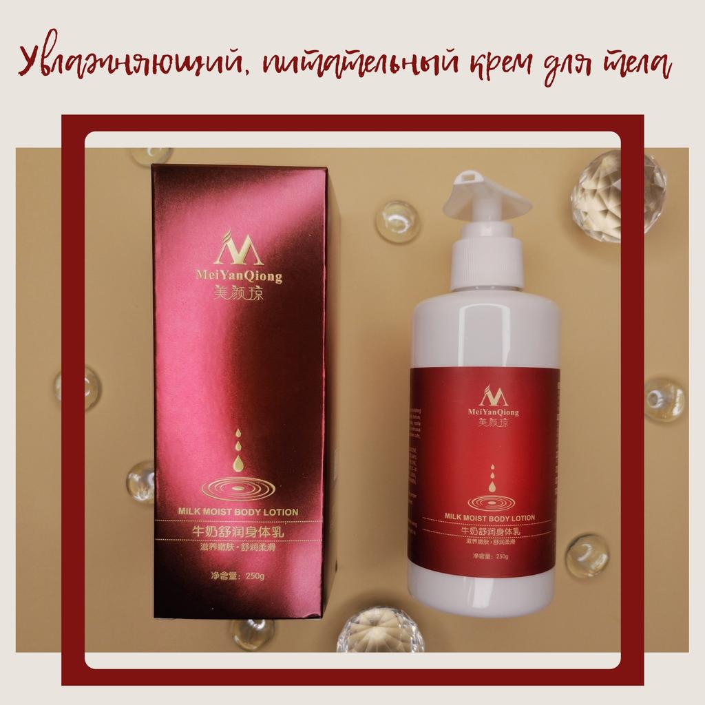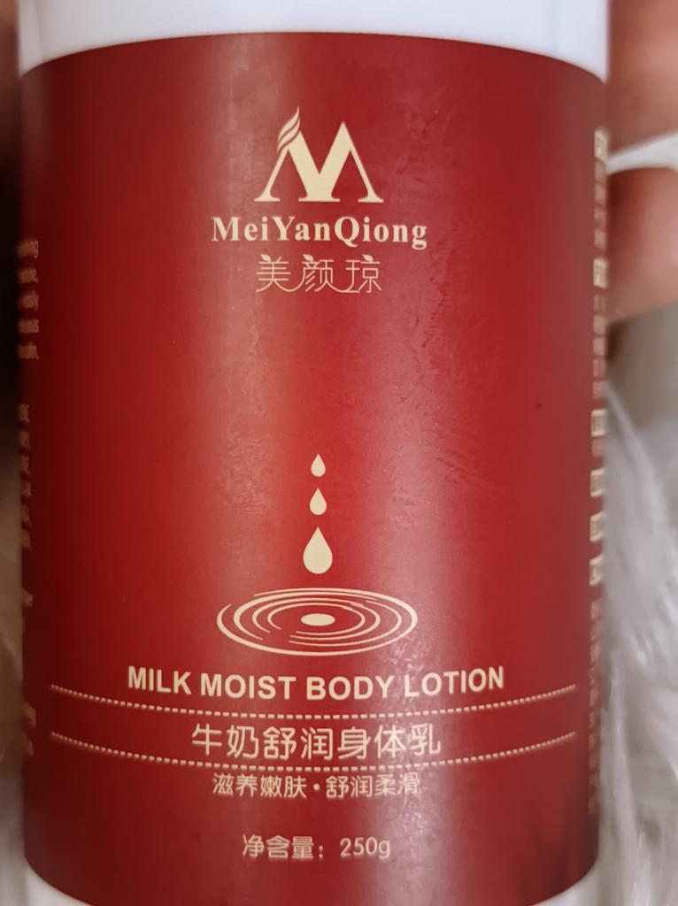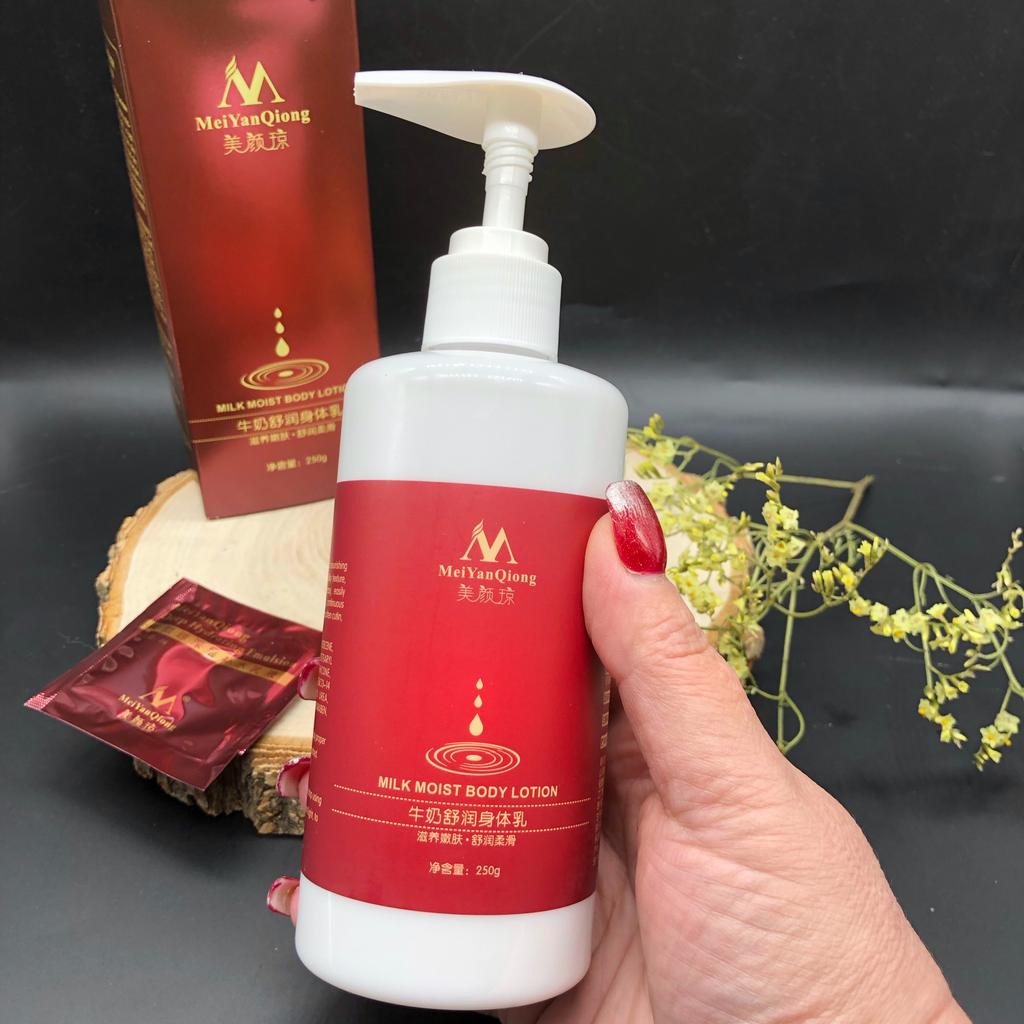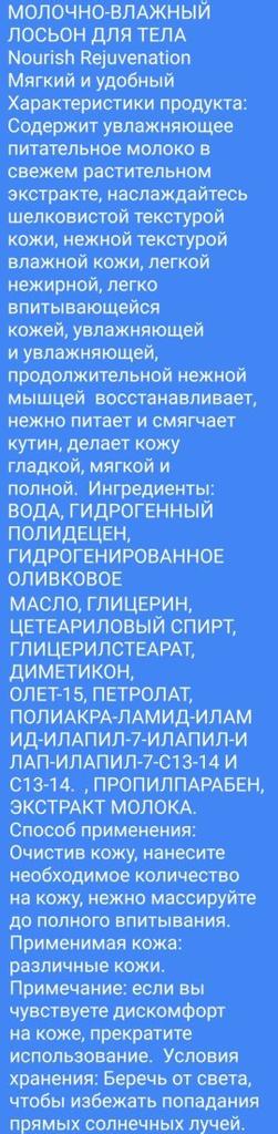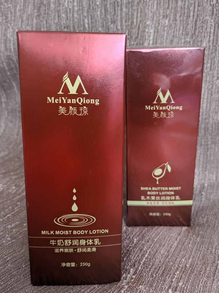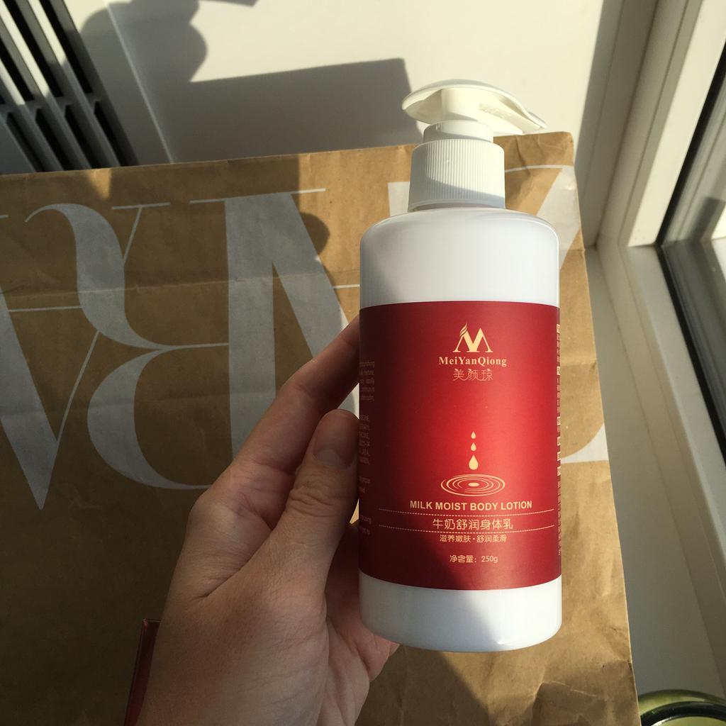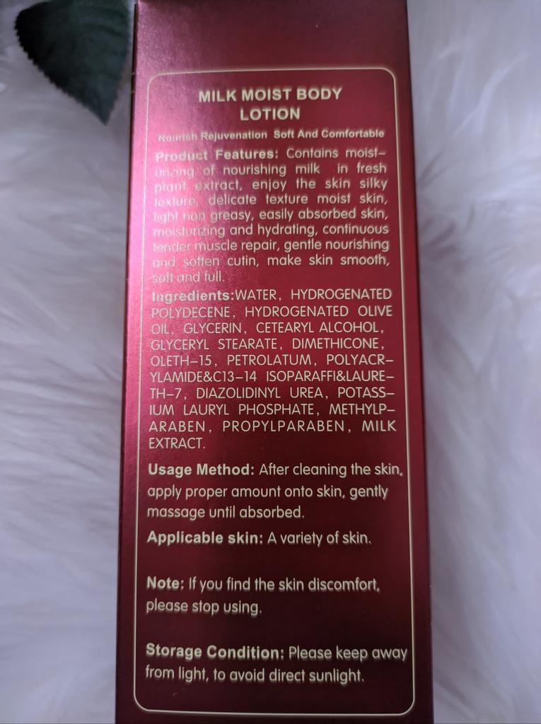 Lozione per il corpo Marca: MeiYan Qiong ⭐⭐⭐⭐⭐ Mi piacciono i prodotti di questo marchio. E questo è diventato uno dei miei prodotti preferiti tra questi. La consistenza della lozione per il corpo è così liscia come una consistenza setosa. La mia pelle lo beve letteralmente! Ha un odore molto buono come un profumo di latte. La lozione per il corpo è adatta a tutti i tipi di pelle e a tutto il corpo compreso il collo. Penso che se puoi usarlo anche per il viso se hai la pelle secca. Mi piace che il contenitore abbia il dispenser. È molto facile e igienico. L'importo netto è molto grande 250 gr.
