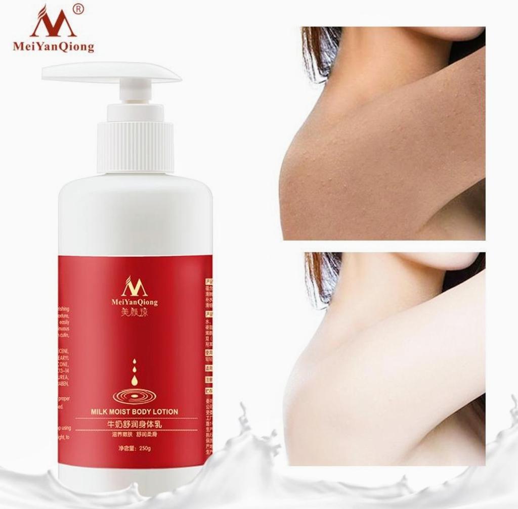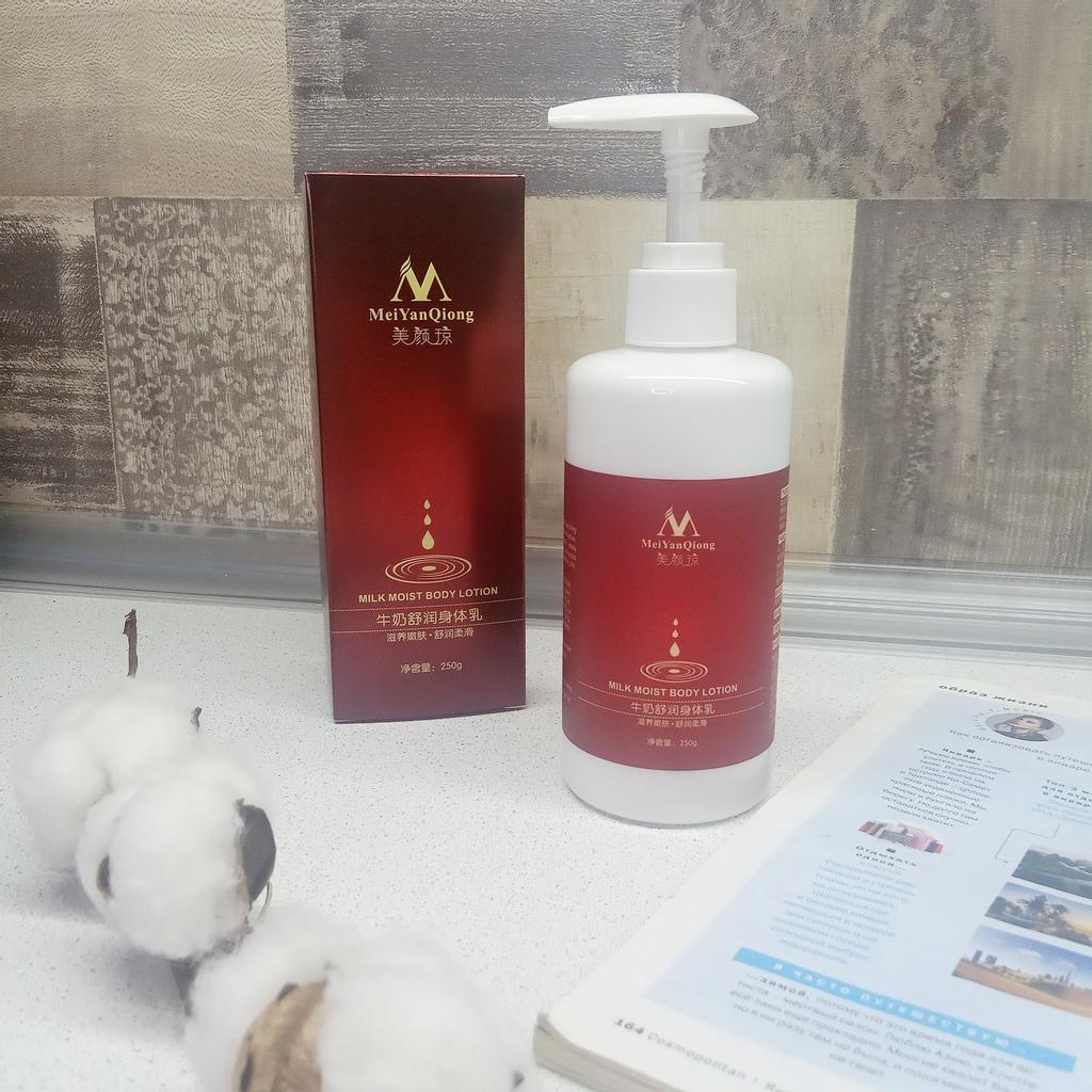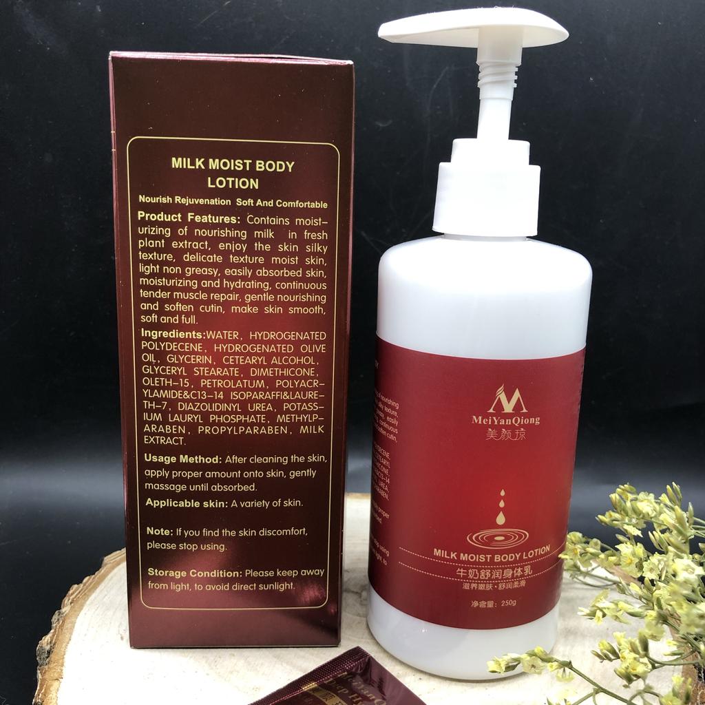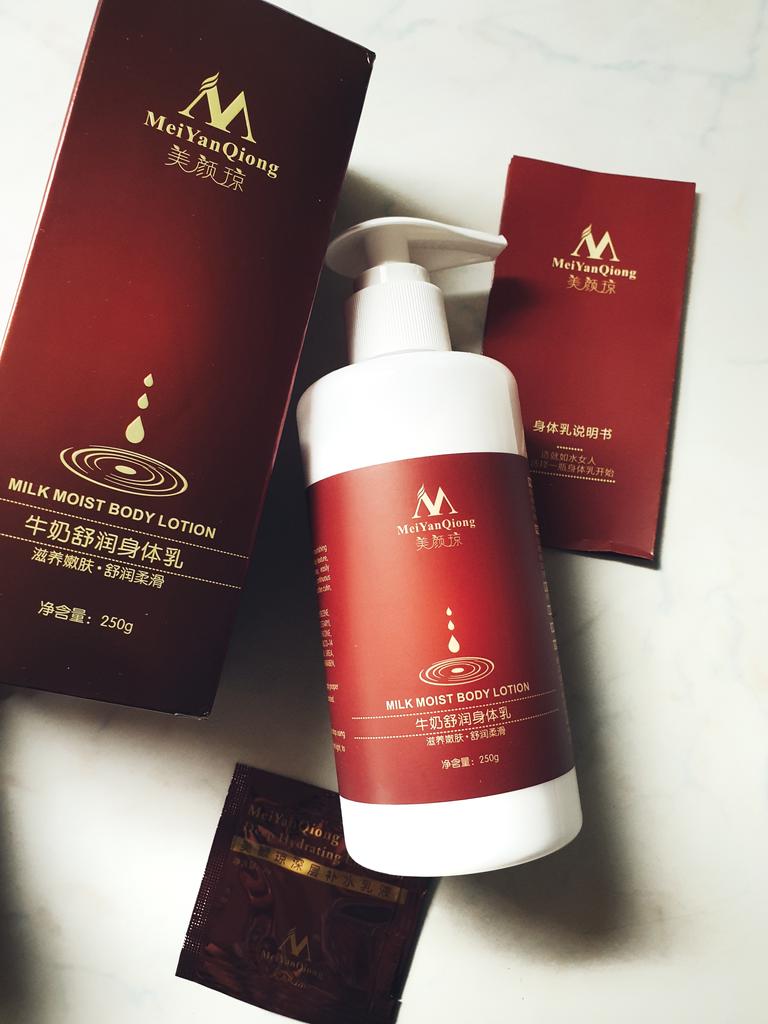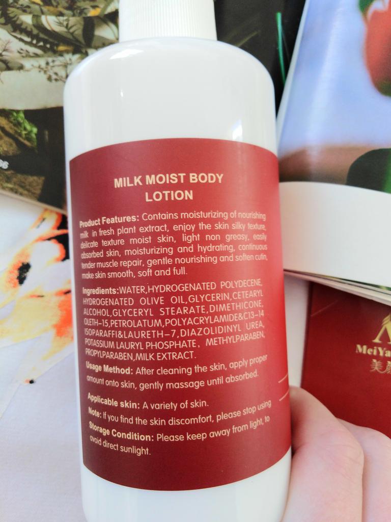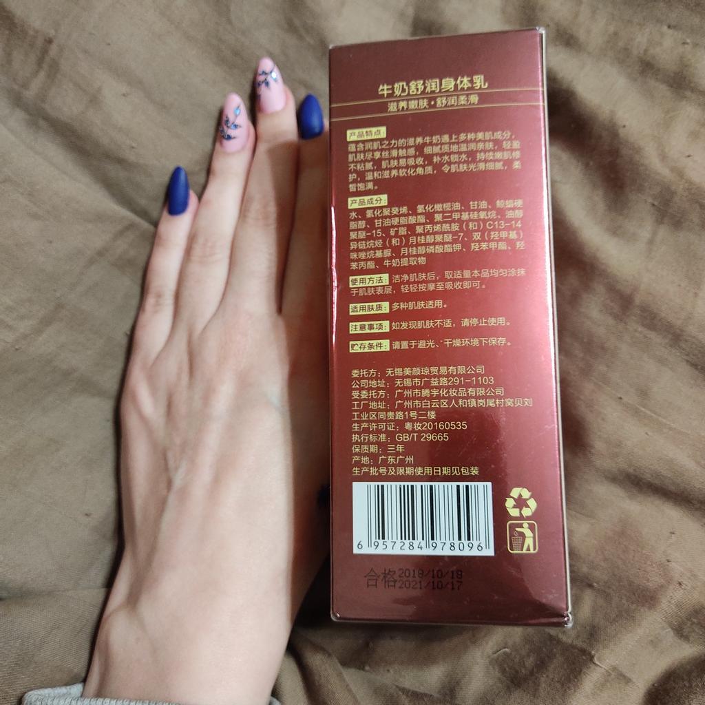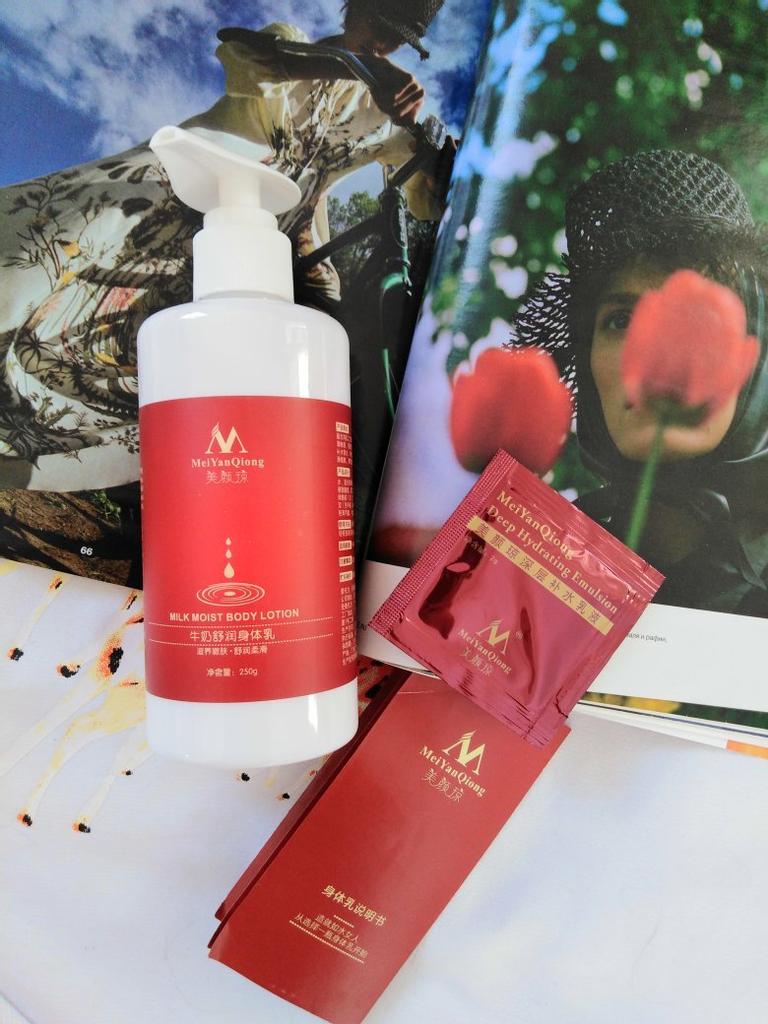 Lozione per il corpo Marca: MeiYan Qiong ⭐⭐⭐⭐⭐ Mi piacciono i prodotti di questo marchio. E questo è diventato uno dei miei prodotti preferiti tra questi. La consistenza della lozione per il corpo è così liscia come una consistenza setosa. La mia pelle lo beve letteralmente! Ha un odore molto buono come un profumo di latte. La lozione per il corpo è adatta a tutti i tipi di pelle e a tutto il corpo compreso il collo. Penso che se puoi usarlo anche per il viso se hai la pelle secca. Mi piace che il contenitore abbia il dispenser. È molto facile e igienico. L'importo netto è molto grande 250 gr.