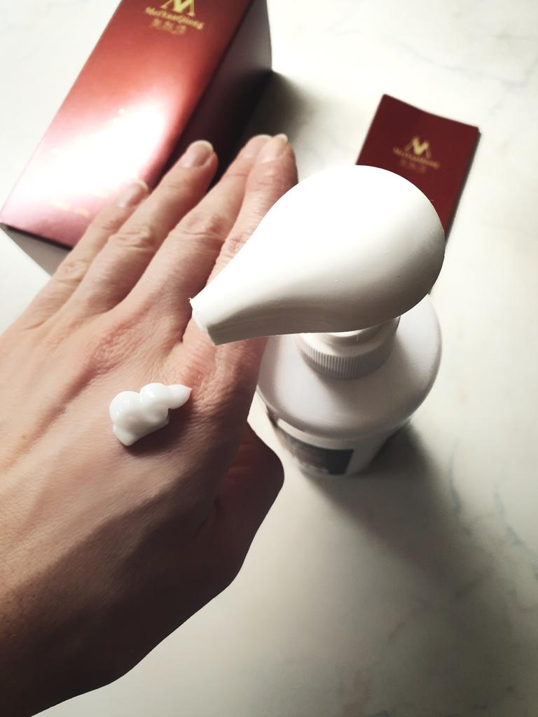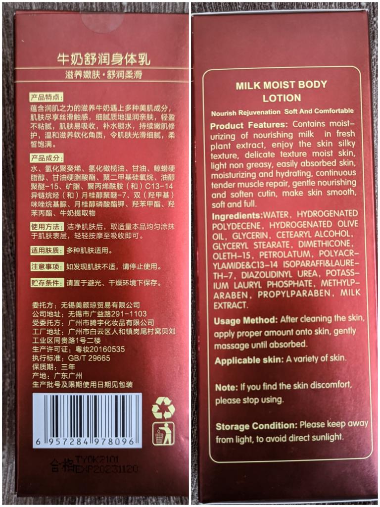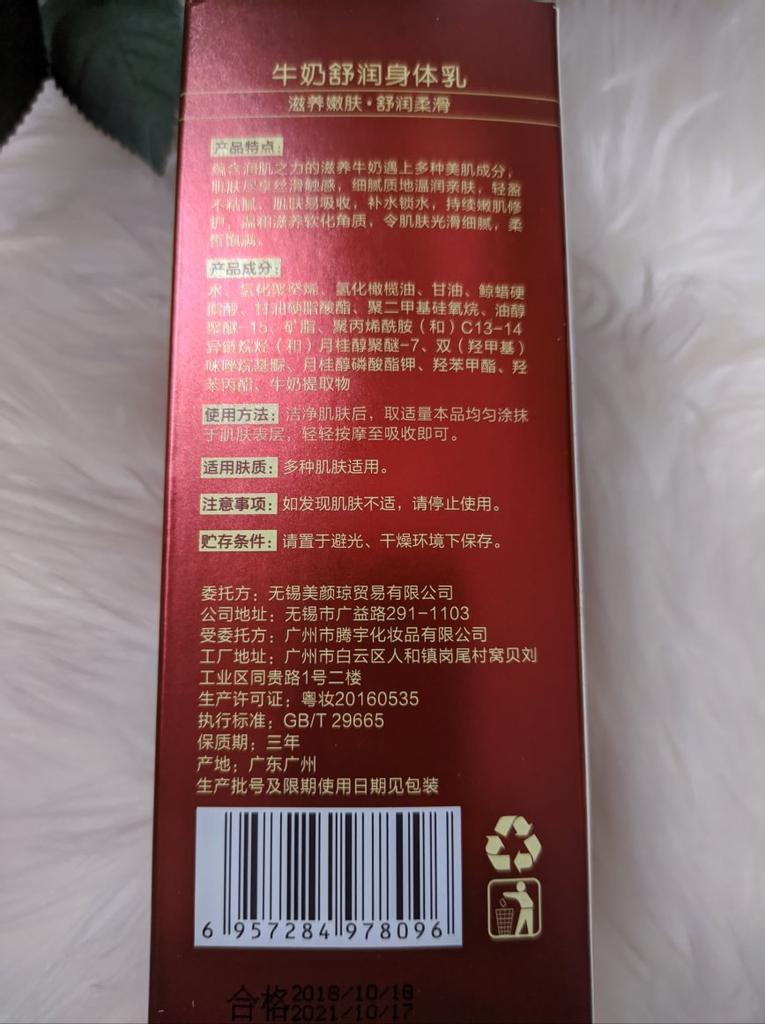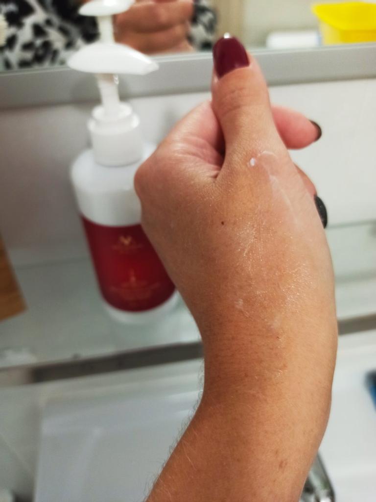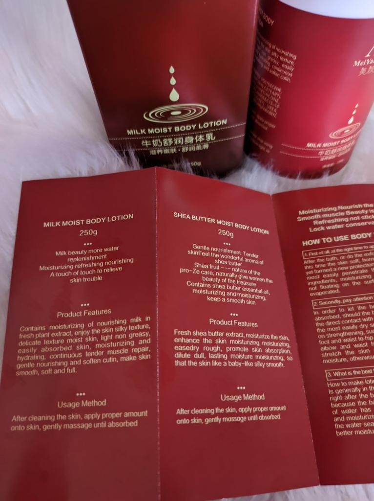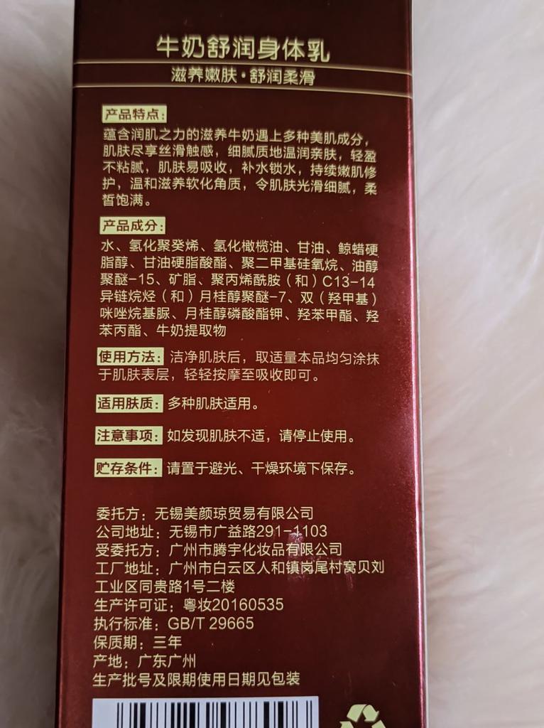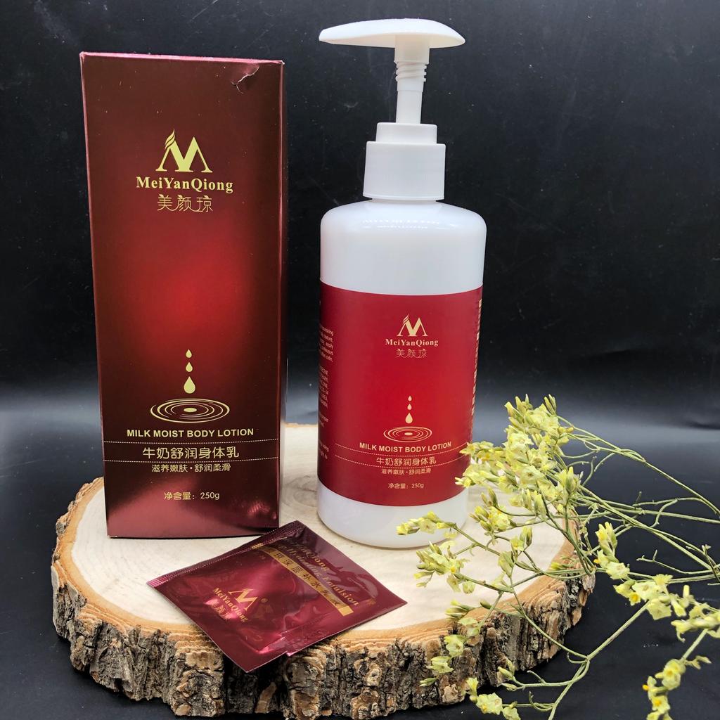 Lozione per il corpo Marca: MeiYan Qiong ⭐⭐⭐⭐⭐ Mi piacciono i prodotti di questo marchio. E questo è diventato uno dei miei prodotti preferiti tra questi. La consistenza della lozione per il corpo è così liscia come una consistenza setosa. La mia pelle lo beve letteralmente! Ha un odore molto buono come un profumo di latte. La lozione per il corpo è adatta a tutti i tipi di pelle e a tutto il corpo compreso il collo. Penso che se puoi usarlo anche per il viso se hai la pelle secca. Mi piace che il contenitore abbia il dispenser. È molto facile e igienico. L'importo netto è molto grande 250 gr.