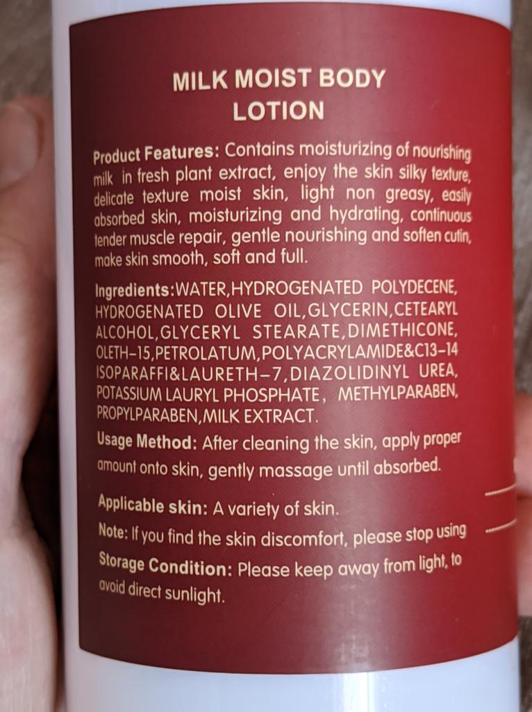 Lozione per il corpo umida al latte Ciao Purtroppo non ho ricevuto la lozione. Dogana sdoganata e rispedita. Non so come decidono, ma immagino dipenda dal gusto del doganiere.. Buona giornata.