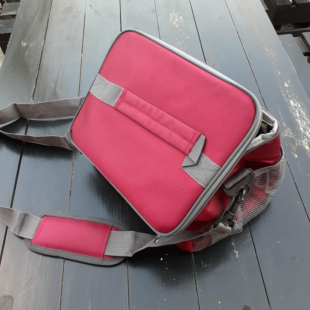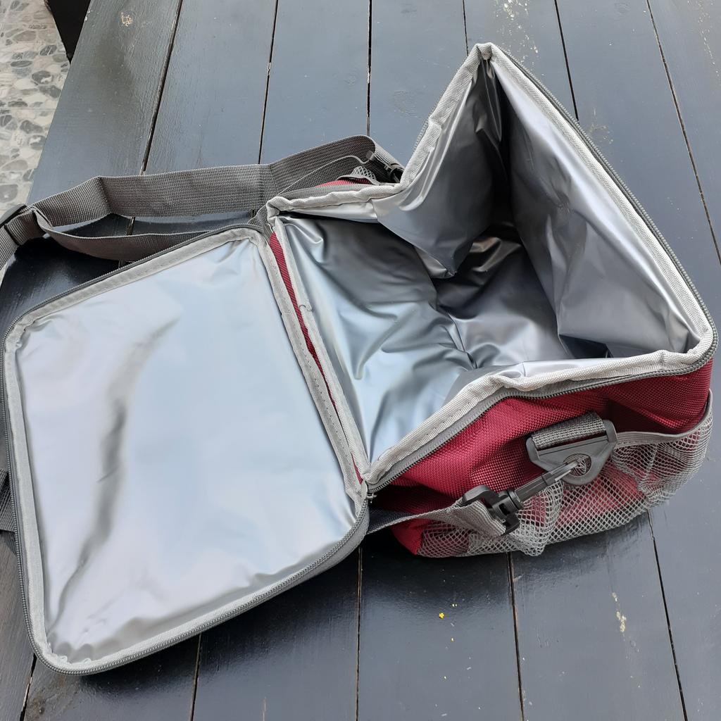 Borsa termica capiente le cuciture sono ben fatte ha la tracolla removibile e regolabile le cerniere sono molto robuste e ci sono 2 comode tasche con rete laterale.