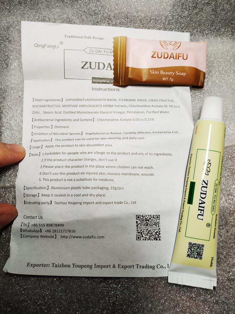 Unguento cinese (crema) Zudaifu 💚🌿 Volume 15 gr. Non è la prima volta che prendo questa crema e non è la prima volta che ne scrivo una recensione. La crema aiuta davvero, quindi ne prendo subito un set: in primo luogo, è più economica, in secondo luogo, la maggior parte è fatta su ordinazione e, in terzo luogo, se hai seri problemi di pelle, un tubo per corso non sarà sufficiente. Ora riguardo alla crema stessa: ZUDAIFU" (Zudaifu)🌿 è la crema numero uno in Cina per combattere i problemi della pelle. Gode di un'enorme e meritata popolarità non solo in Cina, ma anche in molti paesi del mondo. Il produttore ci promette che la crema è completamente naturale -basato. Ci viene inoltre assicurato che il prodotto non è ormonale. Viene utilizzato per pelli problematiche che vanno dalla pelle secca alla psoriasi, eczema, dermatiti, vitiligine, lesioni cutanee fungine, prurito, acne. Allevia il prurito ed elimina tutte le manifestazioni indesiderate sulla pelle dopo poche sedute di utilizzo della crema. Conservazione: Frutti di Cnidium, semi di kochia, muschio bianco, corteccia di velluto dell'Amur, spine di biancospino a tre spine, martinia, loto, radice di stemona sessileum, noce di anice, acero, corteccia di radice di frassino essiccata, sophora gialla. Metodo di applicazione: Applicare sulla pelle pulita, direttamente sull'area problematica. Si consiglia l'uso 2-3 volte al giorno.Se applicato sulla pelle, è possibile un leggero effetto di freschezza, a volte di calore. La crema a base di olio di canfora viene assorbita dalla pelle dopo 2-3 minuti. La crema è di colore rosa, ha un gradevole profumo di erbe 🌾 Se la recensione ti è stata utile mettila tra i preferiti ❤️ Ho ricevuto il prodotto in 24 giorni 🚀🚀🚀 La pista è stata tracciata completamente. L'arrivo al punto di consegna è stato avvisato tramite sms 📲 Confezione: pacco postale ordinario. Le scatole con la crema sono fissate insieme con nastro adesivo. Tutte le informazioni sono solo in cinese. C'è un'istruzione, ma è anche in cinese. Sono indicate le date di scadenza. Buon shopping e consegne veloci a tutti 🛒☺️🚀🌷 PS: Hai bisogno di codici promozionali? Allora assicurati di visitare il mio canale Telegram: Olena.joom.thebest (t.me/olenajoom), dove pubblico regolarmente codici promozionali per acquisti redditizi 🛍️😘.