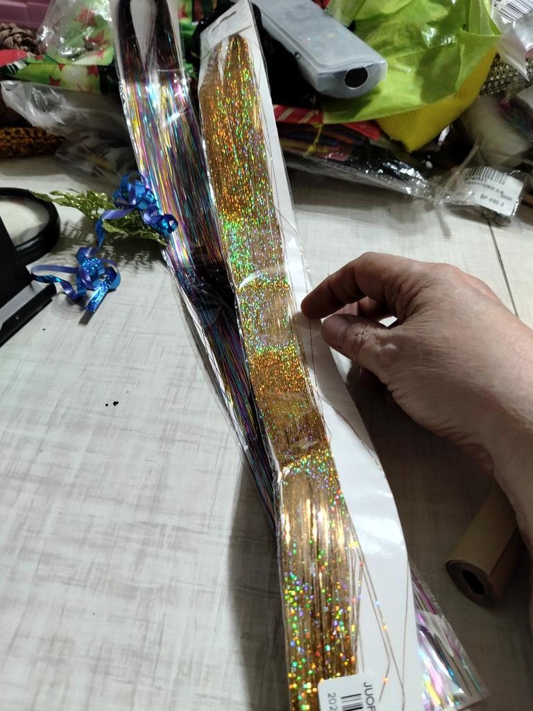 Grazie. Ho le mie ciocche di capelli, ma quelle esterne sono più come la pioggia su un albero di Natale. Bene vediamo. Come apparirà sui capelli. Fino ad ora, questa cosa è di tendenza per le fashioniste.