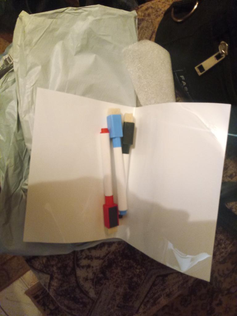 Formato piccolissimo, è la metà di un foglio A4. Ci sono tre pennarelli nel set, ma non hanno magneti, cioè non rimangono sul frigorifero. Disegnano bene, cancellano bene. È un peccato che non ci sia posto dove attaccare i pennarelli.
