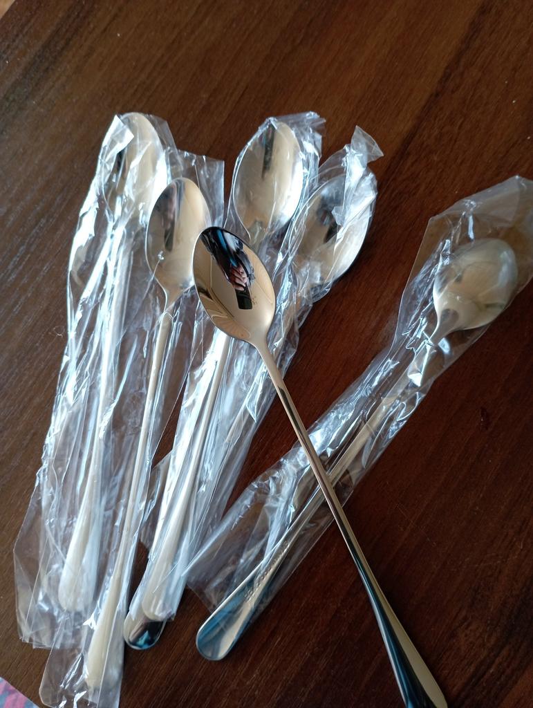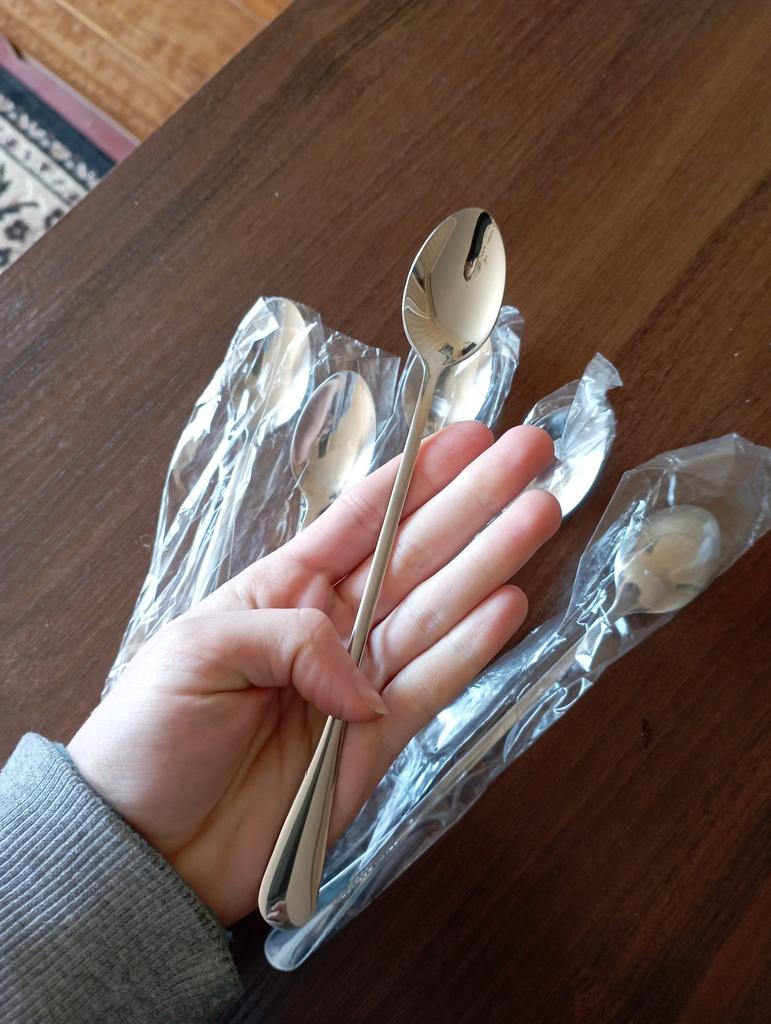 Cucchiaini da dessert con manico lungo, vi lascio una foto così potete confrontarli con uno normale. Adoro questi cucchiai per dessert! 6 arrivano e sono proprio come li vediamo nel 📸