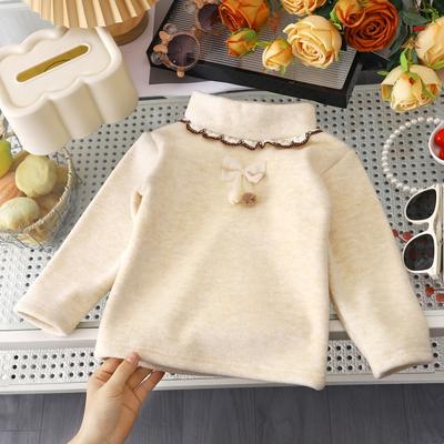 T-shirt a Manica Lunga in Velluto per Bambina, Colore Unito, con Fiocco, Collo Alto, Magliette Calde per Autunno Inverno, Abbigliamento Casual per Bambine