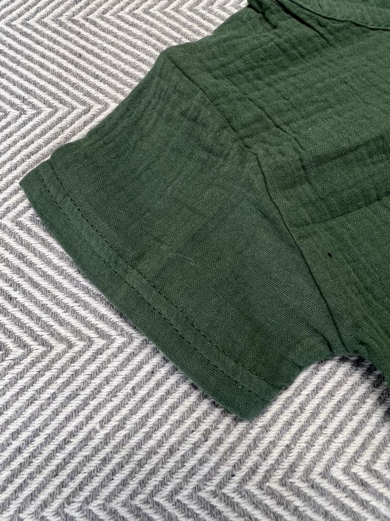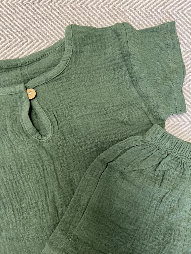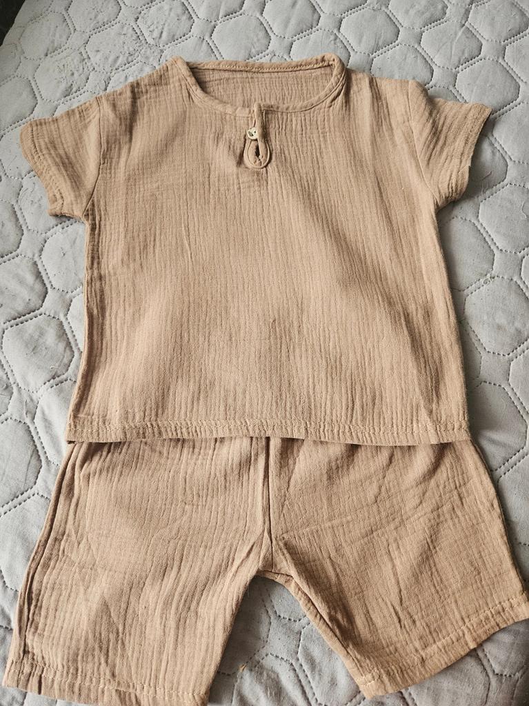 Il set è fantastico. 💪 Mussola, materiale morbido. Perfetto per l'estate ☀️ Il colore è difficile da definire, almeno per me 🙈 kaki, ma più marrone, ... beige scuro 🤷 Purtroppo la foto non rispecchia il colore reale Dimensioni perfette per il mio bambino alto di 4 anni (110 cm, 18 kg). Elastico in vita, senza allungamento - 18 cmx2, si estende fino a 34 cmx2 L'unico neo è l'etichetta cucita all'esterno 🙈 Ora devo cercare di ritagliarla bene 😋