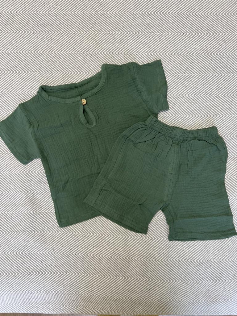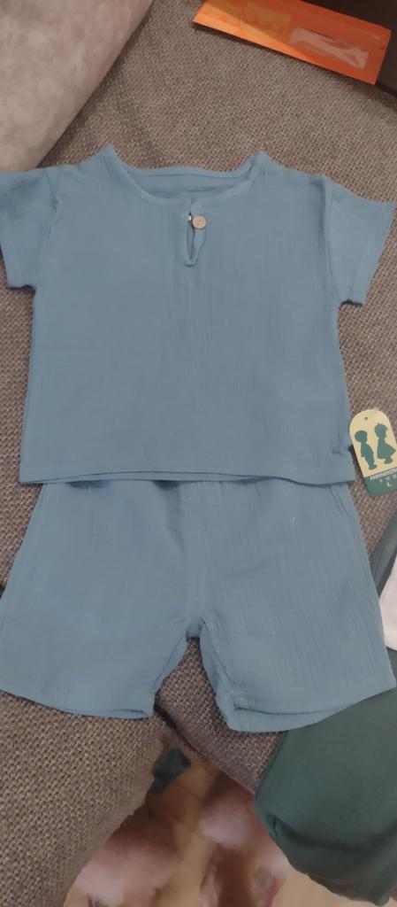 Il set è molto carino, taglia un po' grande ma l'effetto morbido è carino ! Piacevole da indossare, soprattutto quando fa caldo, il bambino si sente a suo agio. Pantaloncini elastici in vita.