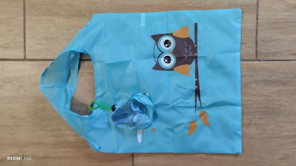 Borsa della spesa Baloney. Si ripiega in una piccola borsa a forma di una specie di gufo o qualcosa del genere. Borsa di medie dimensioni. L'ho ordinato in colore beige, ma è arrivato in blu (l'ho selezionato appositamente per abbinarlo al colore della borsa), è un peccato, ora non entra da nessuna parte.