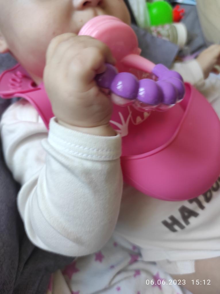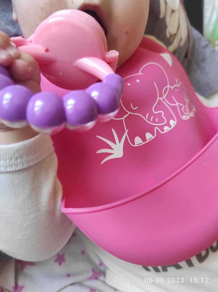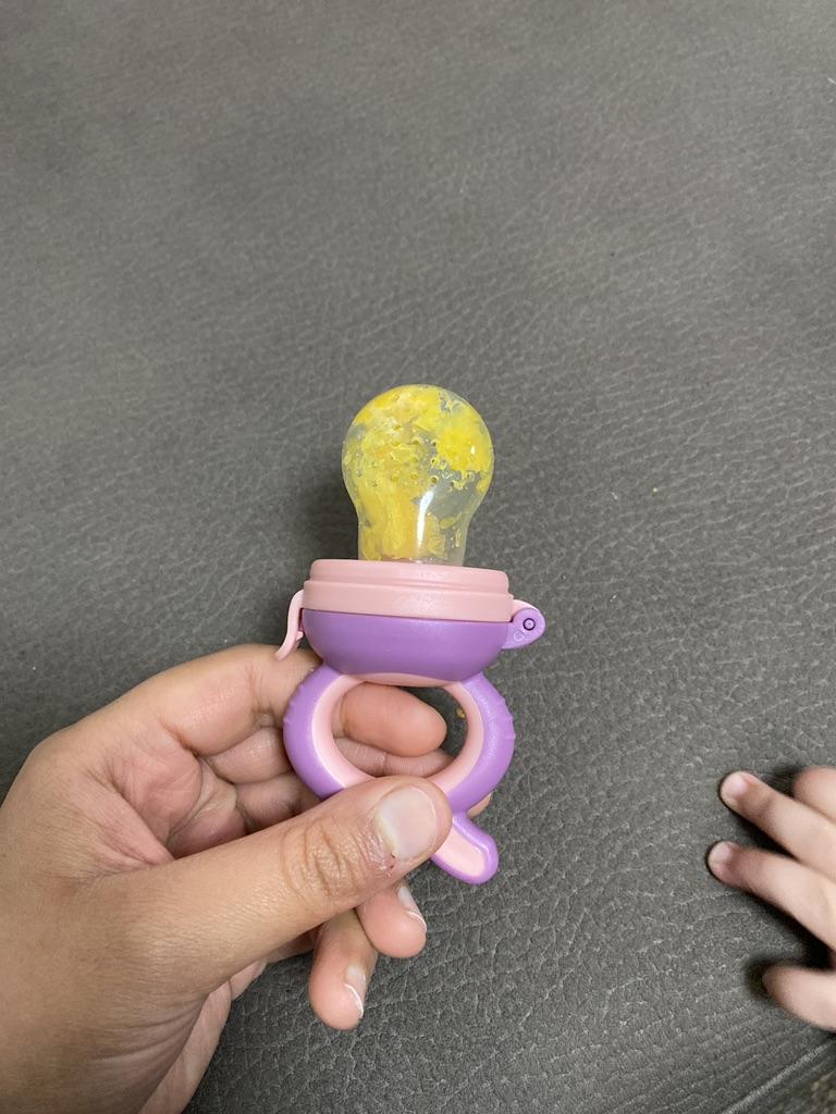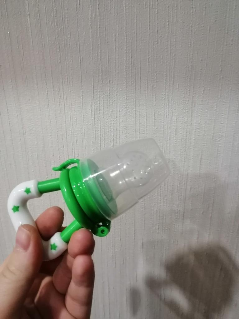 Ciuccio per alimenti freschi. Un bambino di sei mesi spreme felicemente il succo della frutta nel succo con le gengive. Si gratta le gengive con la parte posteriore del ciuccio (orecchie), le morde. Ho tre tipi di questo ciuccio, tutto bene. Ciuccio meraviglioso.Ne consiglio l'acquisto.
