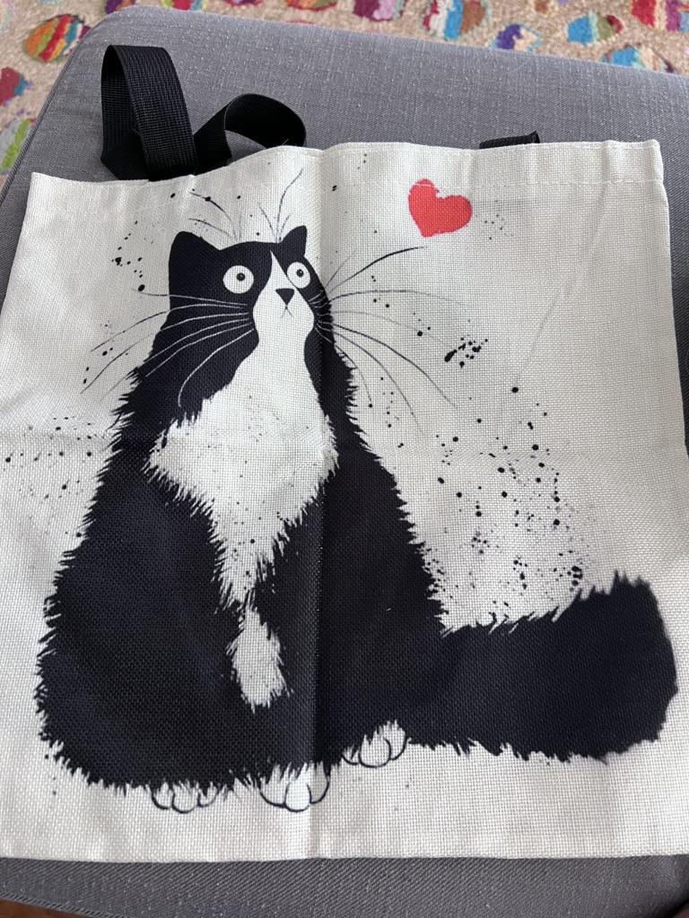 La borsa è carina... ma un po' costosa a 7,14€. Sarebbero bastati cinque euro. Beh... speriamo che duri a lungo e che dopo il lavaggio la stampa del gatto sia ancora la stessa di adesso.