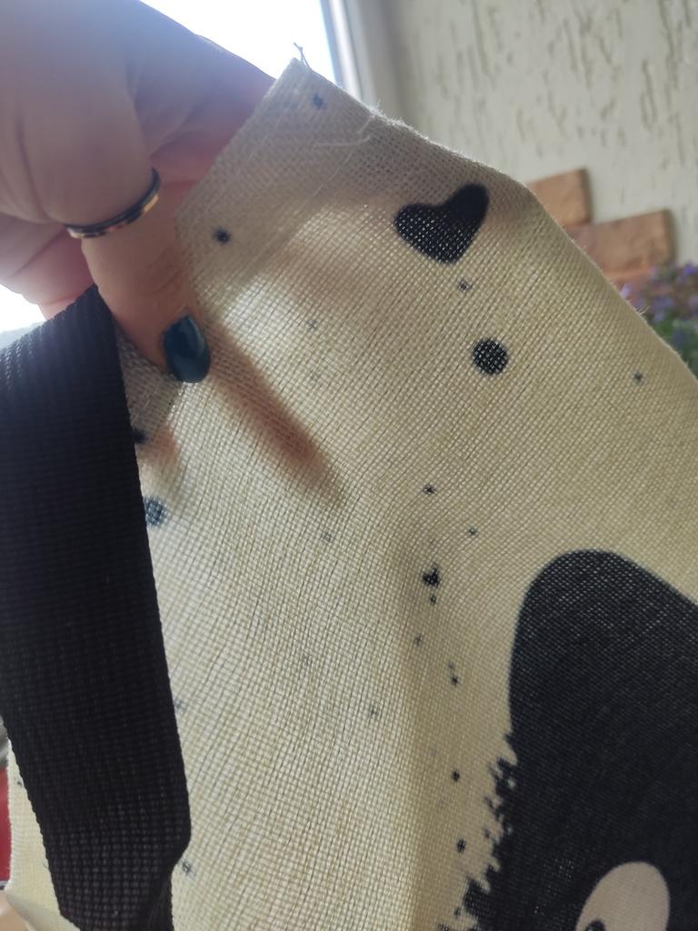 Tela simile ad un lino a trama grossa, disegno molto carino. Sono soddisfatta dell'acquisto.