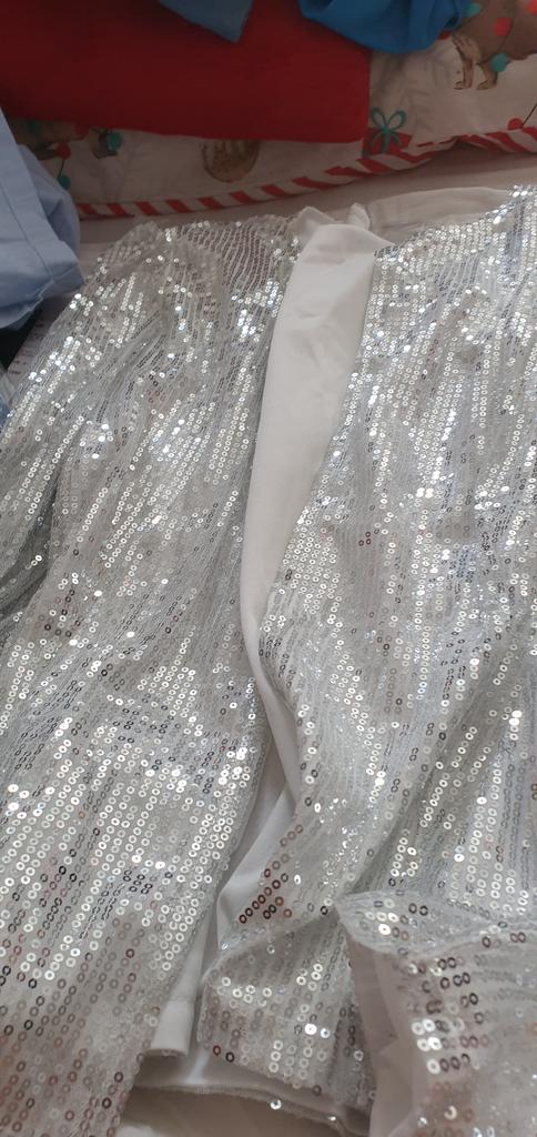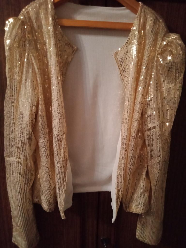 Blazer festivo in paillettes dorate, taglio dritto con fodera in cotone. Iridescente alla luce o al sole. Attirerà sicuramente gli sguardi. L'ho preso in regalo, è della taglia giusta.