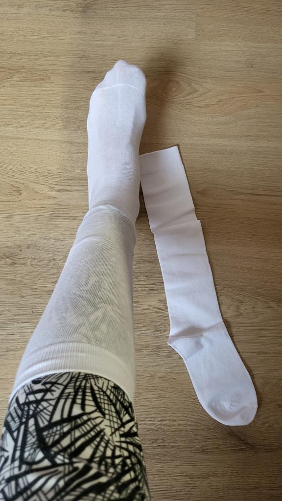Sono arrivati i calzini al ginocchio, sembrano più di nylon, ma sono spessi e carini, l'elastico è un po' stretto. Non molto comodo.