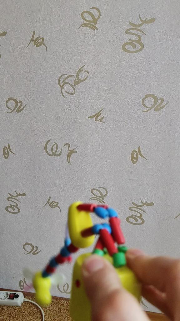Nei primissimi secondi la giraffa è rimasta senza coda, ma nel complesso il giocattolo è luminoso, leggero, il bambino gioca