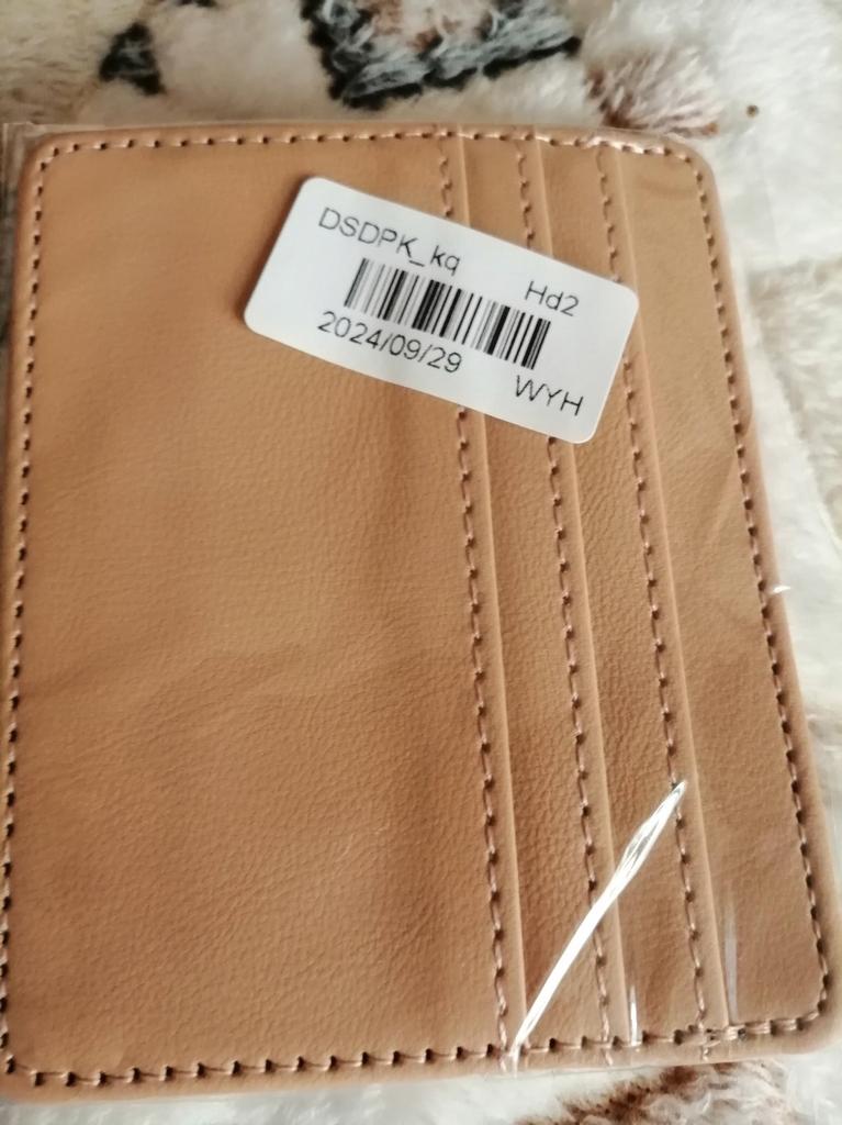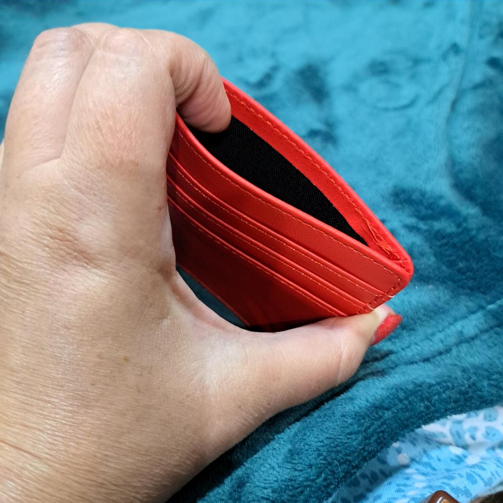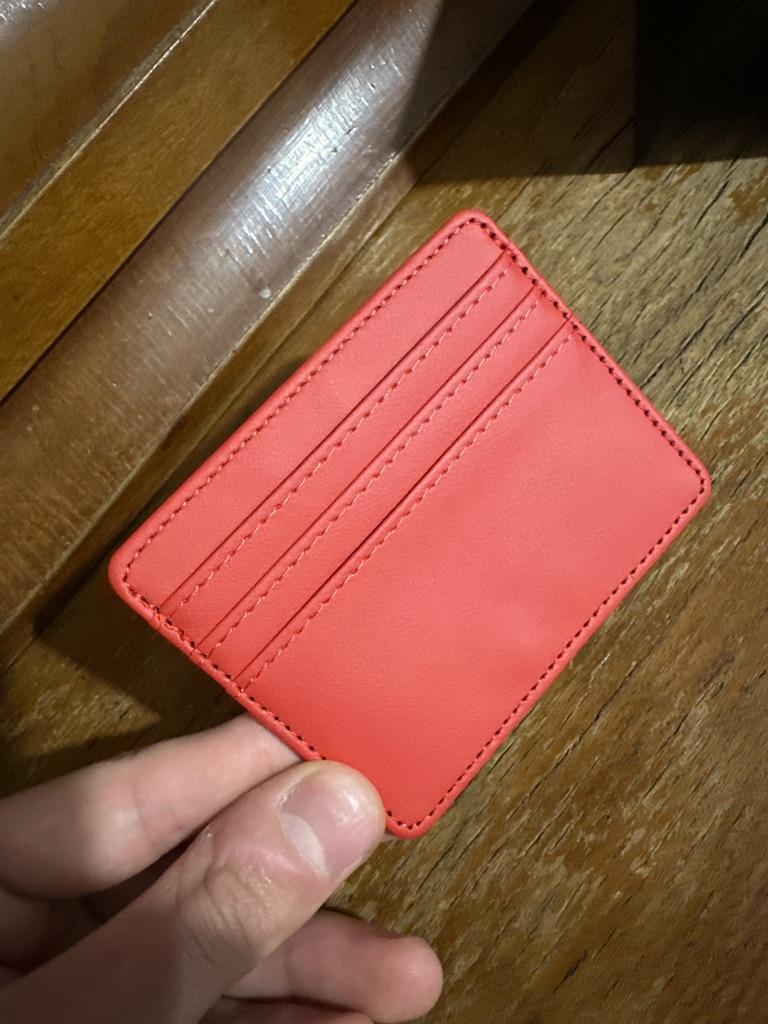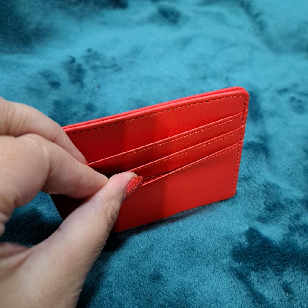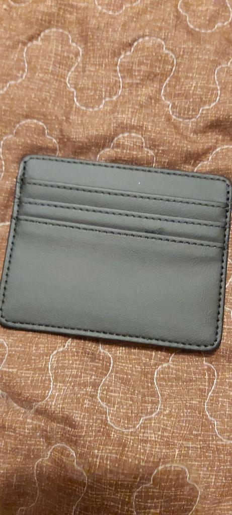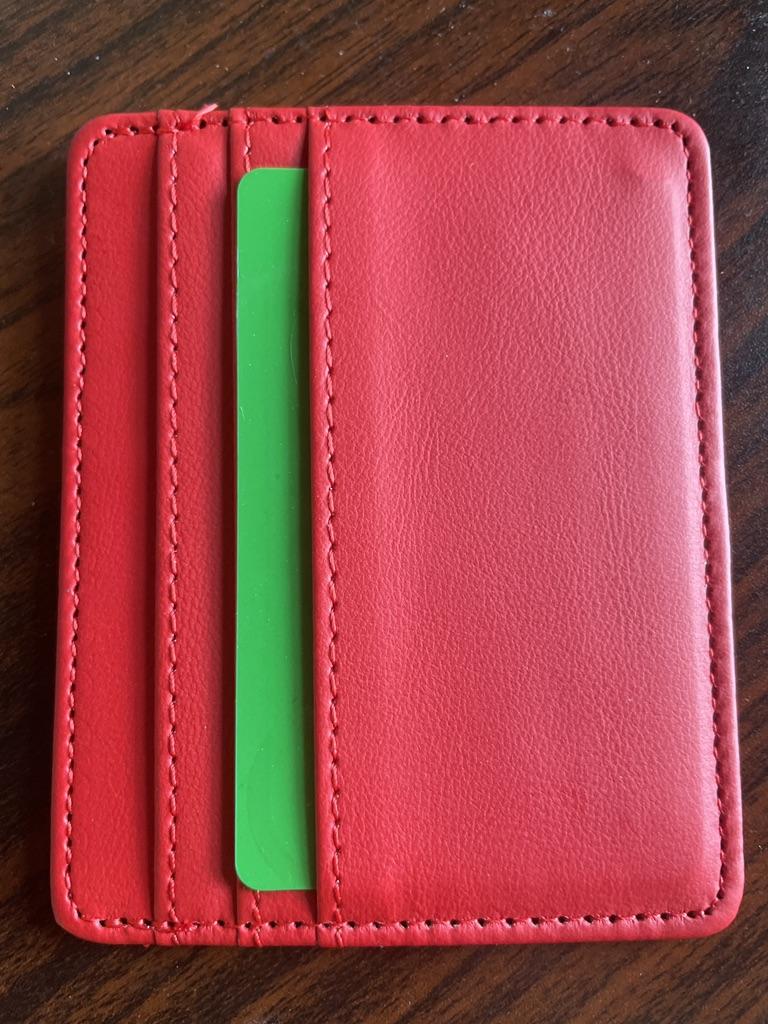 Portacarte in ecopelle. È molto carina. Il colore e la pelle sono bellissimi. Ha 3 slot per carte nella parte anteriore e un altro scomparto nella parte superiore per altri bersagli o ID o un biglietto.