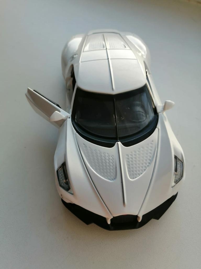 Macchina molto bella, pensavo fosse più piccola, ma è grande (guardala accanto a una carta di credito) L'esterno è in metallo, con finitura quasi opaca, le porte si aprono e si chiudono ermeticamente, il che ti dà la sensazione di "costoso". Le luci anteriori lampeggiano (anche le luci dei freni posteriori) durante l'apertura delle porte e emettono il suono "queau, queau" quando si chiudono le porte. Anche le luci rosse posteriori sono molto belle. È pesante, il che ti dà di nuovo la sensazione di "costoso".. Vale la pena 👌🏻