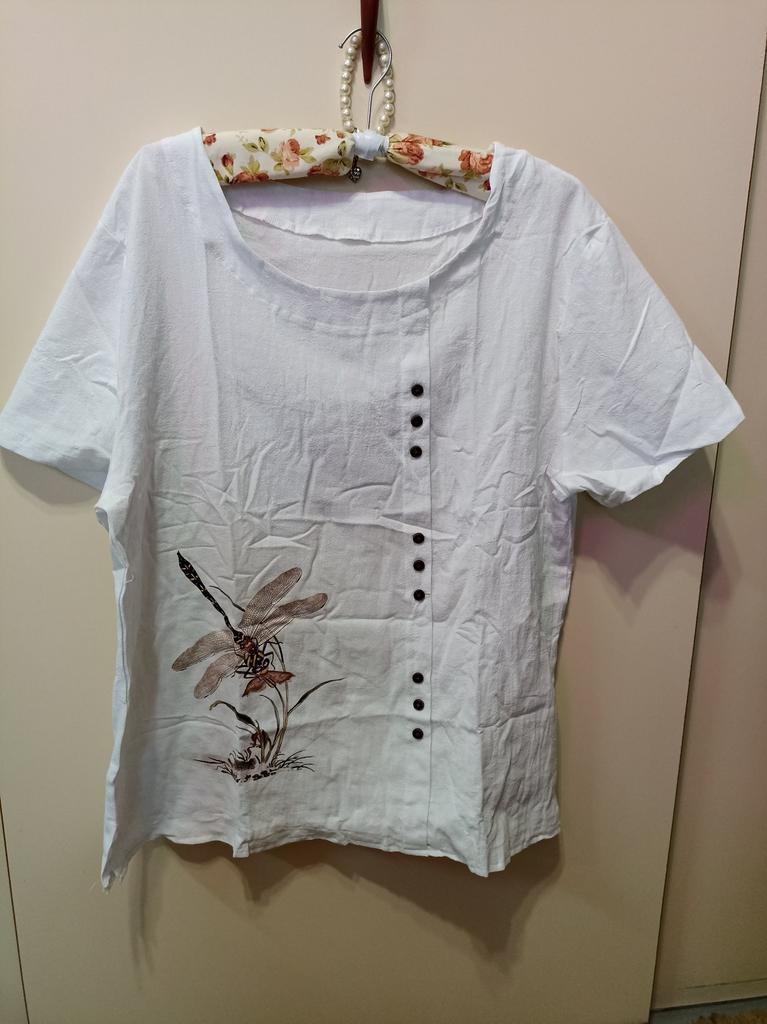 T-shirt allentata con stampa libellula casual estiva T-shirt allentata in cotone e lino retrò Taglie forti Top da donna a maniche corte XS-5XL