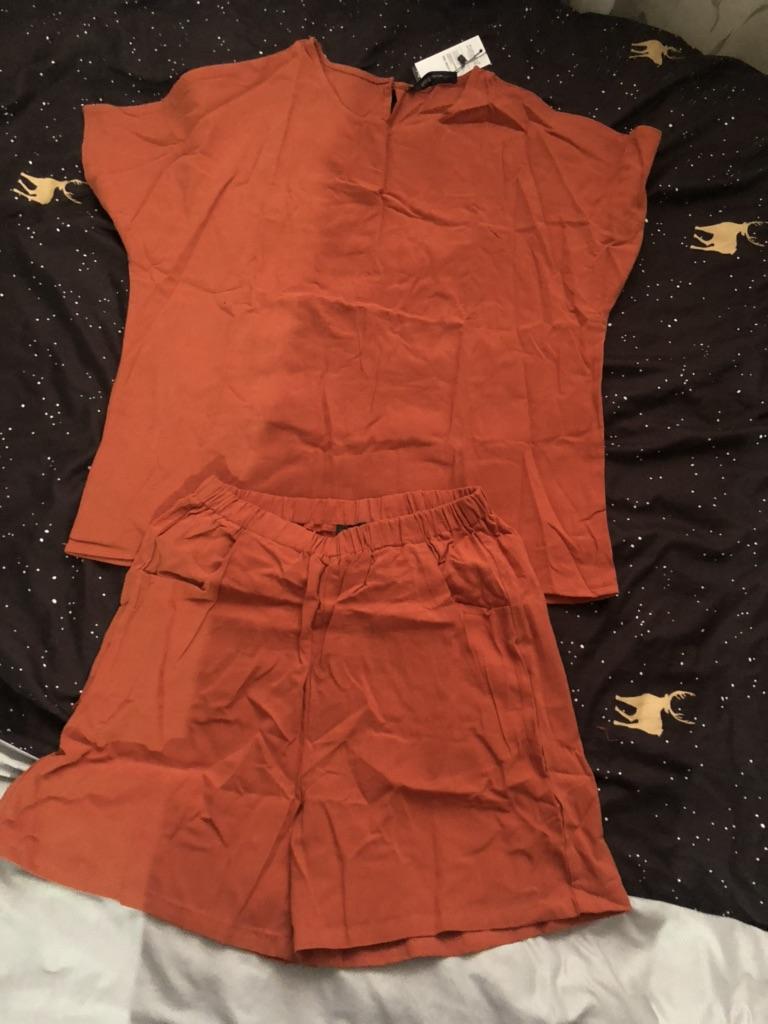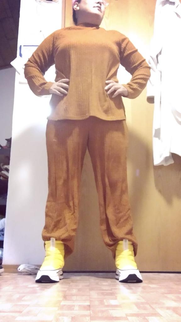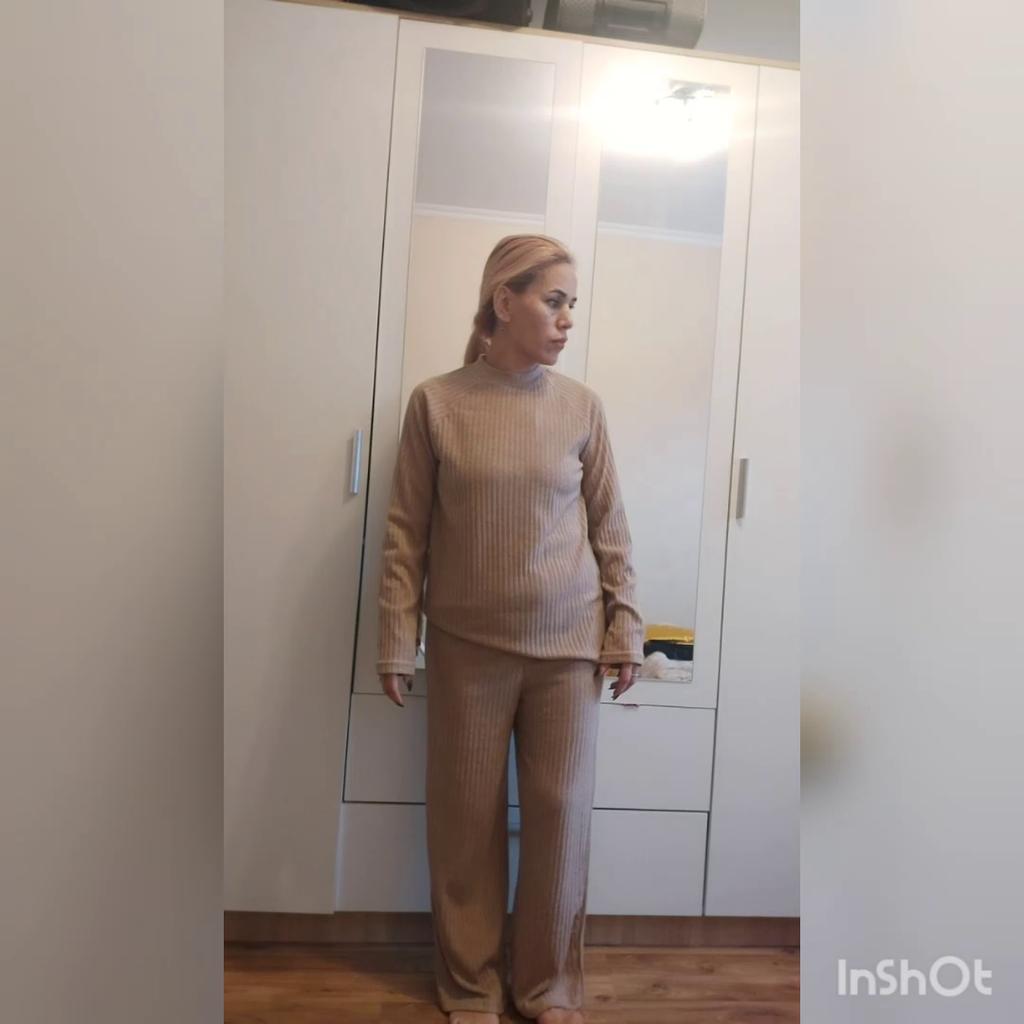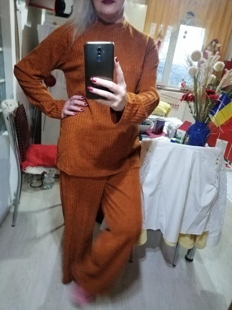 Bellissimo set lavorato a maglia composto da pantaloni e maglione. 👍💚 Le rifiniture, le cuciture e gli orli sono molto curati. 💐💜 È un bel colore arancione/mattone ideale per questa stagione. 💐💘 Il tessuto in viscosa e spandex è perfettamente elastico. 😻💛 Le maniche sono molto lunghe e i pantaloni un po' troppo corti.👎😡 Il modello ricevuto non corrisponde a quello della foto. Peccato. 👎😭