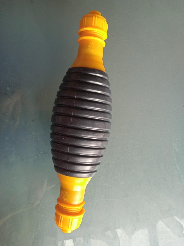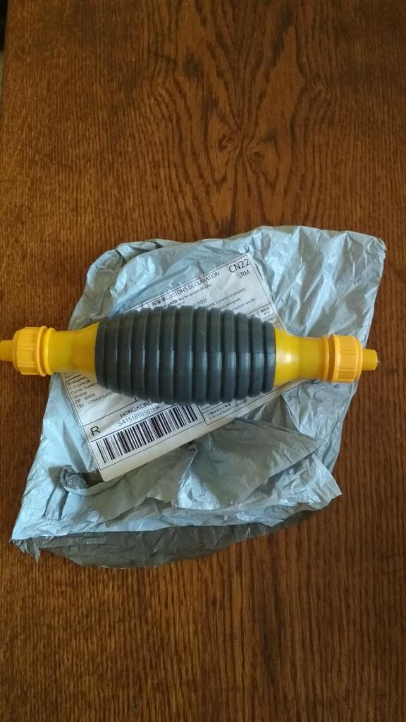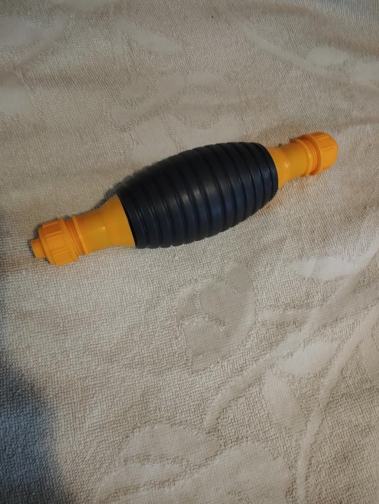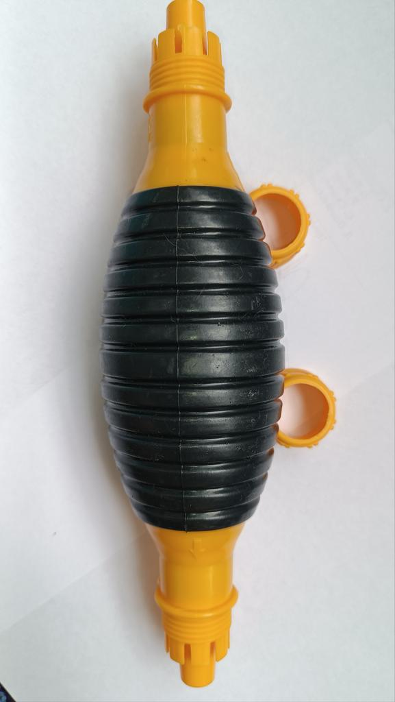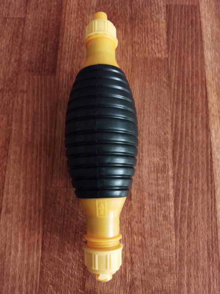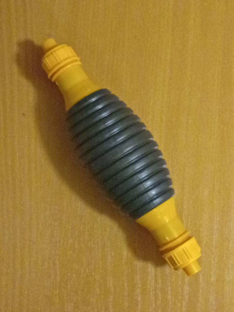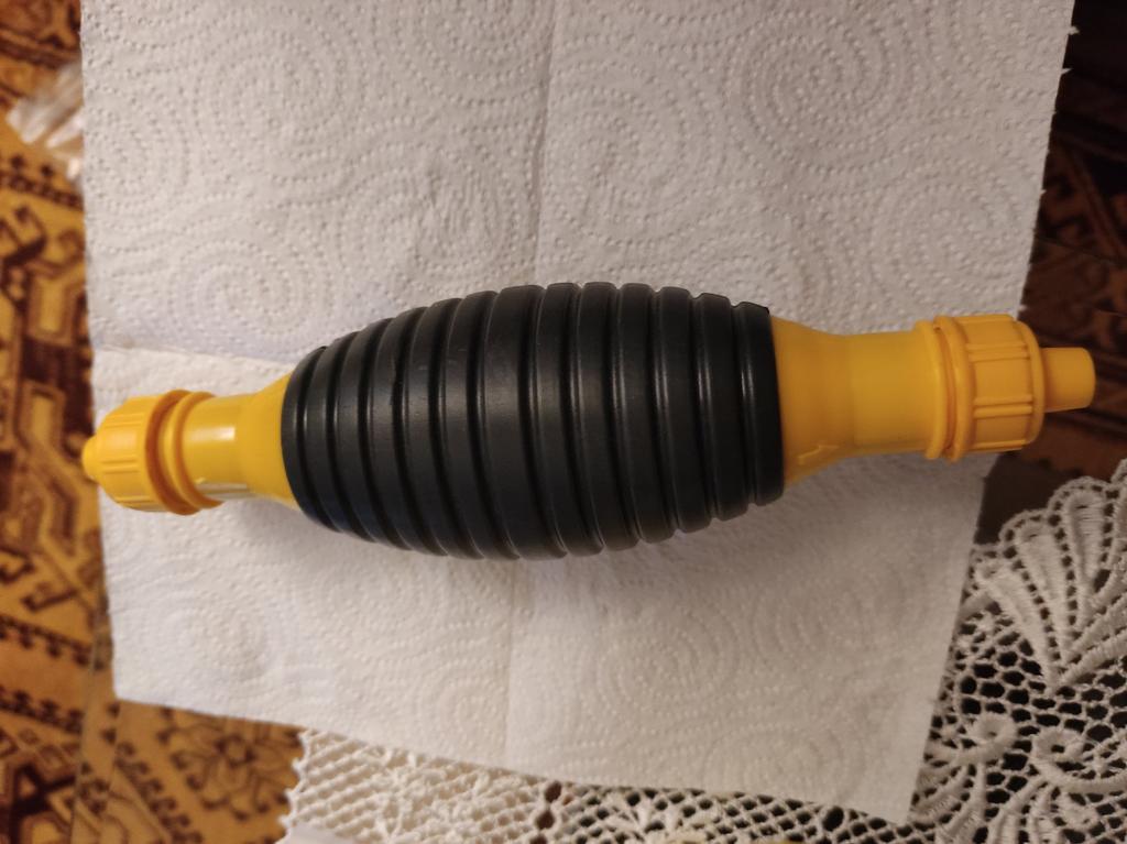 Il bulbo non è di gomma, ma di plastica sottile (ho un'amara esperienza con la plastica), il tempo dirà per quanto tempo funzionerà, si assorbe bene, non so per quanto tempo funzionerà con il carburante