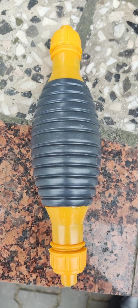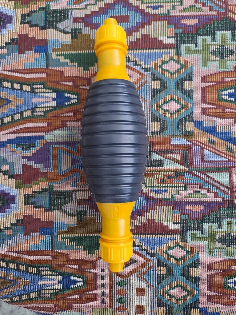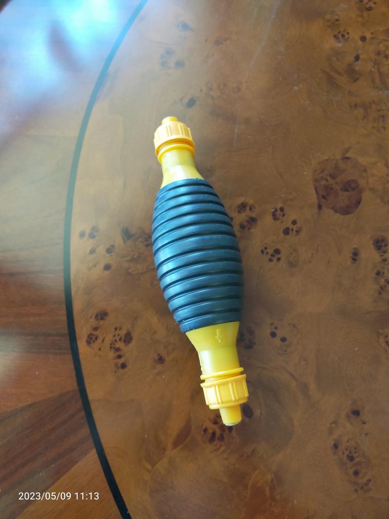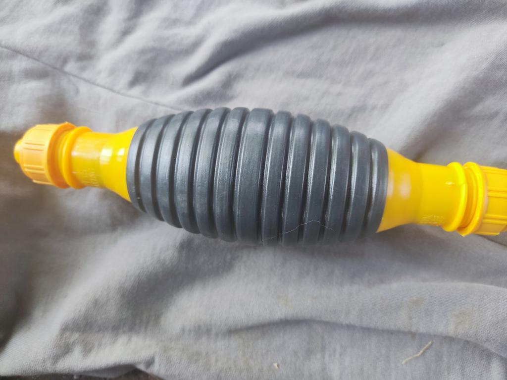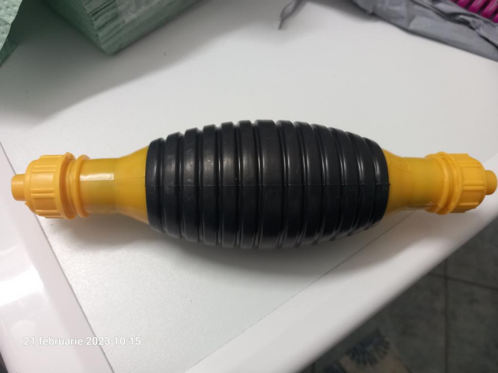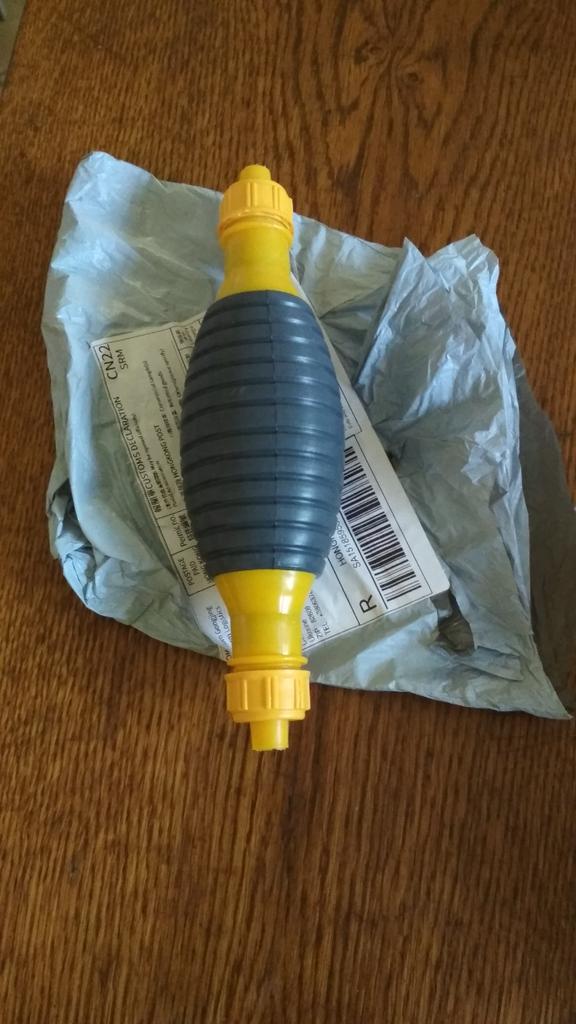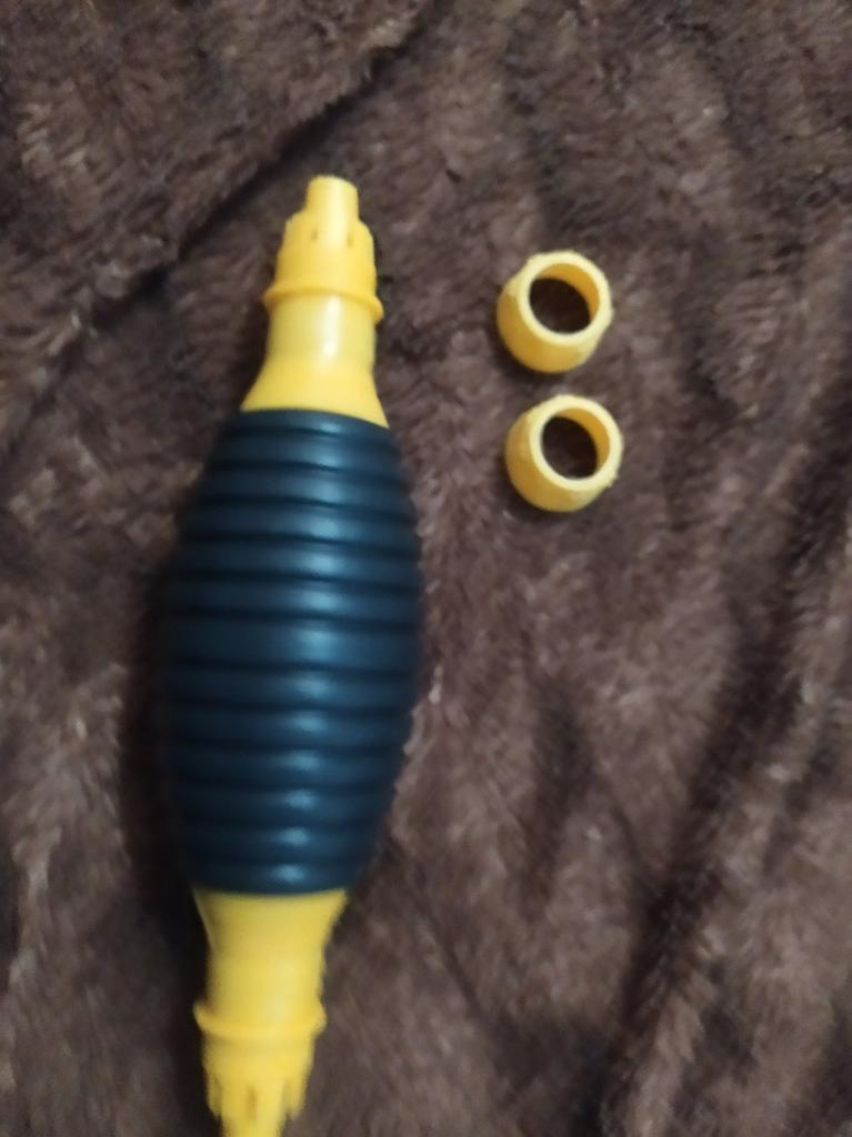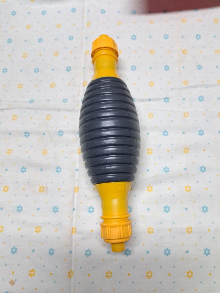Il bulbo non è di gomma, ma di plastica sottile (ho un'amara esperienza con la plastica), il tempo dirà per quanto tempo funzionerà, si assorbe bene, non so per quanto tempo funzionerà con il carburante