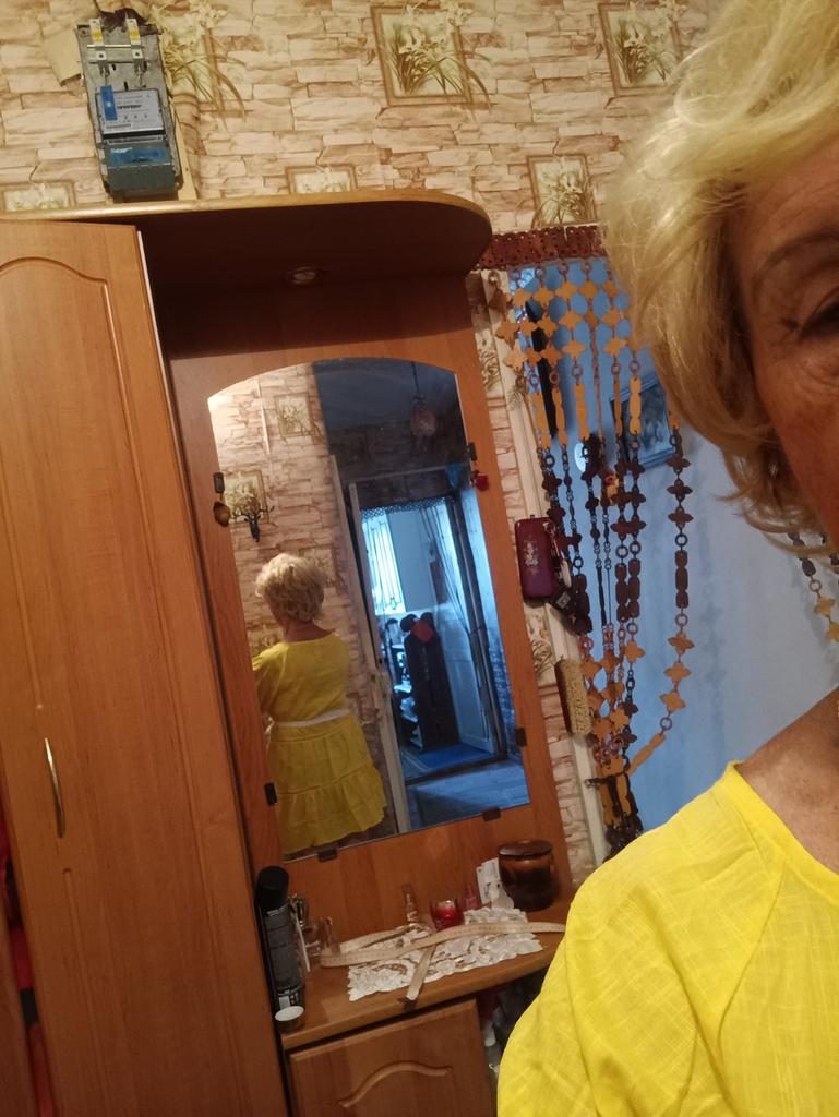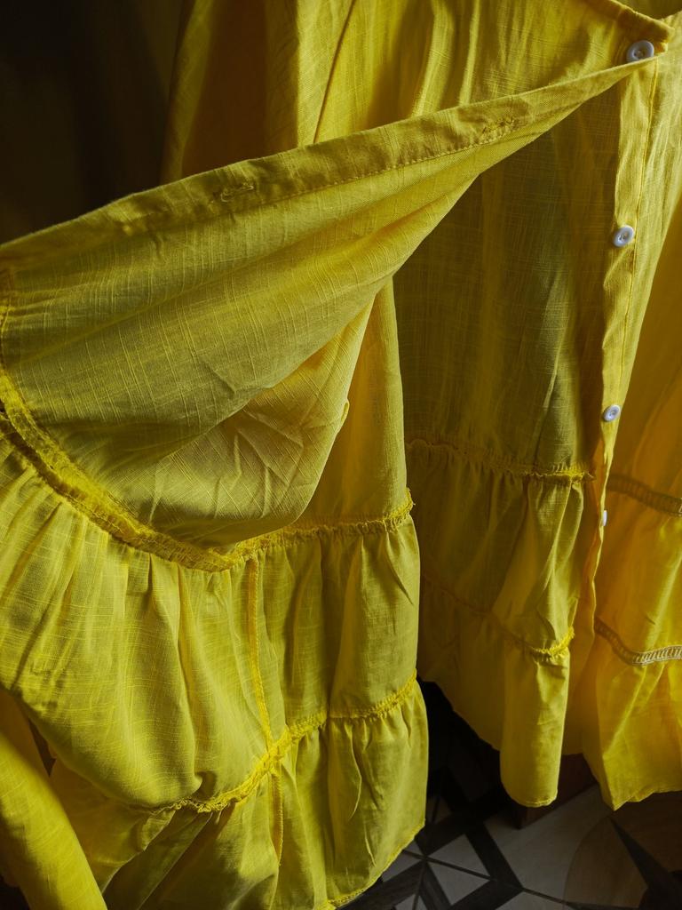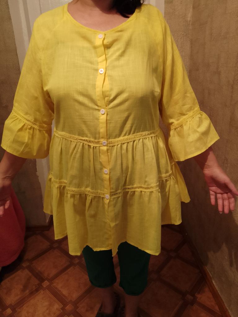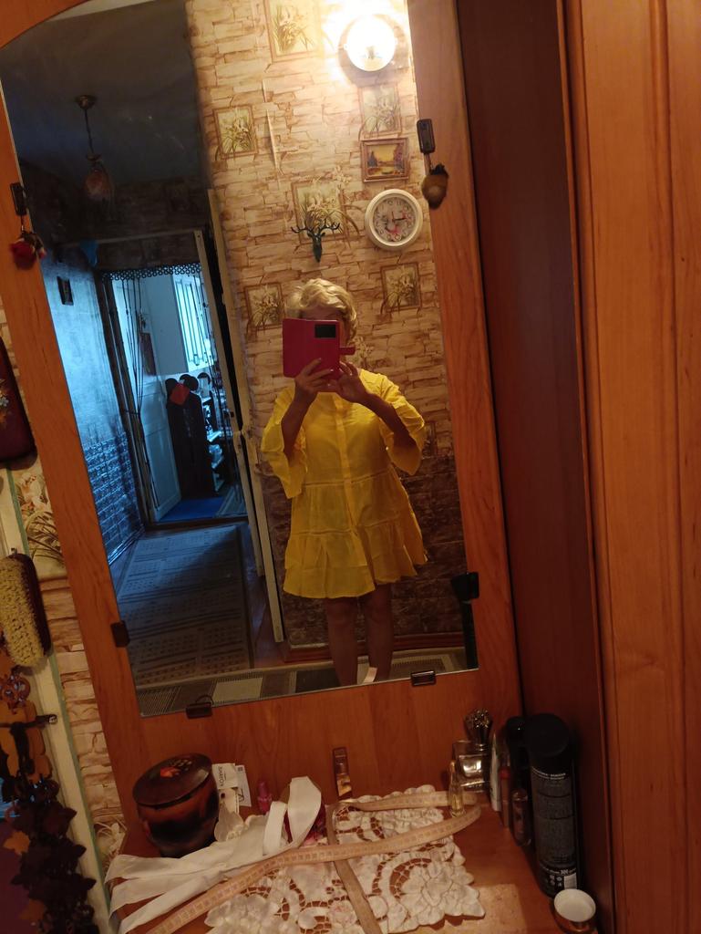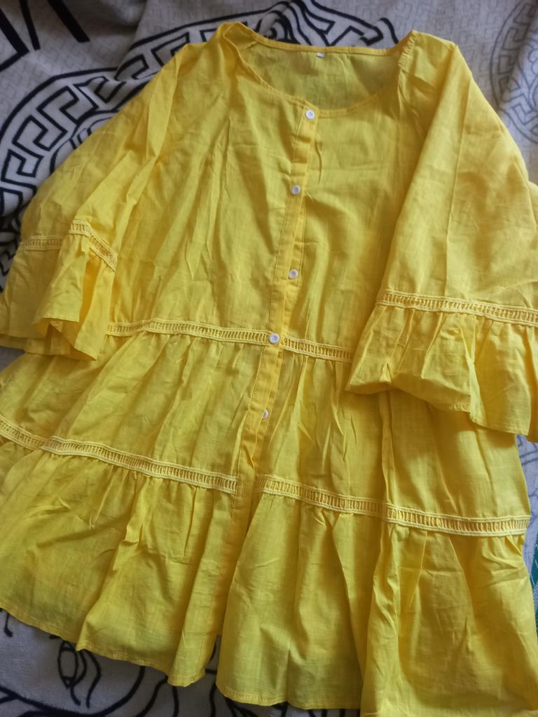 Nella foto sembra più interessante. Semplice/a. La tonalità di giallo è diversa. Per un vestito manca un po' di lunghezza, per una blusa è troppo lunga. Sta bene su una ragazza giovane e snella. Dalla S alla L, forse. Su di me sta un po' strano, anche se la taglia sembra giusta.