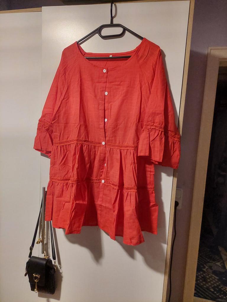 Troppo corto per donne alte più di 178 cm. Il colore è solo rosso, ma dopo il lavaggio nel programma di cura a 30 gradi....il colore è un rosa maiale codificato, o ancora meglio un motivo batik con rosso e rosa maiale e il materiale...beh, è così che funziona Sembra un sacco di stracci di lino tinto, la XXXL è troppo grande e troppo corta. Oh e dopo il lavaggio? Uno straccio con volant. Non raccomandato affatto.