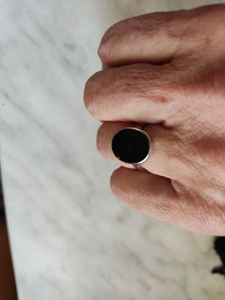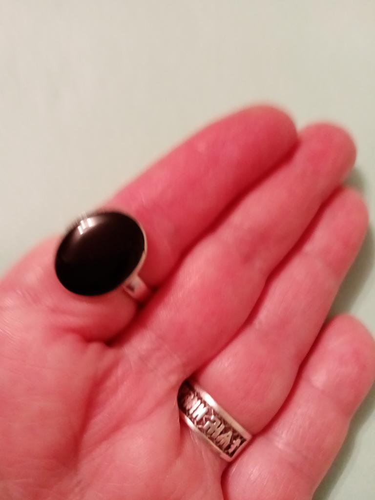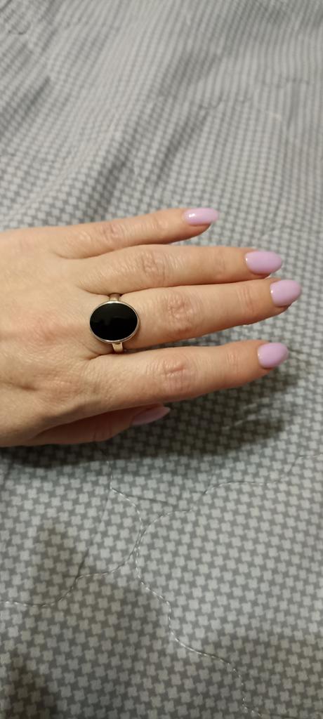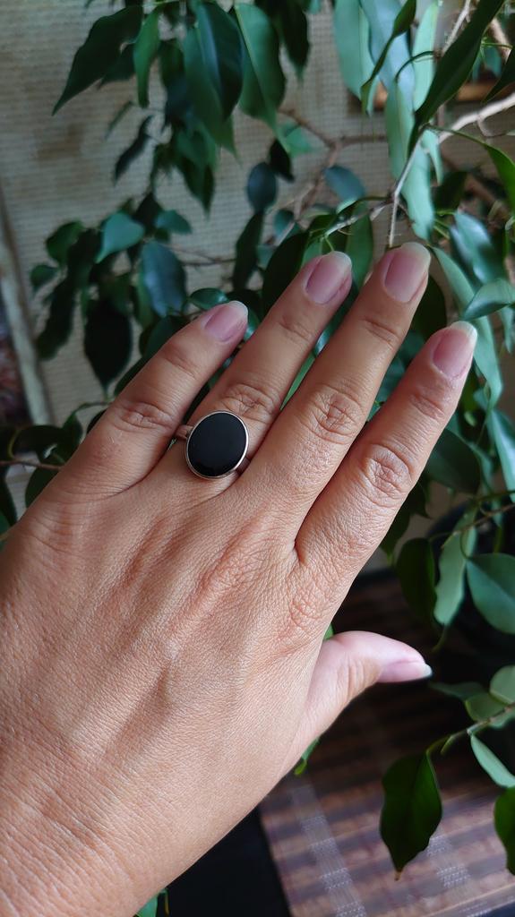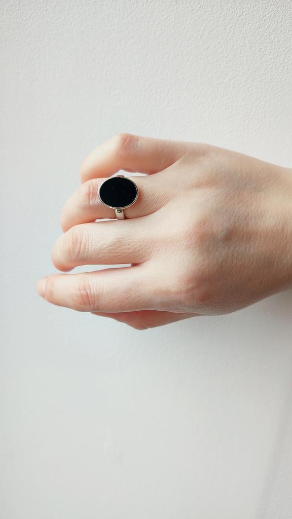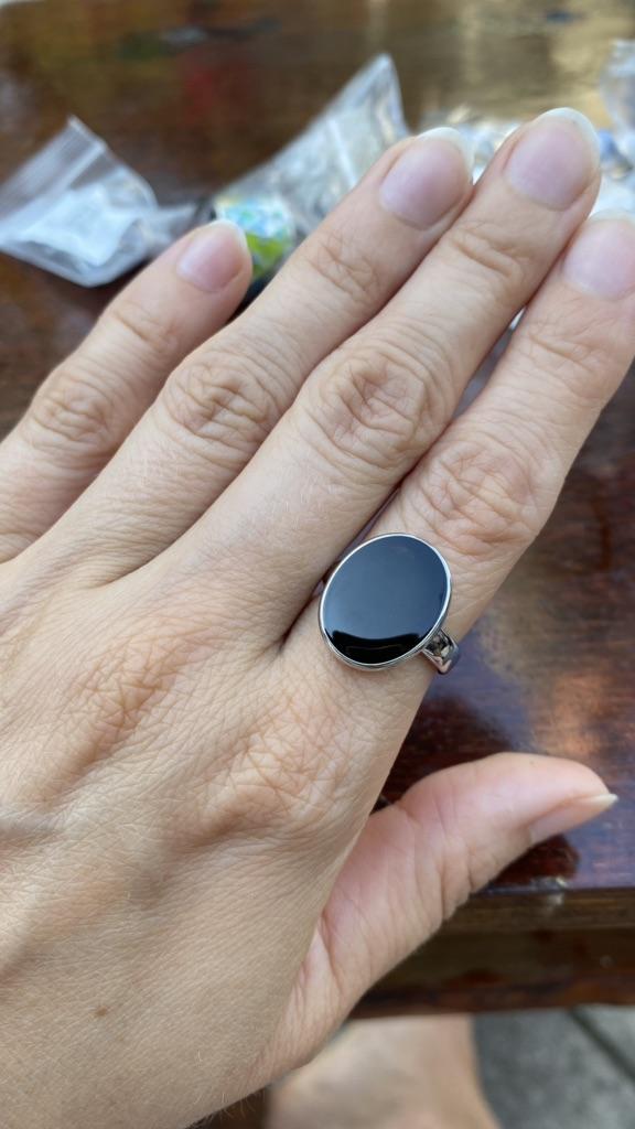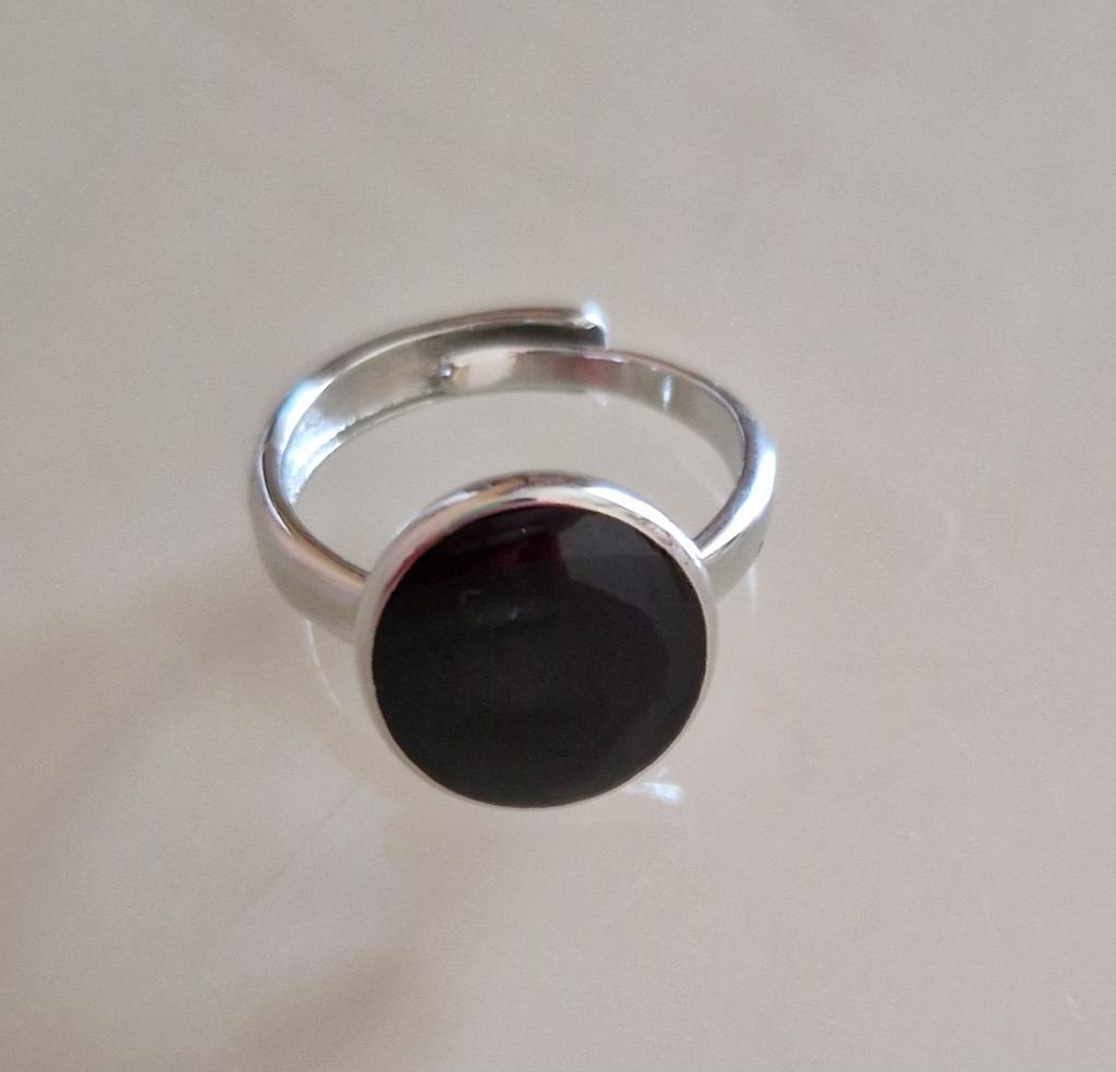 Interessante anello con smalto nero. La dimensione è regolabile. Carino. Mi raccomando ❤️