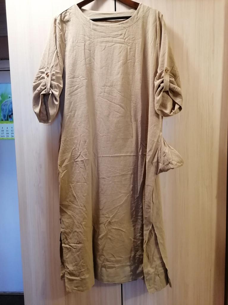 L'abito corrisponde alla tabella taglie, veste la mia taglia 50-52, ma si può prendere una taglia in più, ottima lunghezza, maniche a 3/4 e si può alzare anche, ci sono tasche interne ai lati e spacchi sotto, colore sabbia , Decorerò con gioielli, lo consiglio