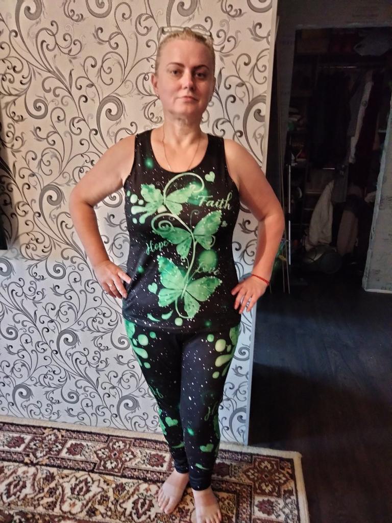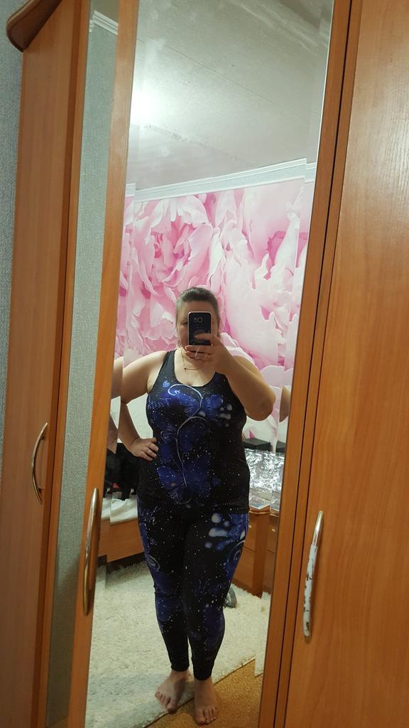 Bel completo. Sono già andata all'allenamento. La canottiera è ampia, mentre i pantaloni sono attillati. Il disegno è bello.