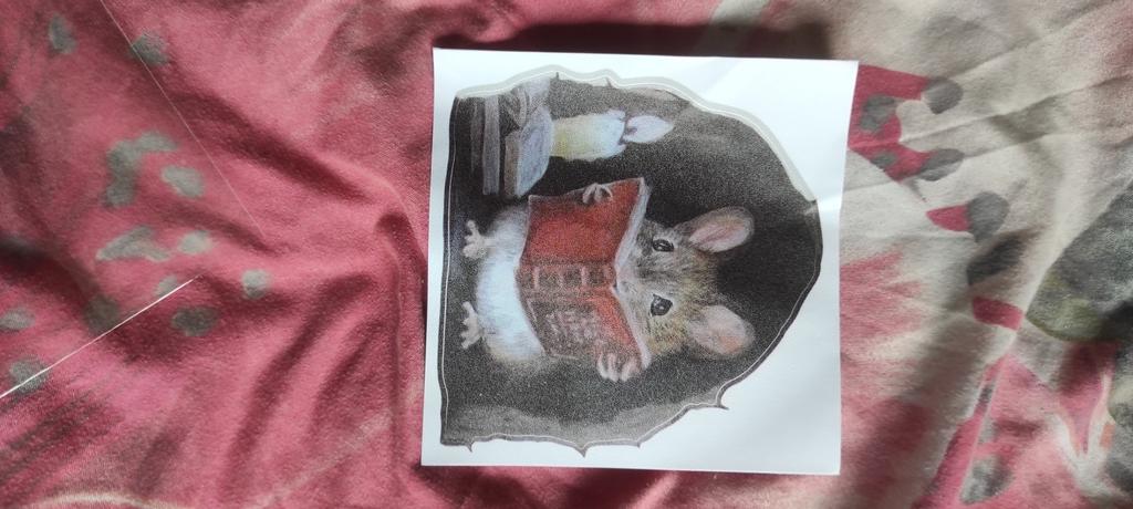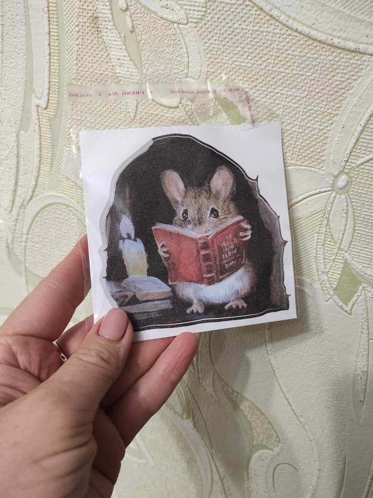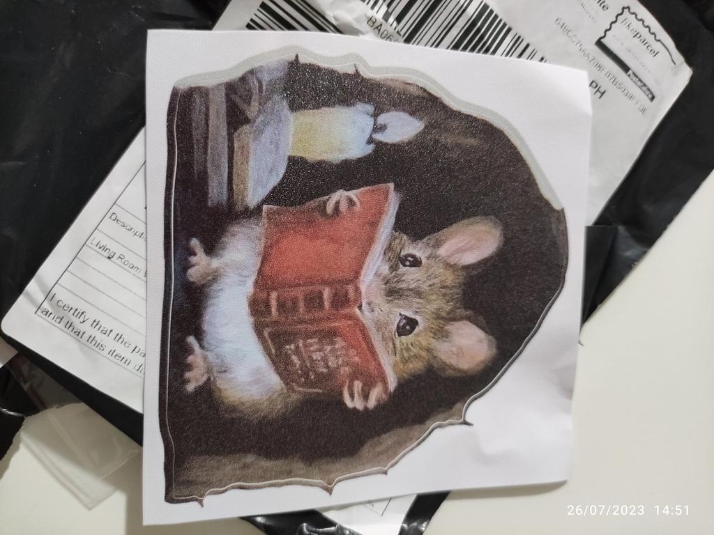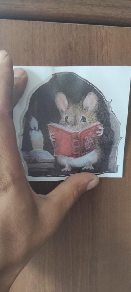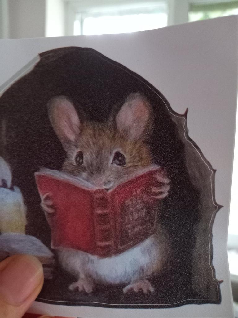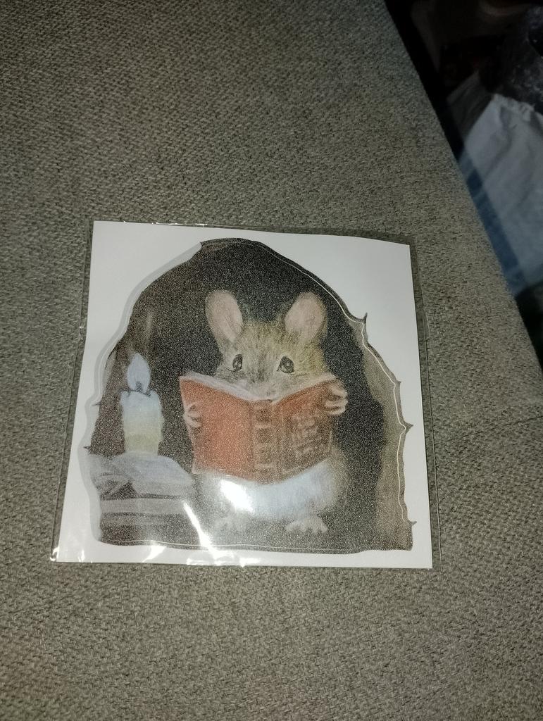 È carino, un topo, che legge 🙂. È arrivato ben confezionato, facile da incollare. Sono soddisfatto.