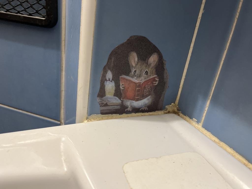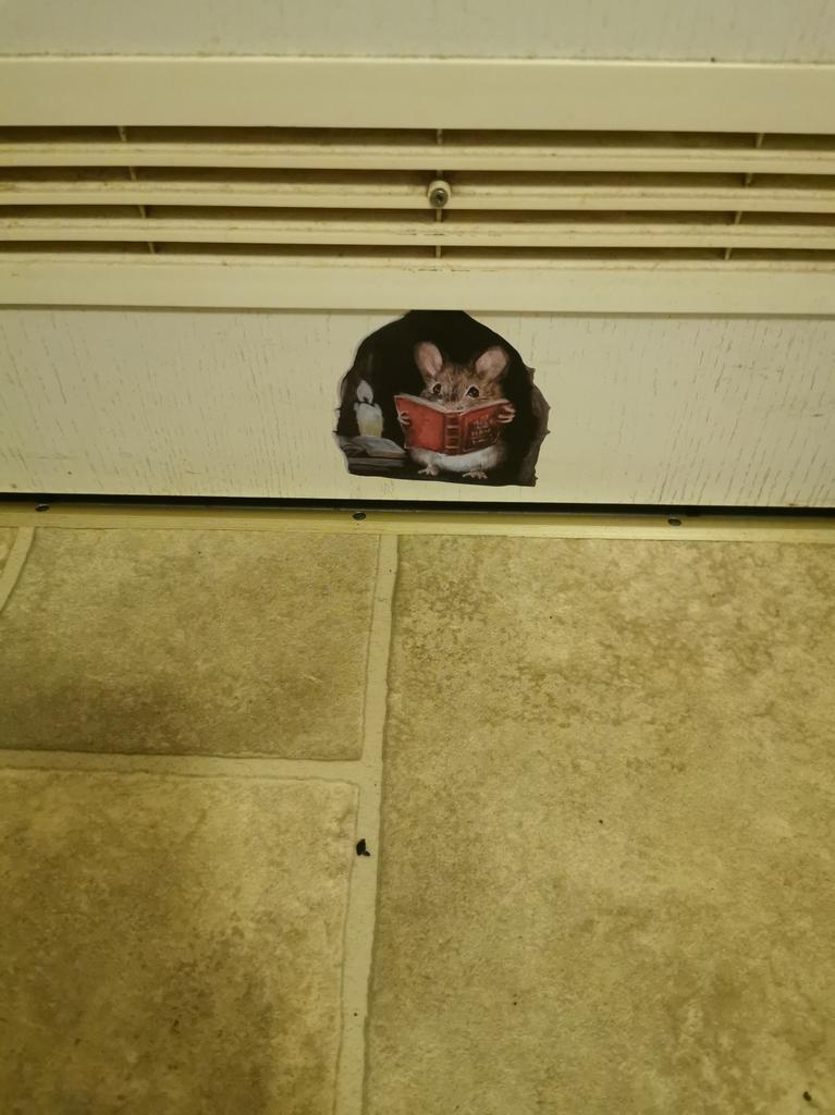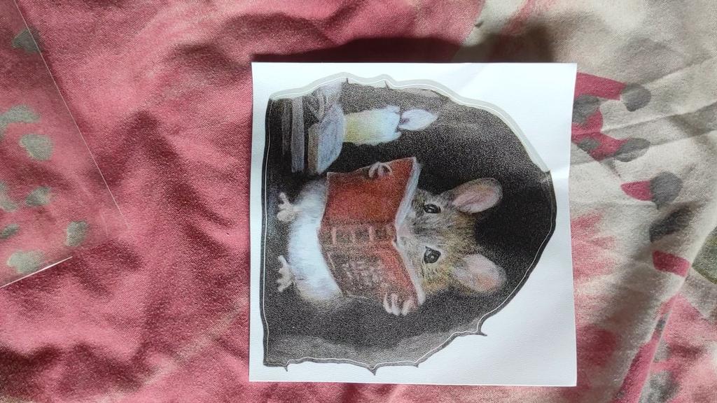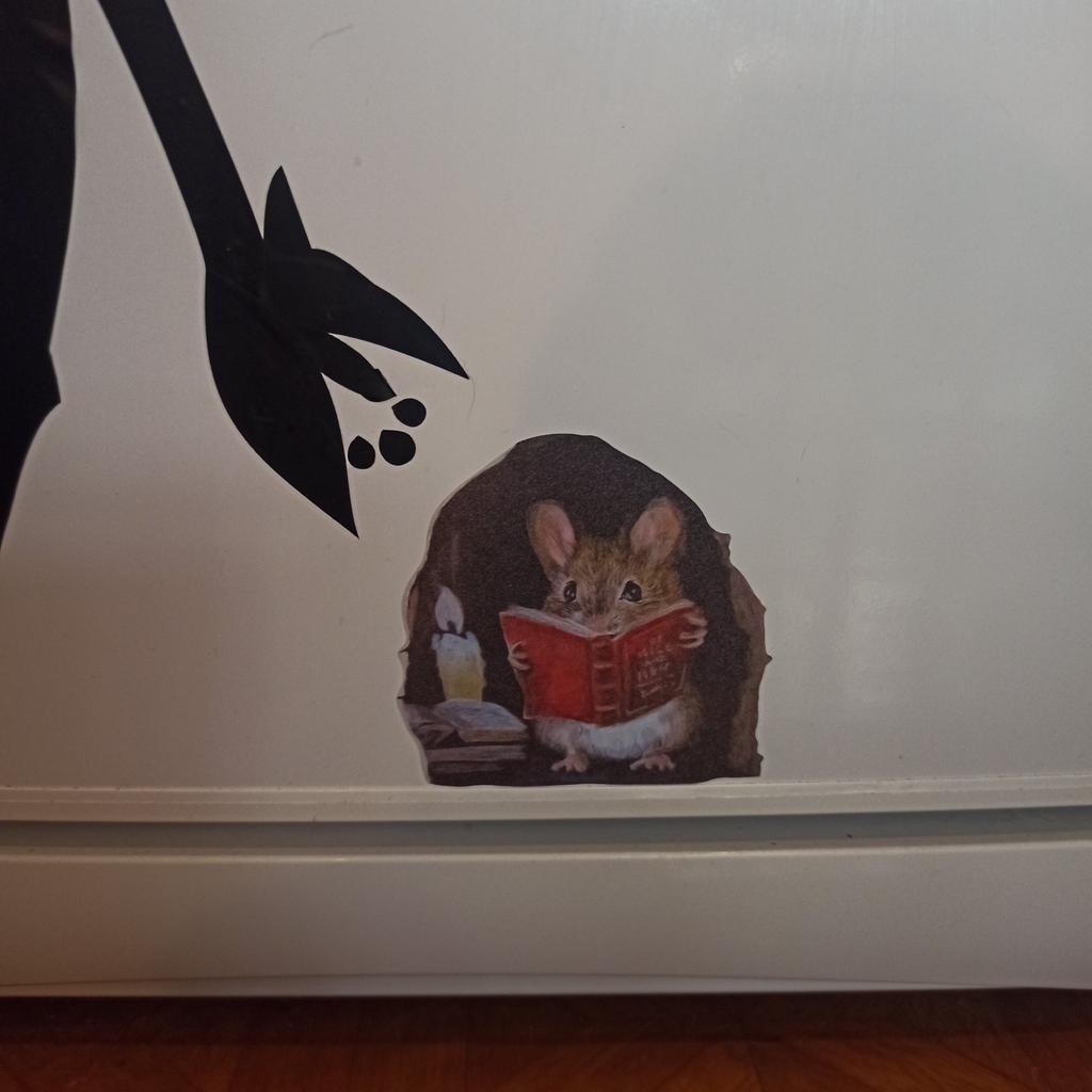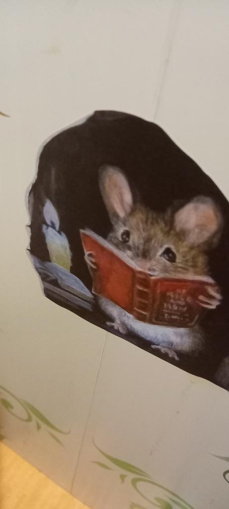 È carino, un topo, che legge 🙂. È arrivato ben confezionato, facile da incollare. Sono soddisfatto.
