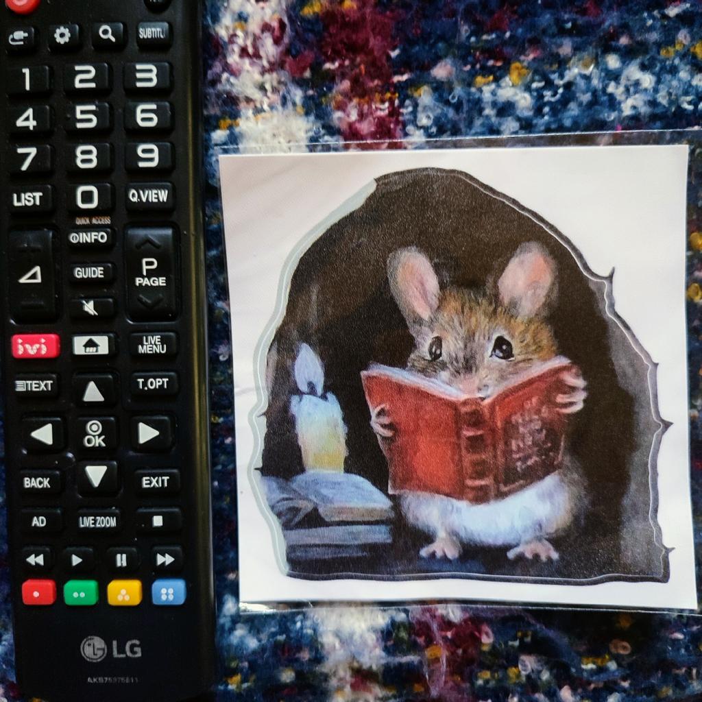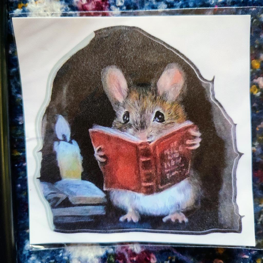 Un simpatico adesivo raffigurante un buffo topolino che tiene in mano un libro.