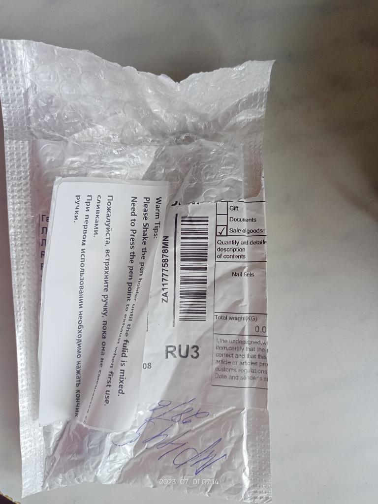 Ricevuto intatto, ottimo smalto gel pennarello, stesura molto sottile, il colore è saturo, non trasparente, asciuga molto velocemente e non si attacca, ottimo 👌👍👍👍colore viola