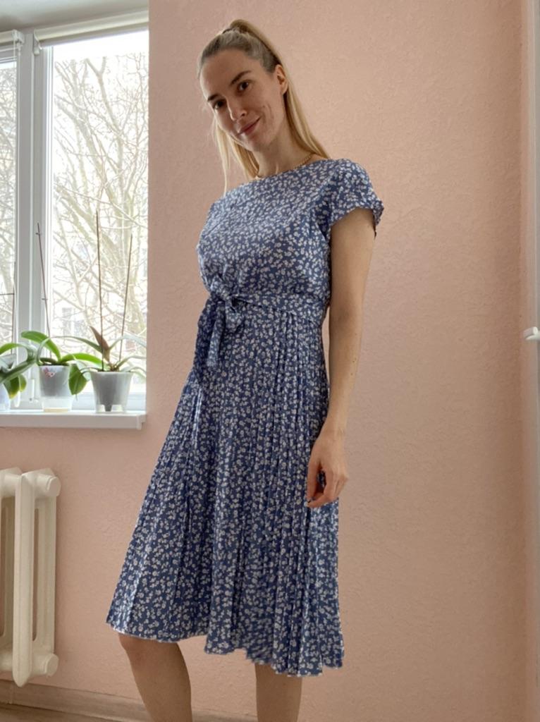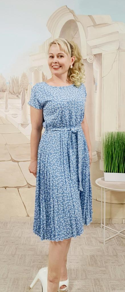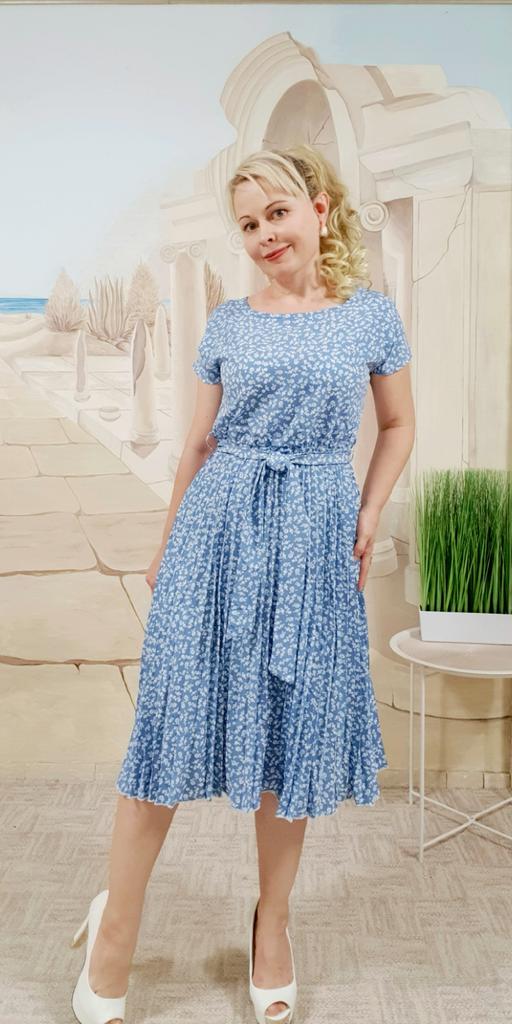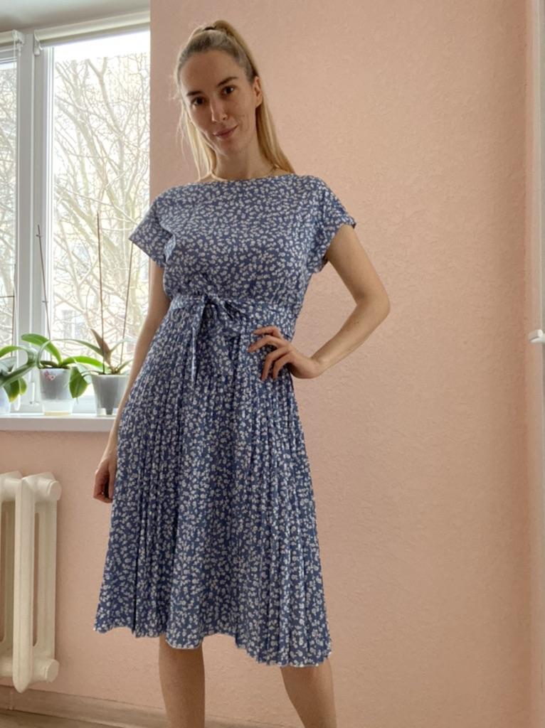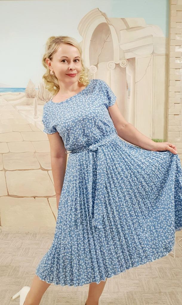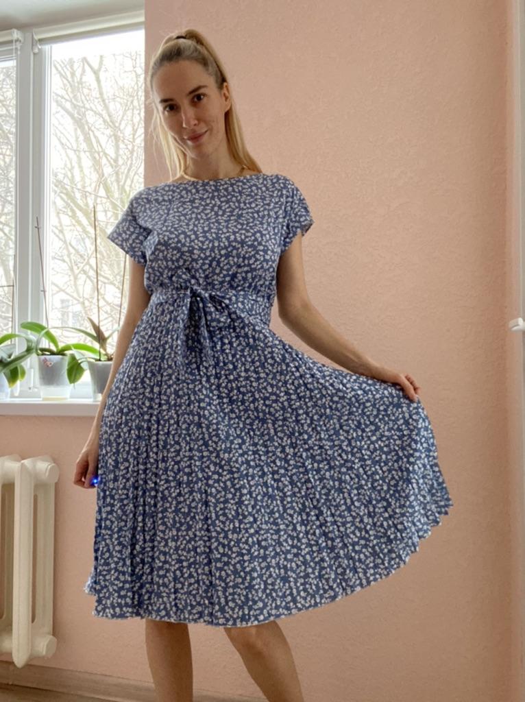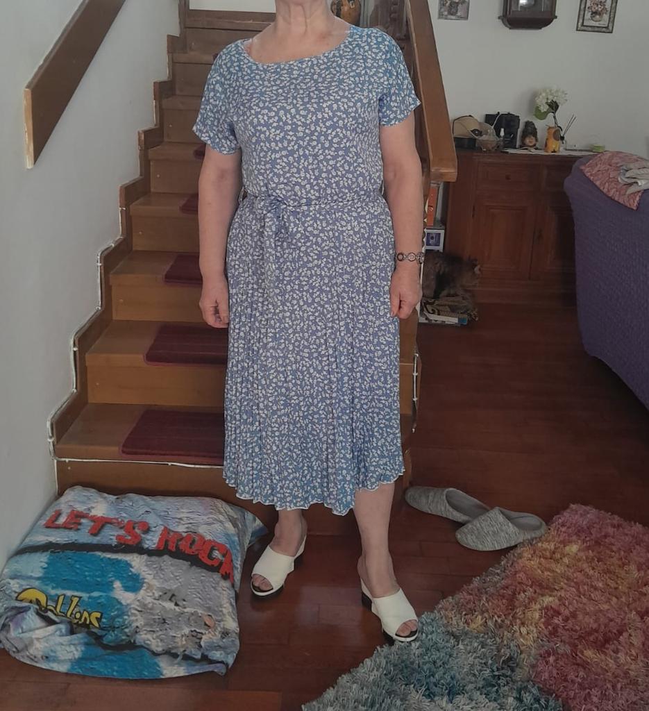 Il vestito è carino, ma non mi è andato bene per la taglia, veste piccolo. Ho preso la taglia 52-54. La fantasia è bella, azzurro tenue a fiorellini bianchi, la gonna è plissettata, lo scollo è ampio, dovrà essere leggermente stretto sulle spalle perché si vedono gli spallini del reggiseno. L'ho regalato a mia sorella, che porta la taglia 48. A chi ha una figura senza pancia lo consiglio. Con la pancia non starà bene.