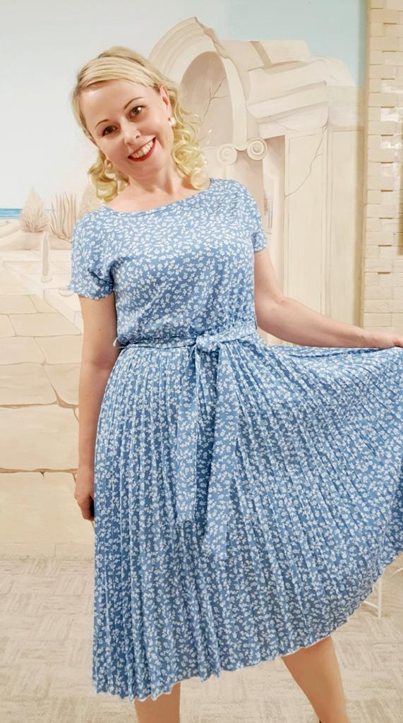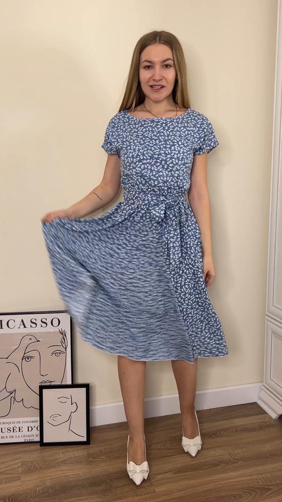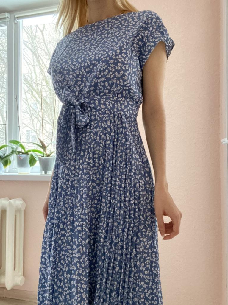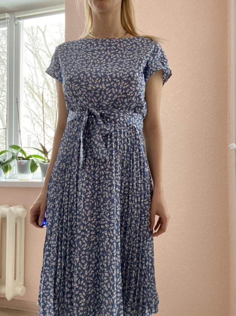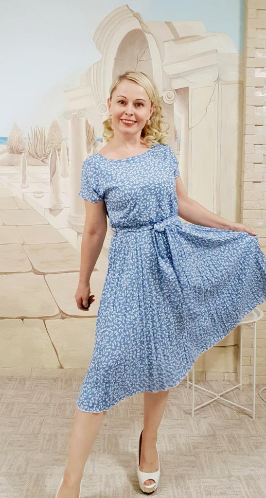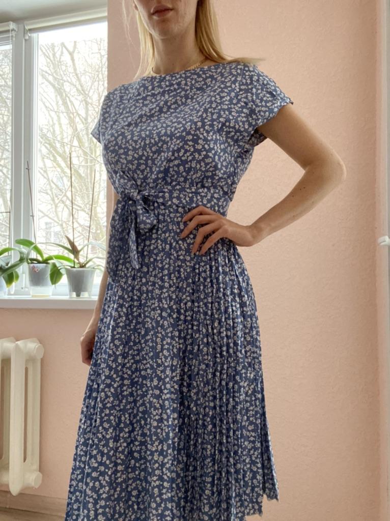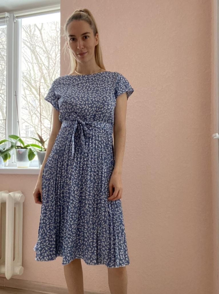 Il vestito è carino, ma non mi è andato bene per la taglia, veste piccolo. Ho preso la taglia 52-54. La fantasia è bella, azzurro tenue a fiorellini bianchi, la gonna è plissettata, lo scollo è ampio, dovrà essere leggermente stretto sulle spalle perché si vedono gli spallini del reggiseno. L'ho regalato a mia sorella, che porta la taglia 48. A chi ha una figura senza pancia lo consiglio. Con la pancia non starà bene.