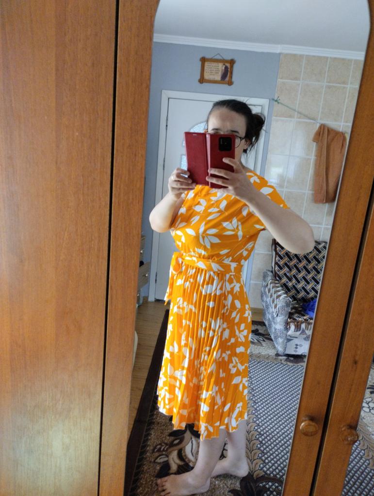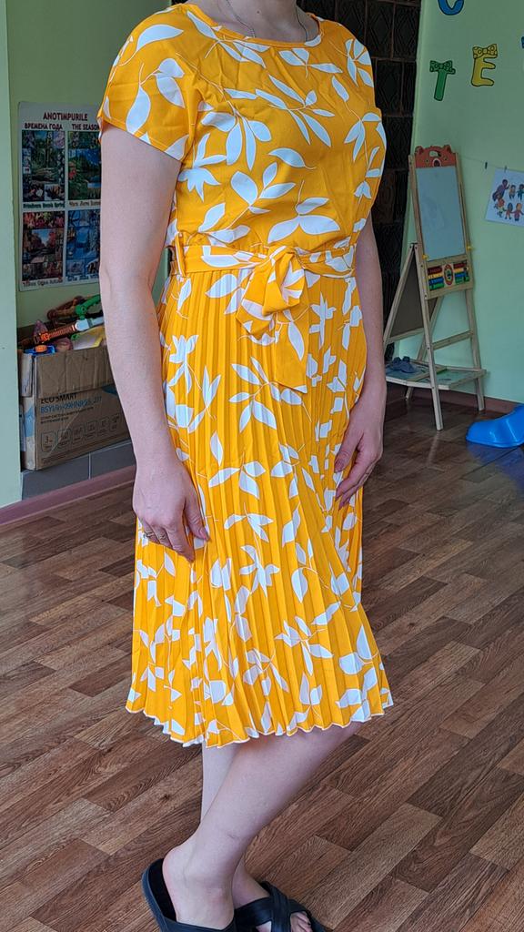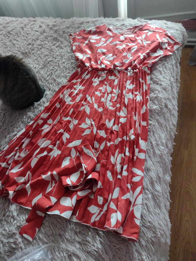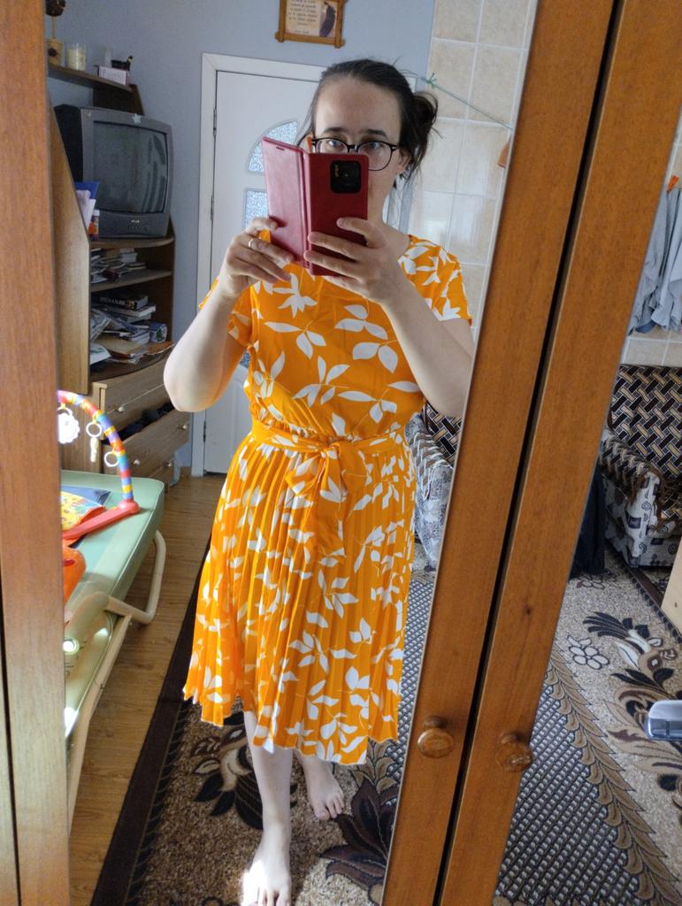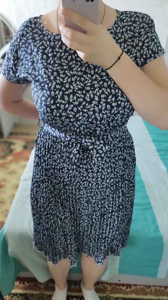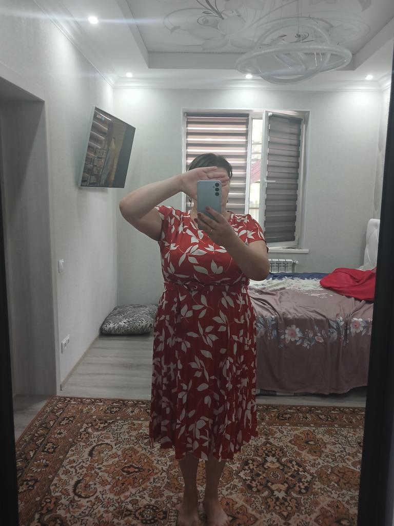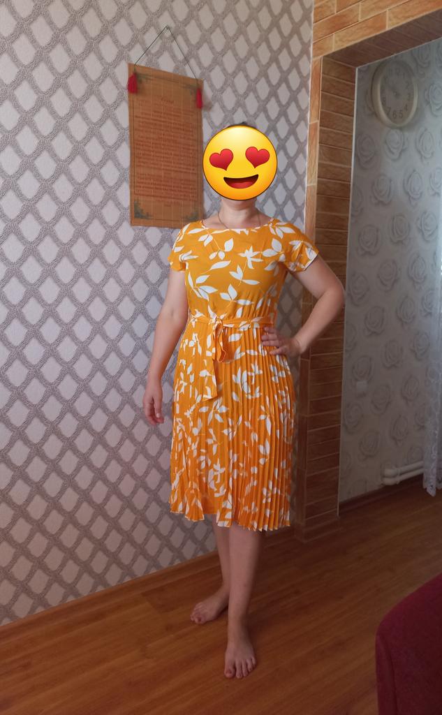 L'abito è realizzato in materiale sintetico sottile, ma piacevole al tatto, la gonna dell'abito è arrivata ben sgualcita., durante la stiratura, la "piega" ha cominciato ad appianarsi, cioè col tempo, capisco, scomparirà. Danno! Ecco perché tolgo una stella. Un vestito per tutti i giorni. La mia taglia è 48-50, ho ordinato la XXL ed ero preoccupata che fosse grande, ma grazie alle recensioni non ho perso.