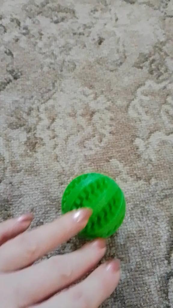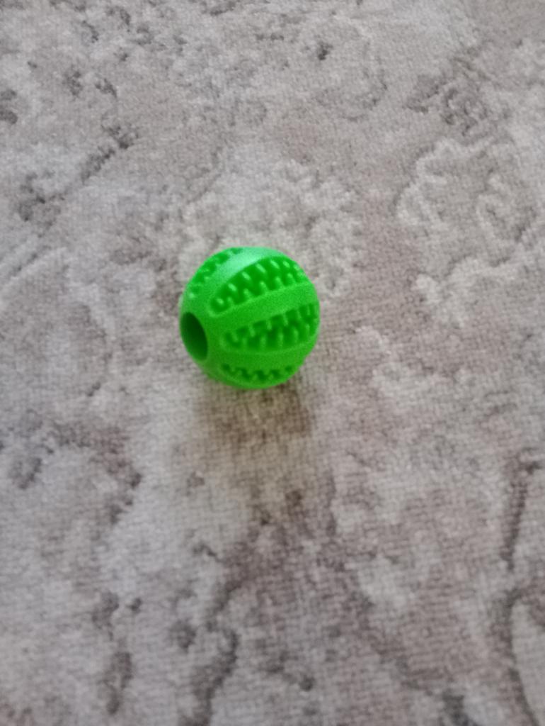 Una palla di gomma molto bella per un cane. Il colore non è lo stesso, verde traffico. Di piccole dimensioni, non leggero, può essere masticato e giocato, rotola e salta bene, adatto ai giochi. Il mio Jack Russell Terrier lo ha apprezzato. Raccomando!