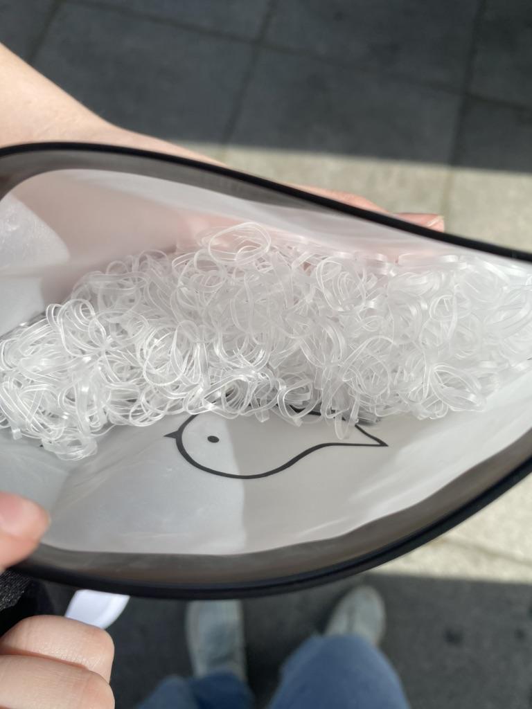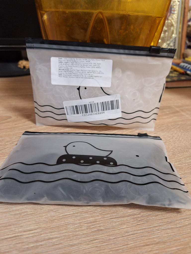 Grazie al venditore e a Juma per questo set di elastici! Mia figlia ha i capelli lunghi e folti, TOP per acconciature complicate! Ho ordinato quelli trasparenti, è tutto integro, la borsa tiene saldamente gli elastici in pila, è comodo prenderli. Un po' più piccolo di quanto sembrasse in foto, ma robusto ed elastico. Altamente raccomandato!