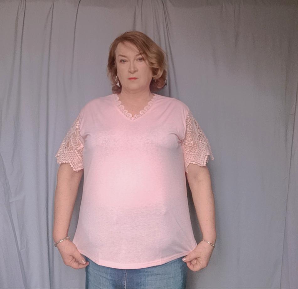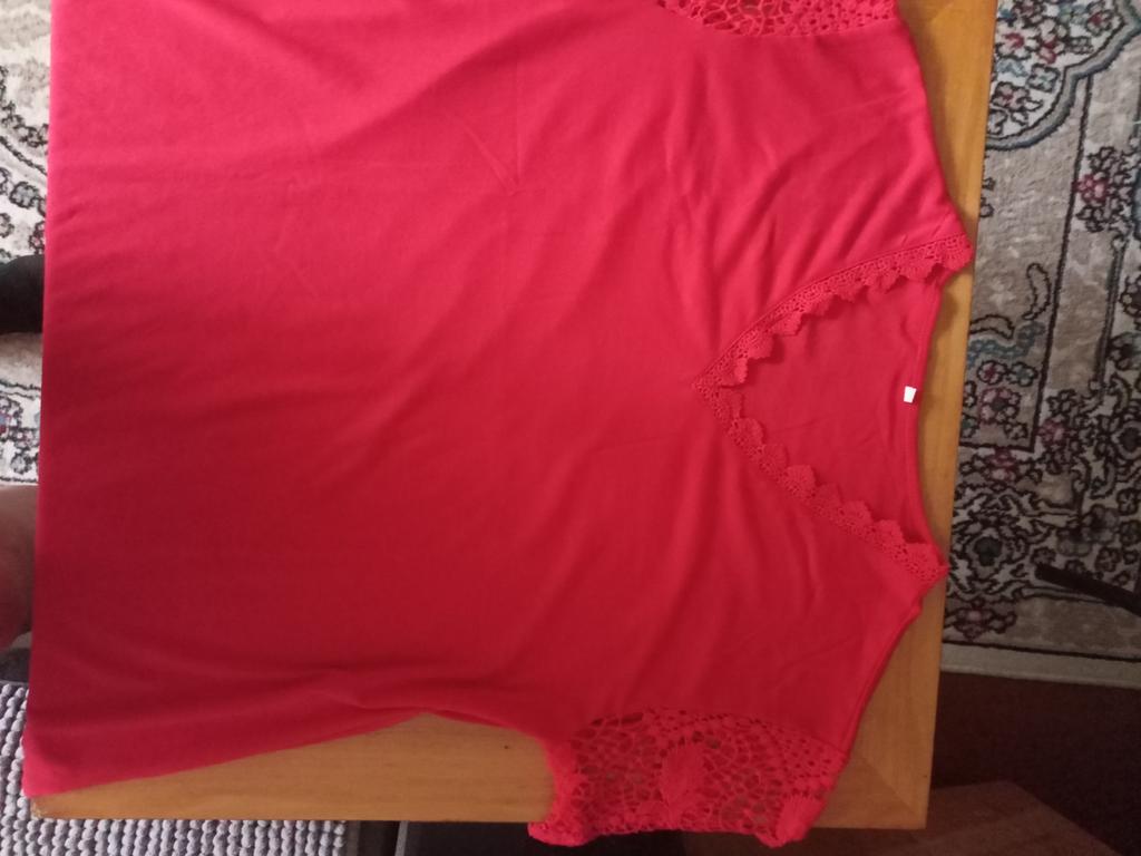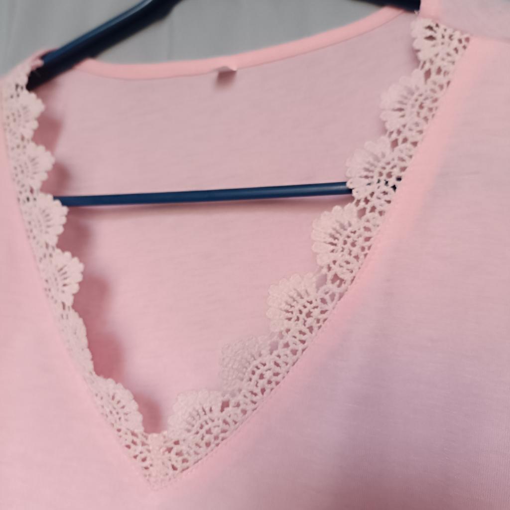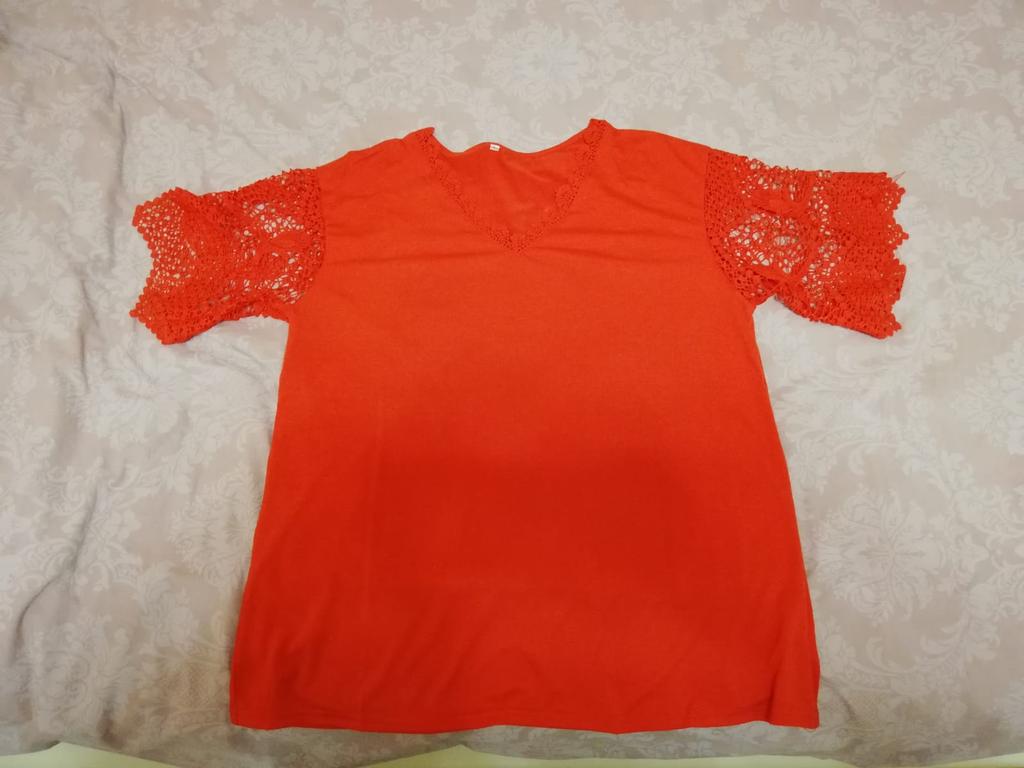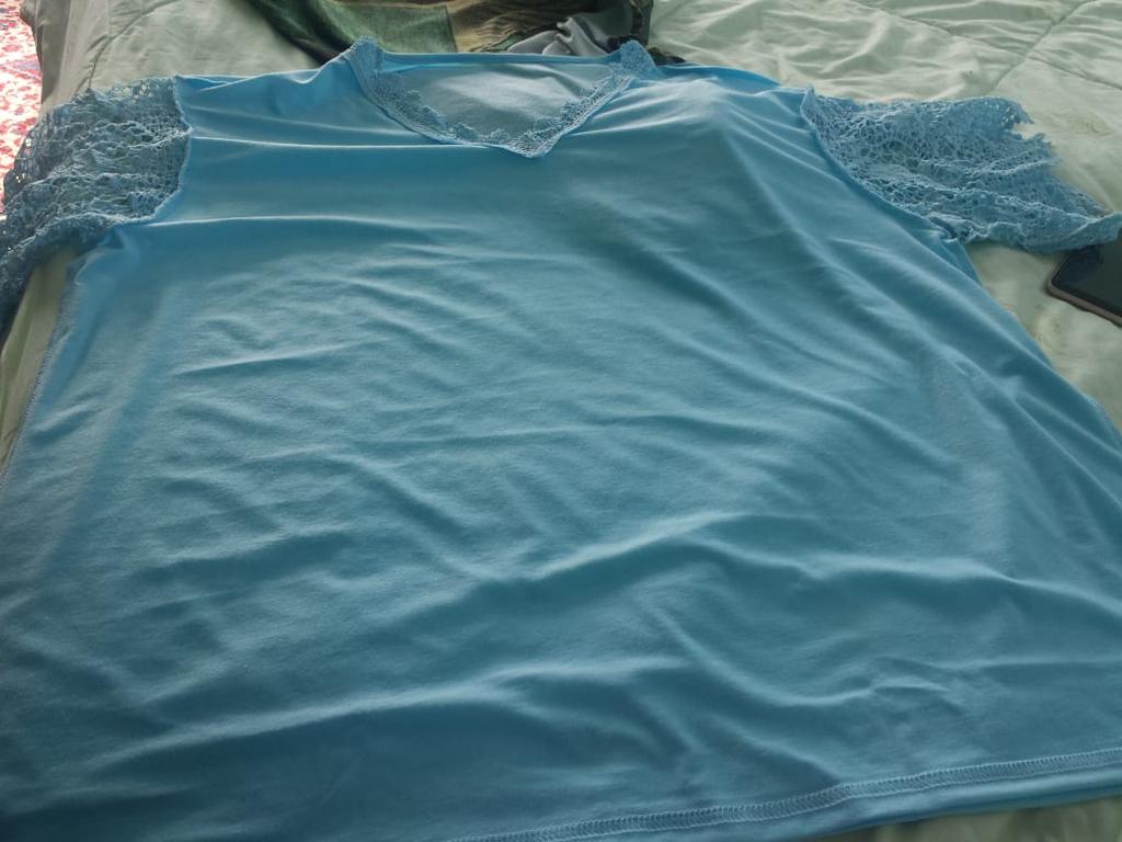 T-shirt molto bella con scollo a V, pizzo, così come le maniche, sono magnifiche. La finitura non è ben rifinita perché ci sono piccoli fili ovunque ma niente di grave che possa essere risolto facilmente. Senza etichetta! Lo laverò quindi a 30° e non andrò in asciugatrice. Consegna in 20 giorni.