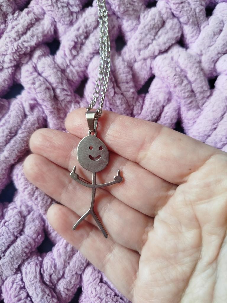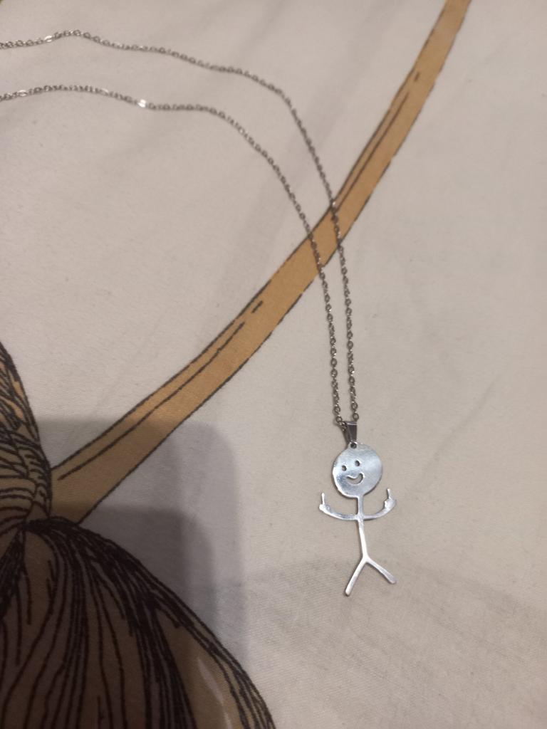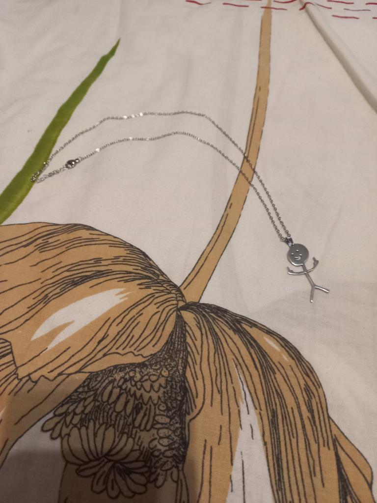 Un'idea interessante, ma l'esecuzione lascia margini di miglioramento. Il ciondolo non corrisponde alle dimensioni indicate, l'uomo è più piccolo e la catena misura 42 cm, inoltre è stata assemblata da sezioni separate, le maglie di collegamento sono attorcigliate, quindi l'intera catena è attorcigliata e sembra trasandata.