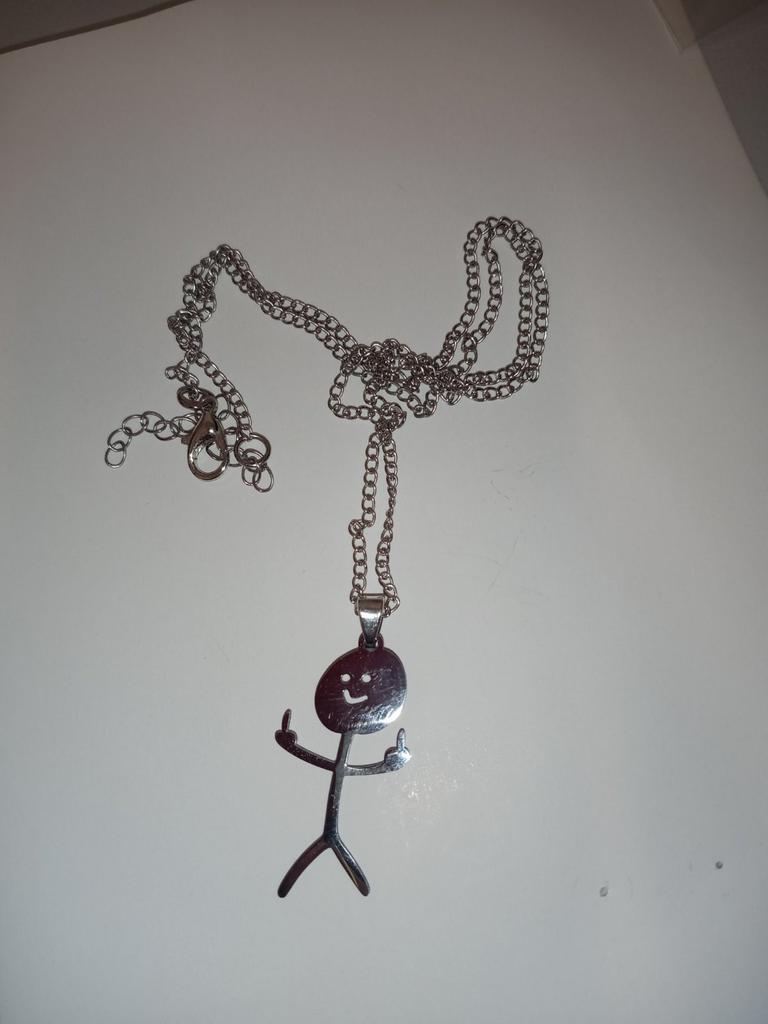 Il ciondolo è lungo circa 2 cm (non l'ho misurato) e il dito medio dell'omino stilizzato è visibile se sei abbastanza vicino alla persona che lo indossa. L'ho comprato come regalo per un adolescente e gli è piaciuto moltissimo, ovviamente!